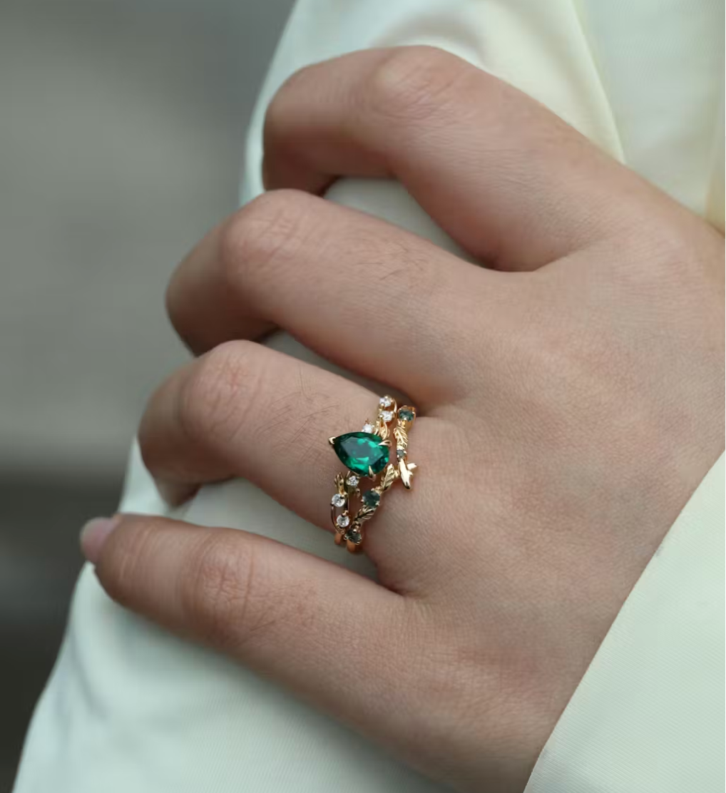 Nature Inspired Pear Cut Lab Green Sapphire Engagement Ring Set 2pcs - Hortense