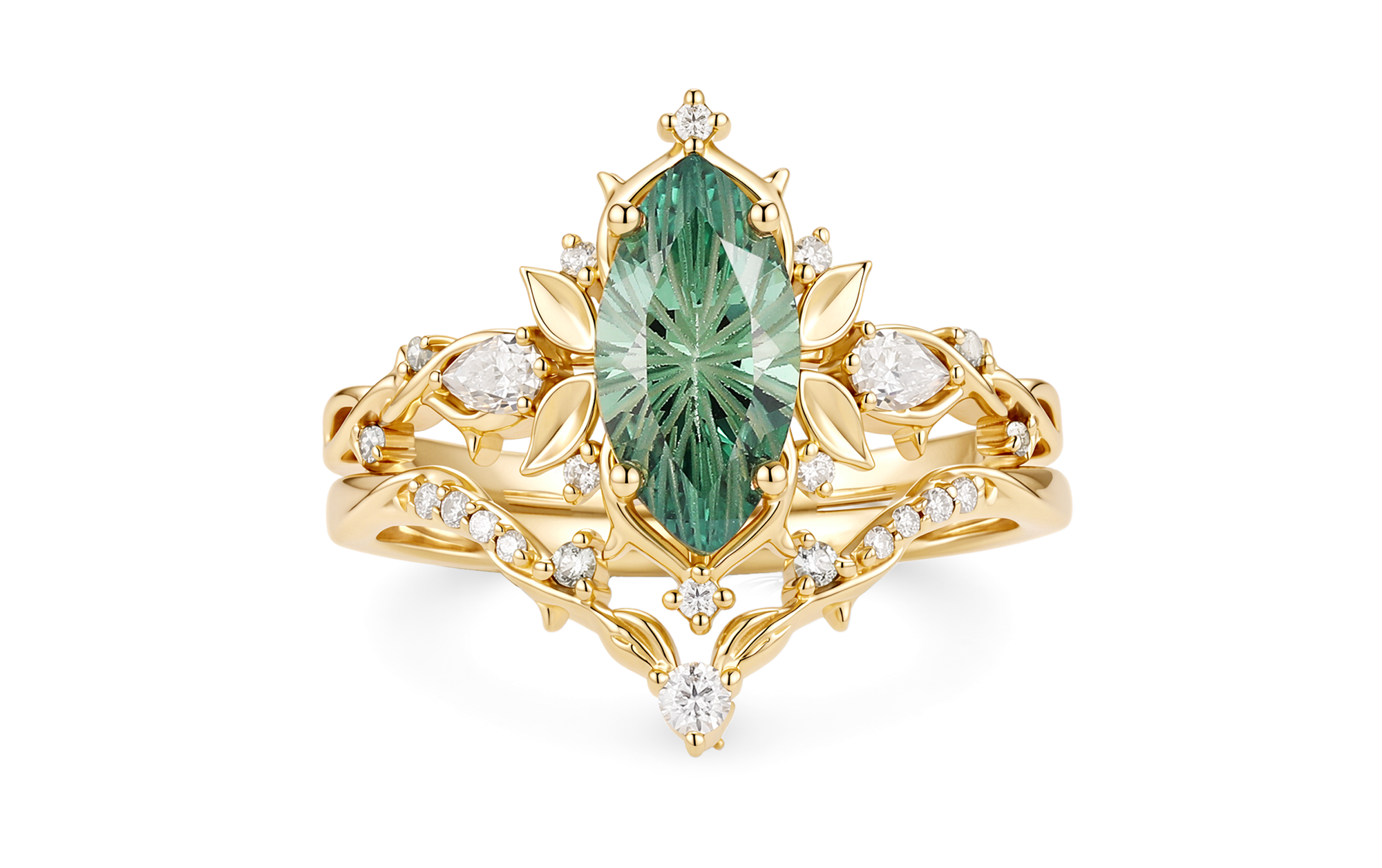 Forest Fairy Marquise Firework Cut Green Sapphire Leafy Inspired Bridal Set 2pcs - Felicity