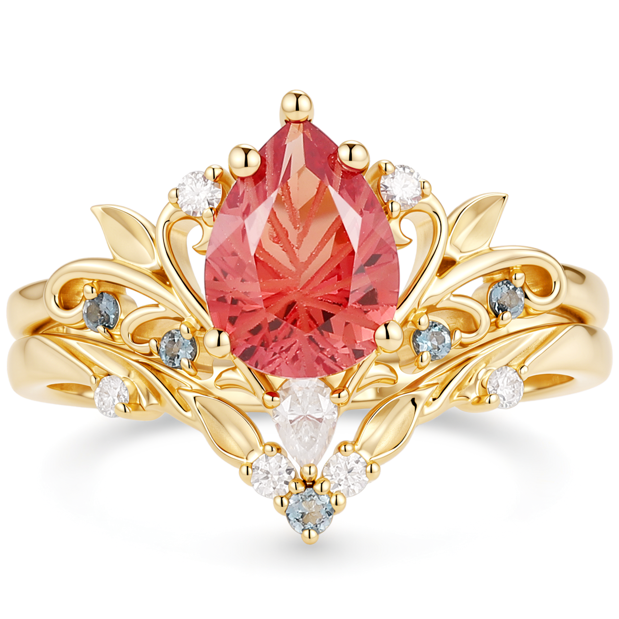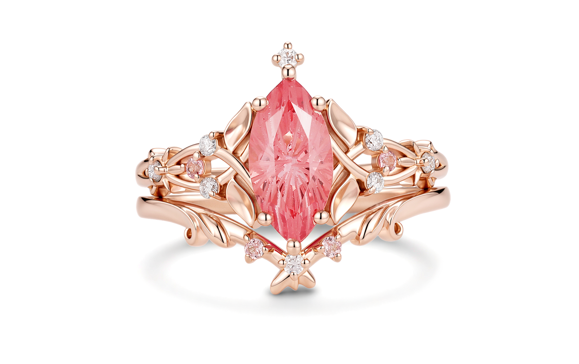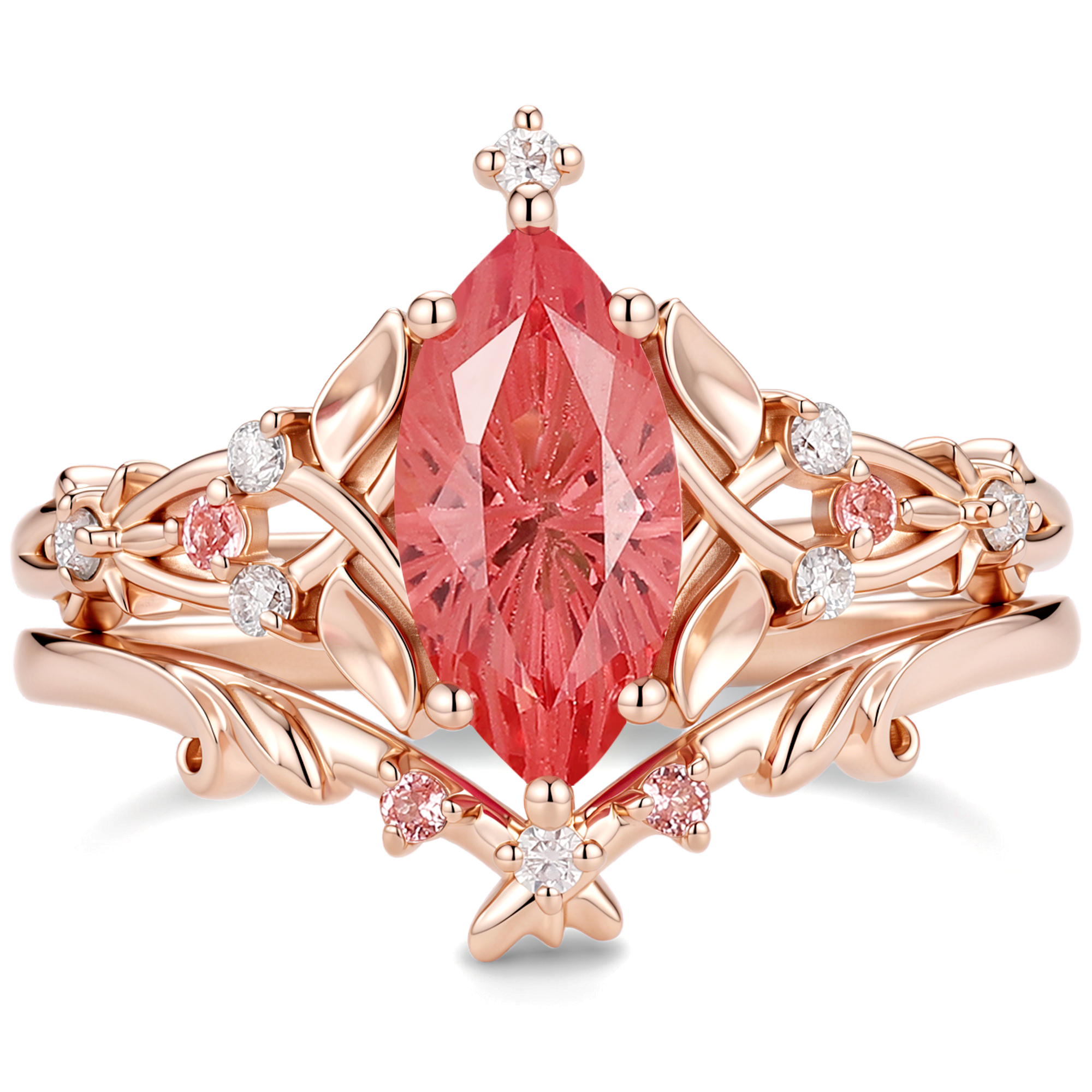 Jasmine - Firework Cut Pink Padparadscha Sapphire Leaf Ring Bridal Set 2PCS