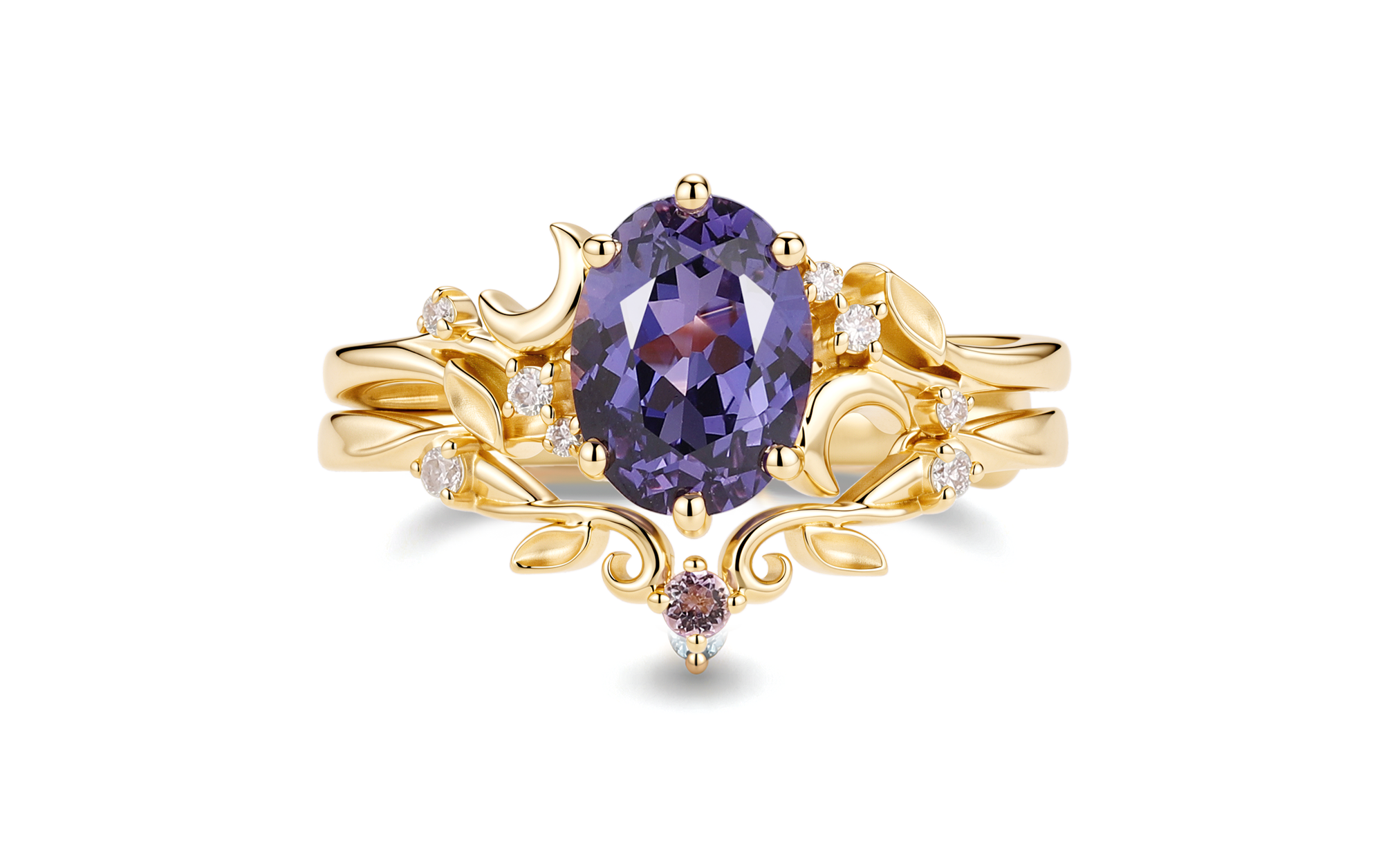 Melia - Firework Cut Alexandrite Moon Nature Inspired Engagement Ring Set 2pcs