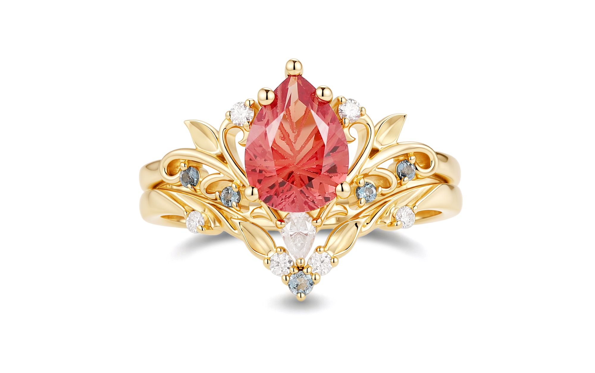Hortense - Leaf Nature Inspired Firework Cut Padparadscha Sapphire Engagement Ring Set 2pcs