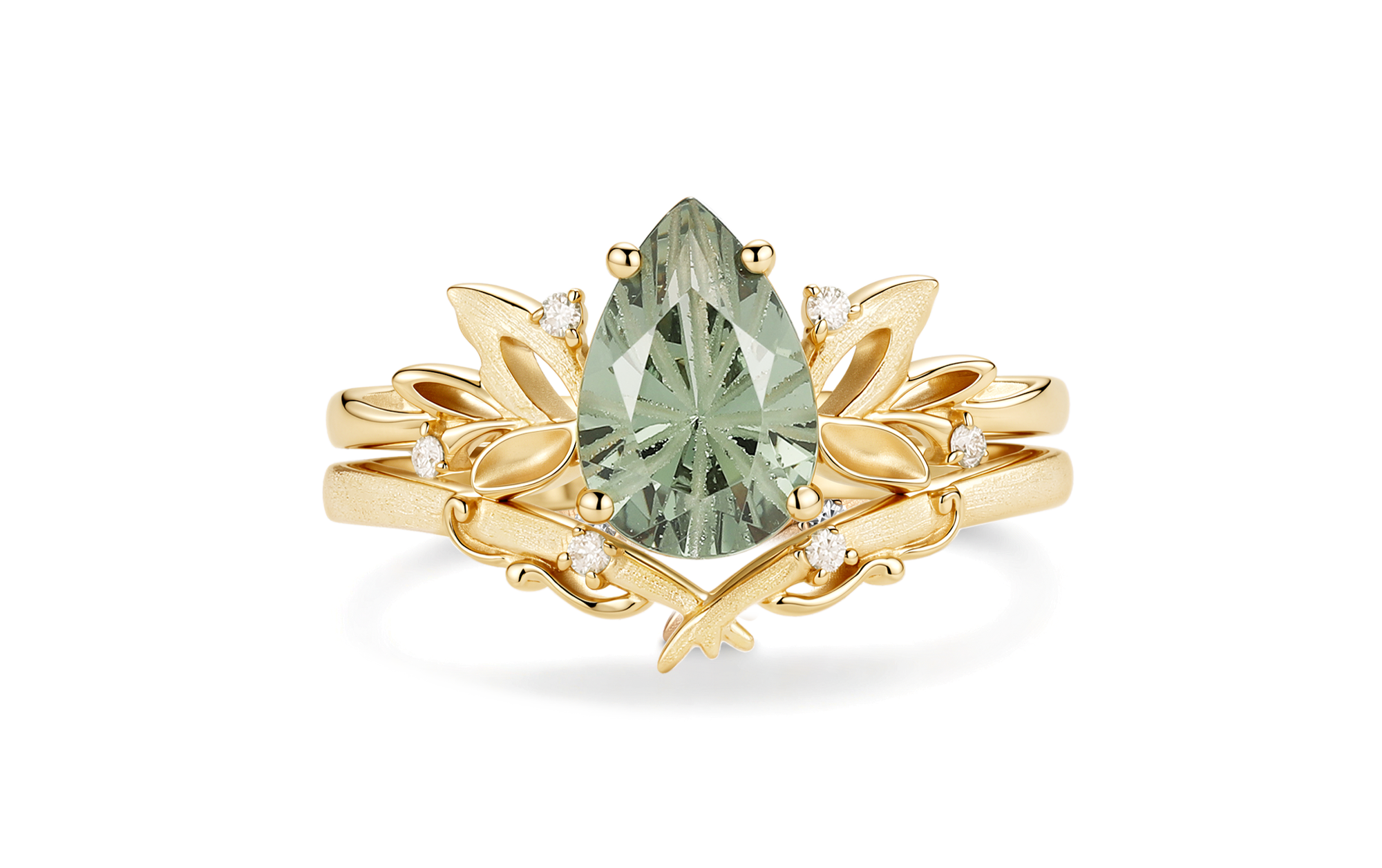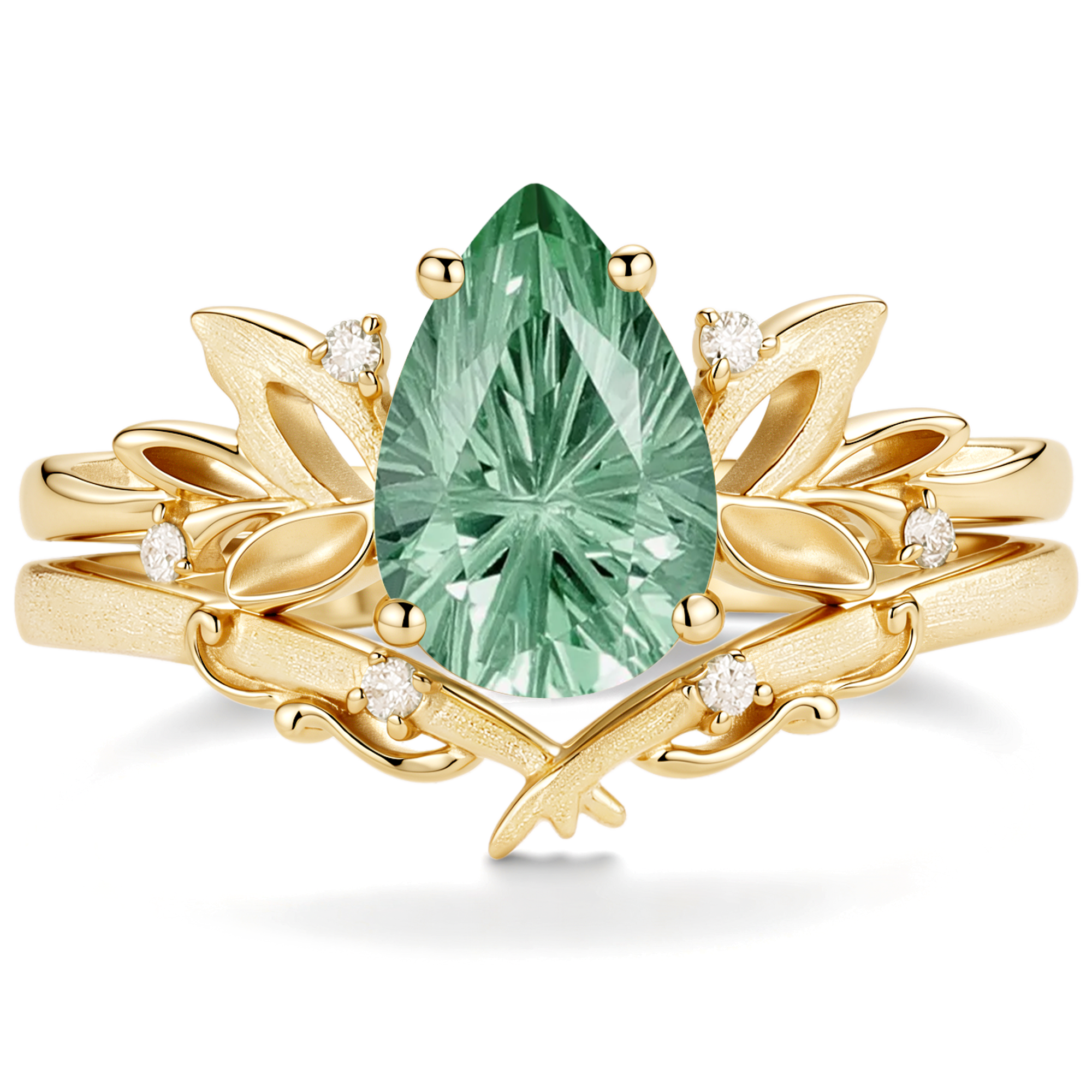 Leafy Inspired Pear Cut Green Sapphire Ring Bridal Set 2pcs - Belinda