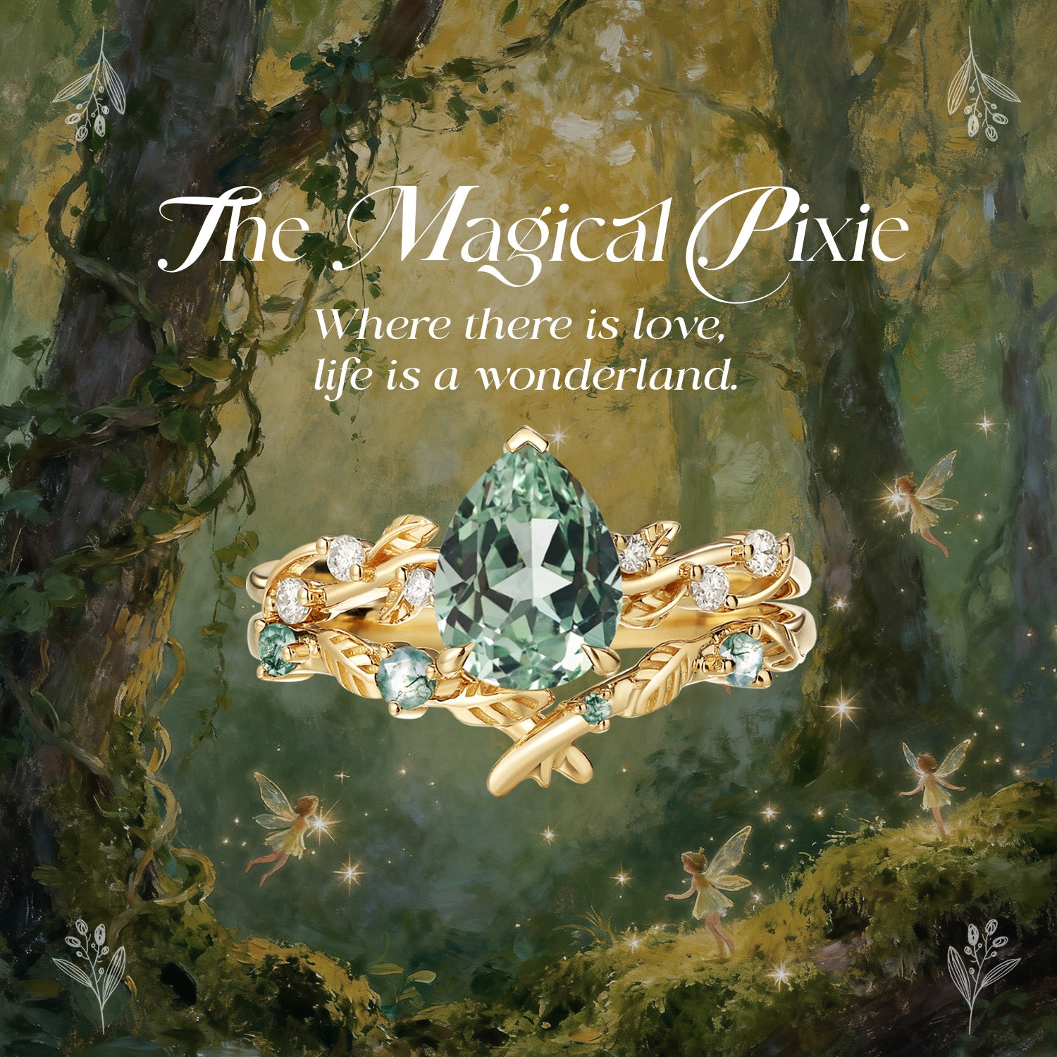 The statement ring stars a pear-cut lab-grown green sapphire—deep as an emerald forest, glowing with fire that dances like sunlight through oak branches. Its curves whisper promises of “forever,” while the band, carved with delicate leaf veins, feels like lace woven from moonbeams.