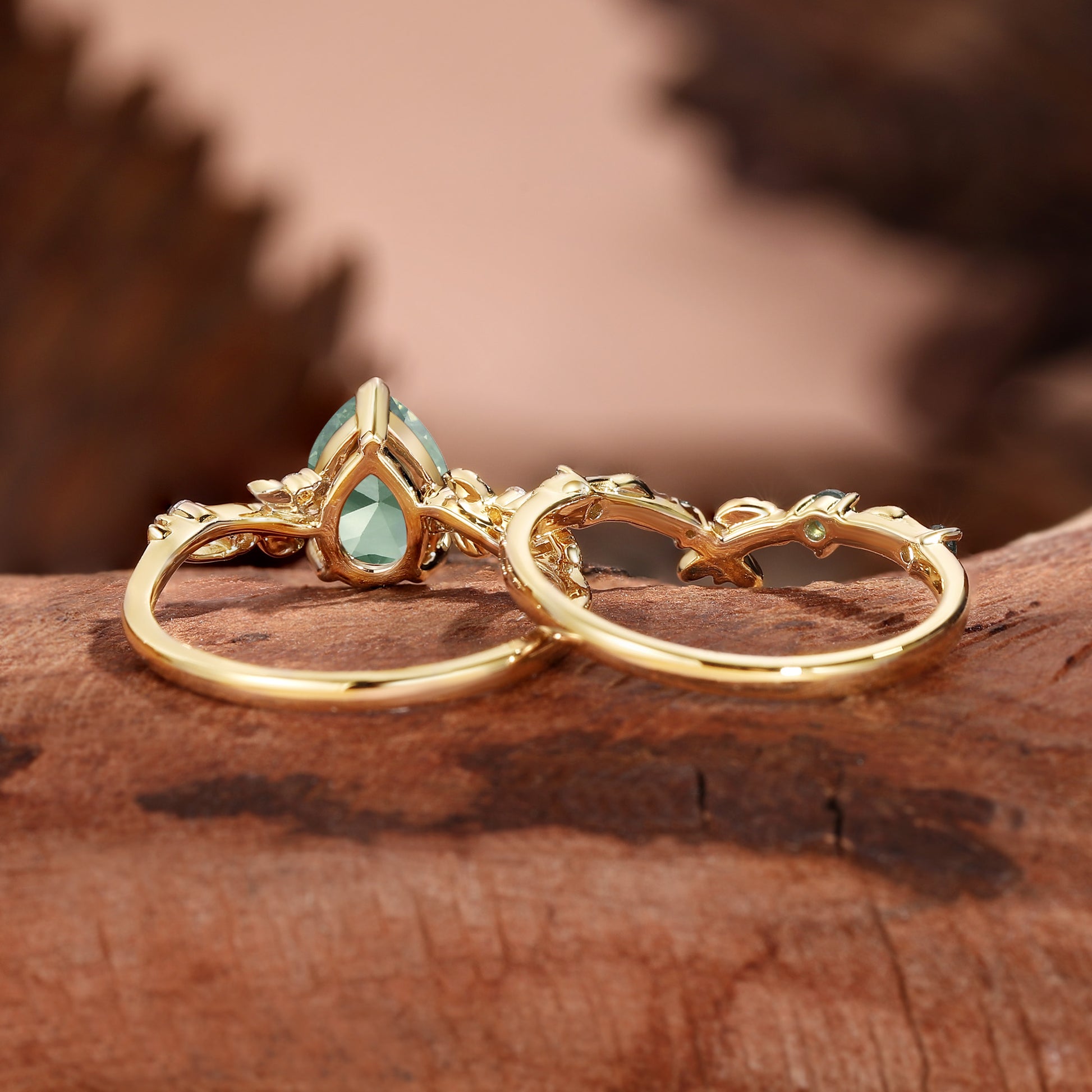 Clarissa - Pear Cut Lab Green Sapphire Leafy Bridal Set 2pcs