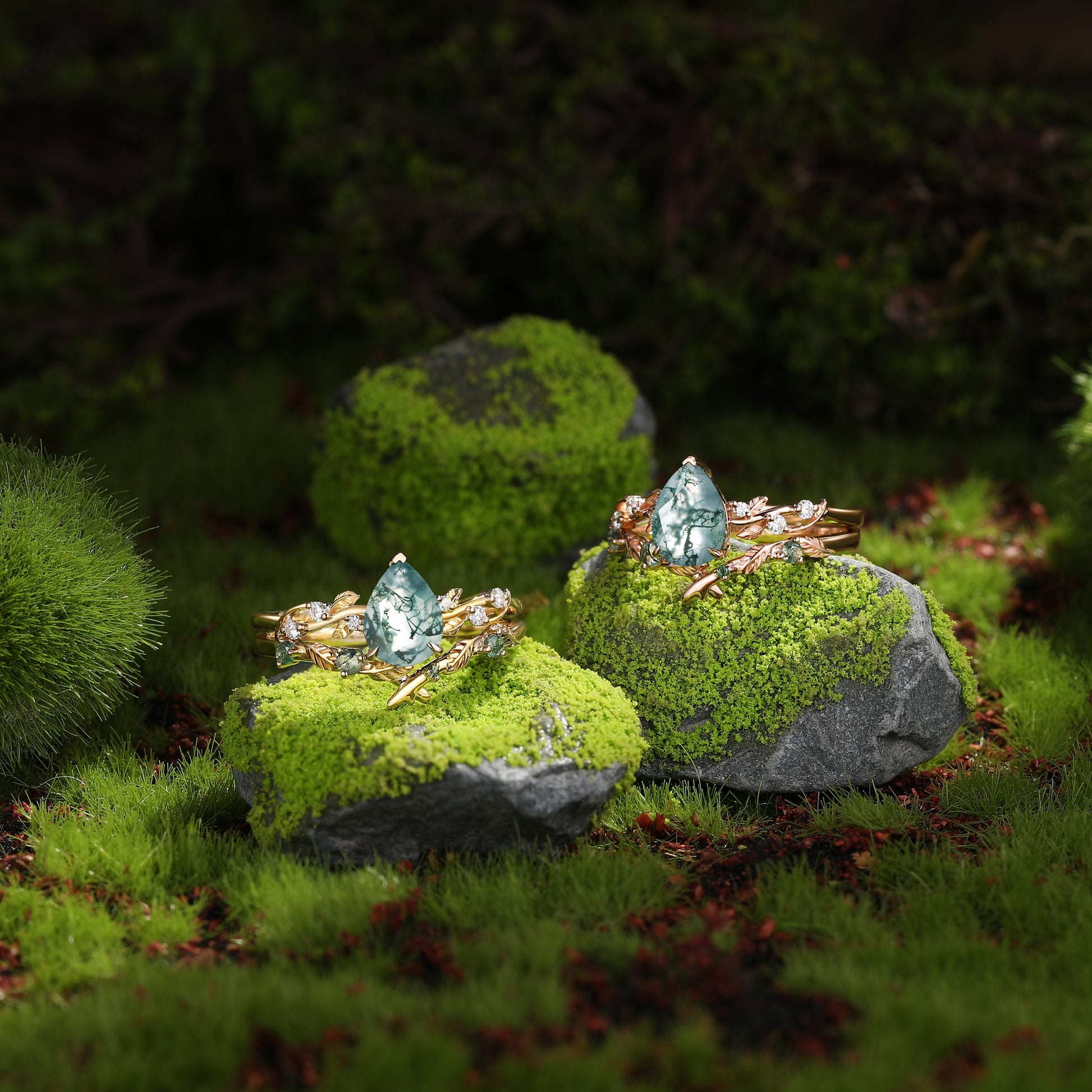 Embrace natural elegance with the Clarissa Pear Cut Moss Agate Leafy Bridal Set. This two-piece set features a unique pear-shaped moss agate stone, surrounded by delicate leafy details that evoke the beauty of the outdoors. Perfect for nature lovers, it symbolizes growth and harmony, making your special day even more meaningful
