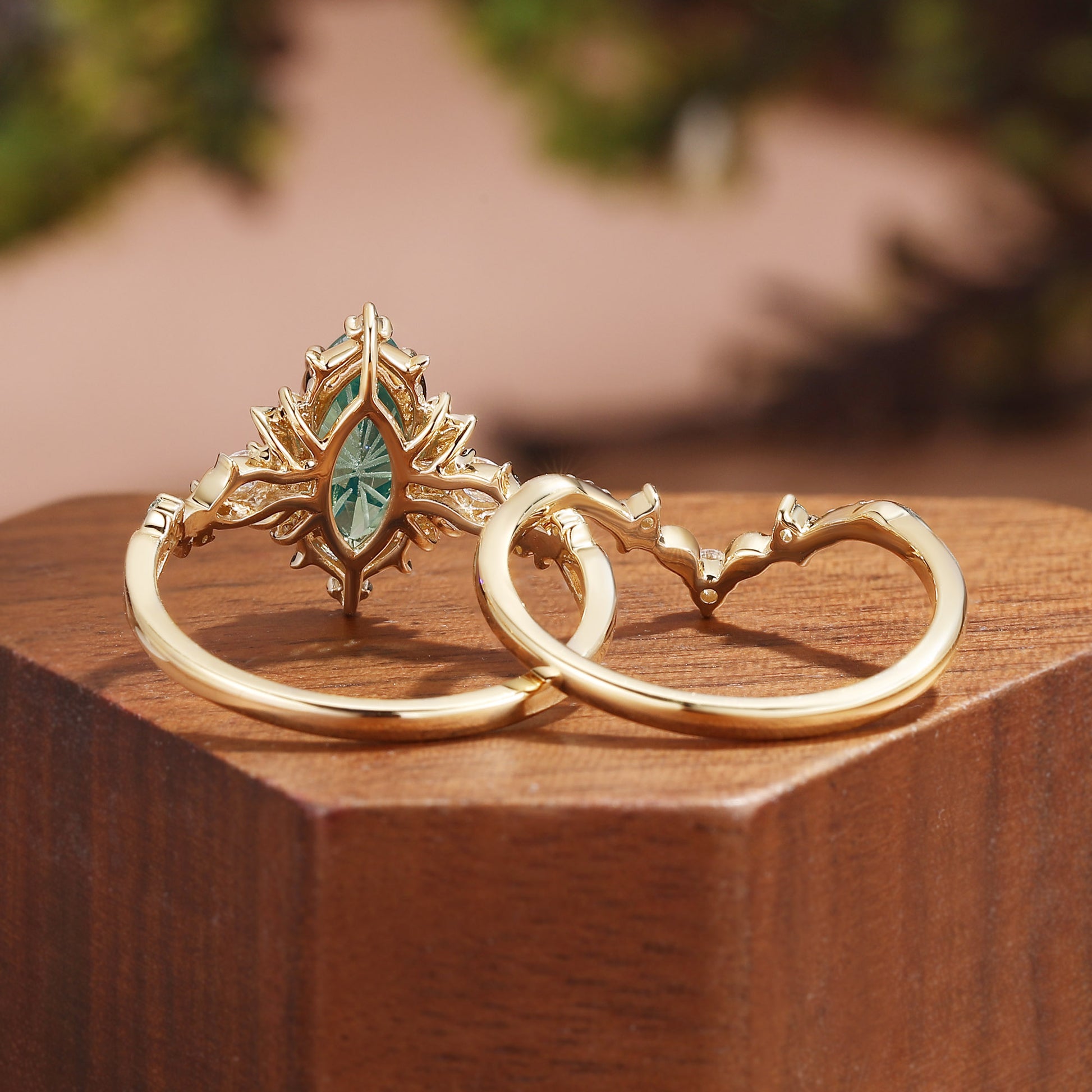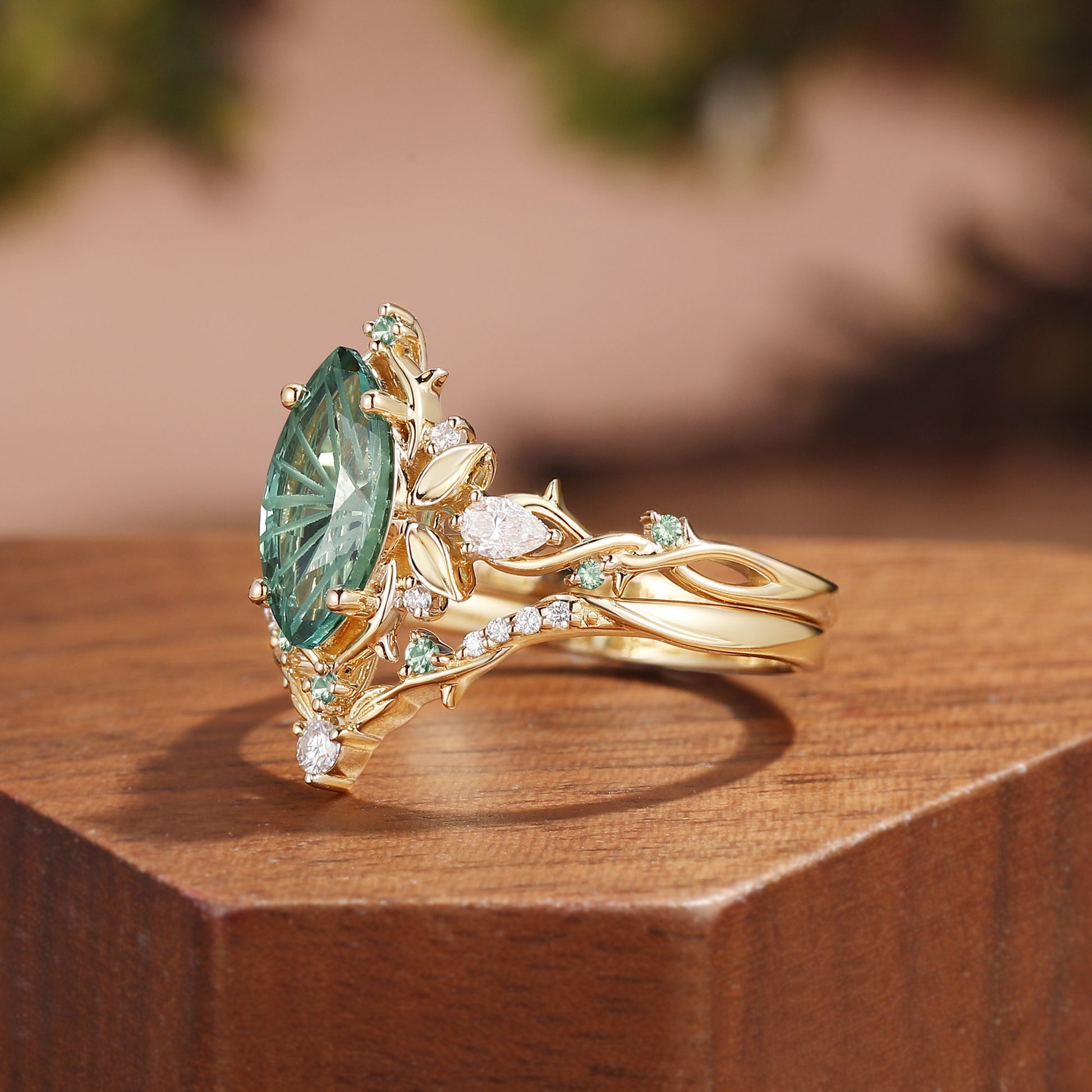 Forest Fairy Marquise Firework Cut Green Sapphire Leafy Inspired Bridal Set 2pcs - Fae