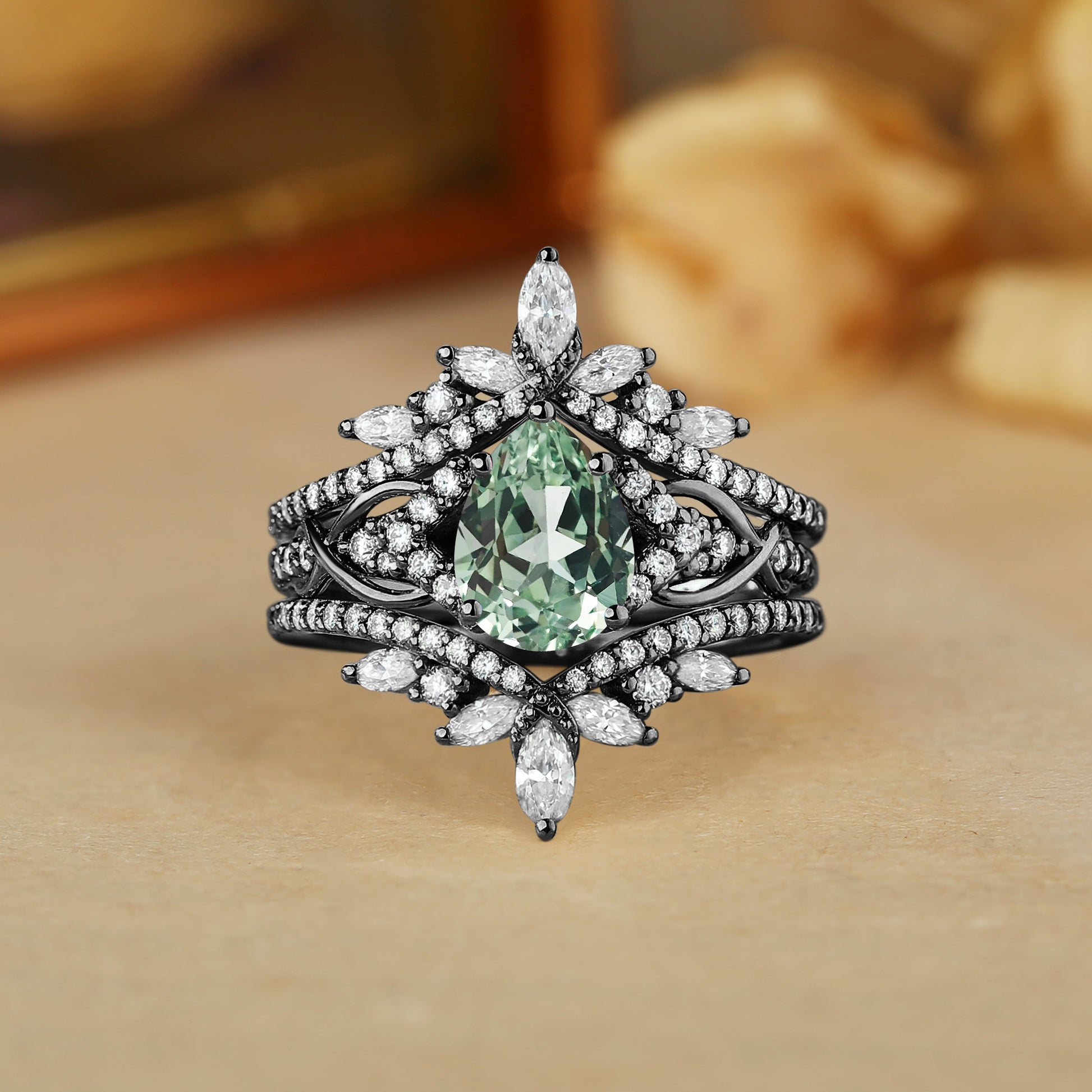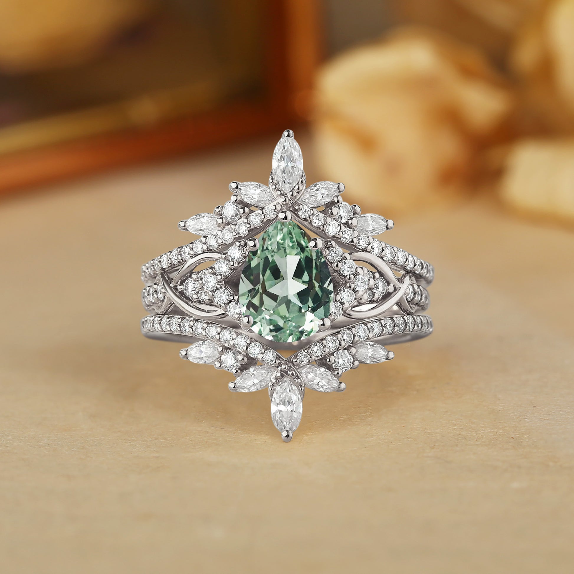 This enchanting Jasmine - Pear Cut Green Sapphire Twist Ring Set features two dazzling pieces that will add a touch of magic to any outfit. Crafted with high-quality moissanite stones, this set offers a stunning shine and a unique pear cut design. Perfect for those seeking a fairytale-worthy accessory.