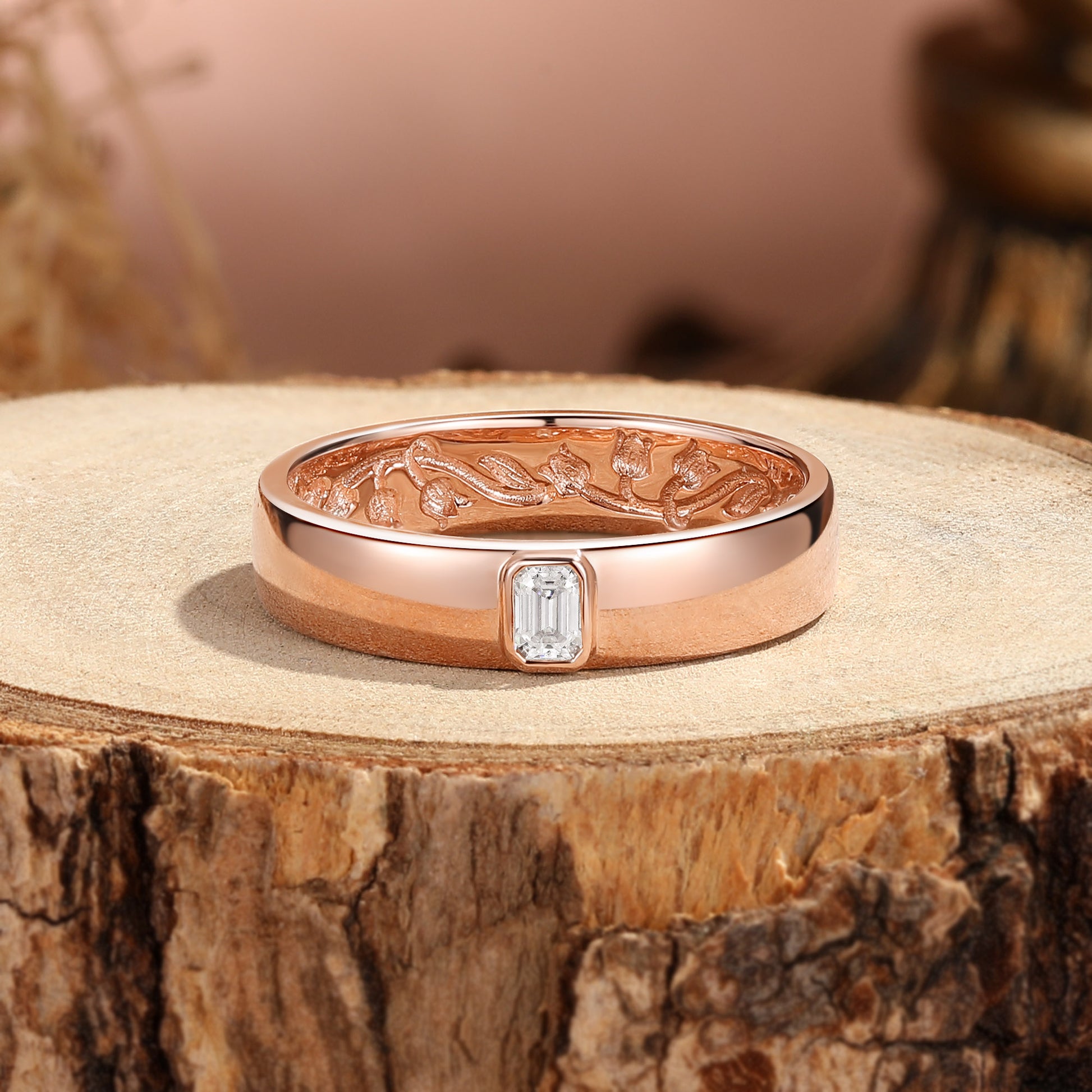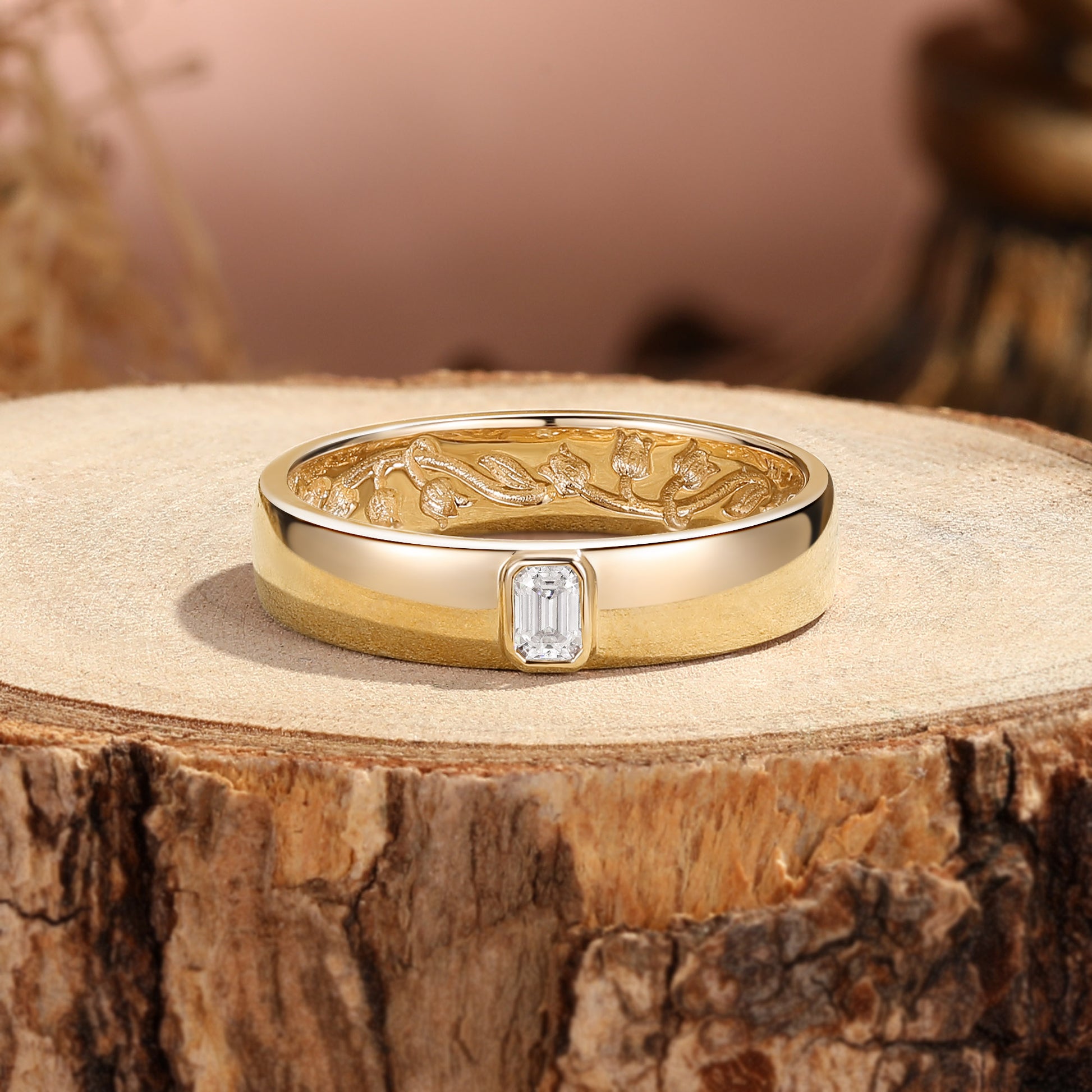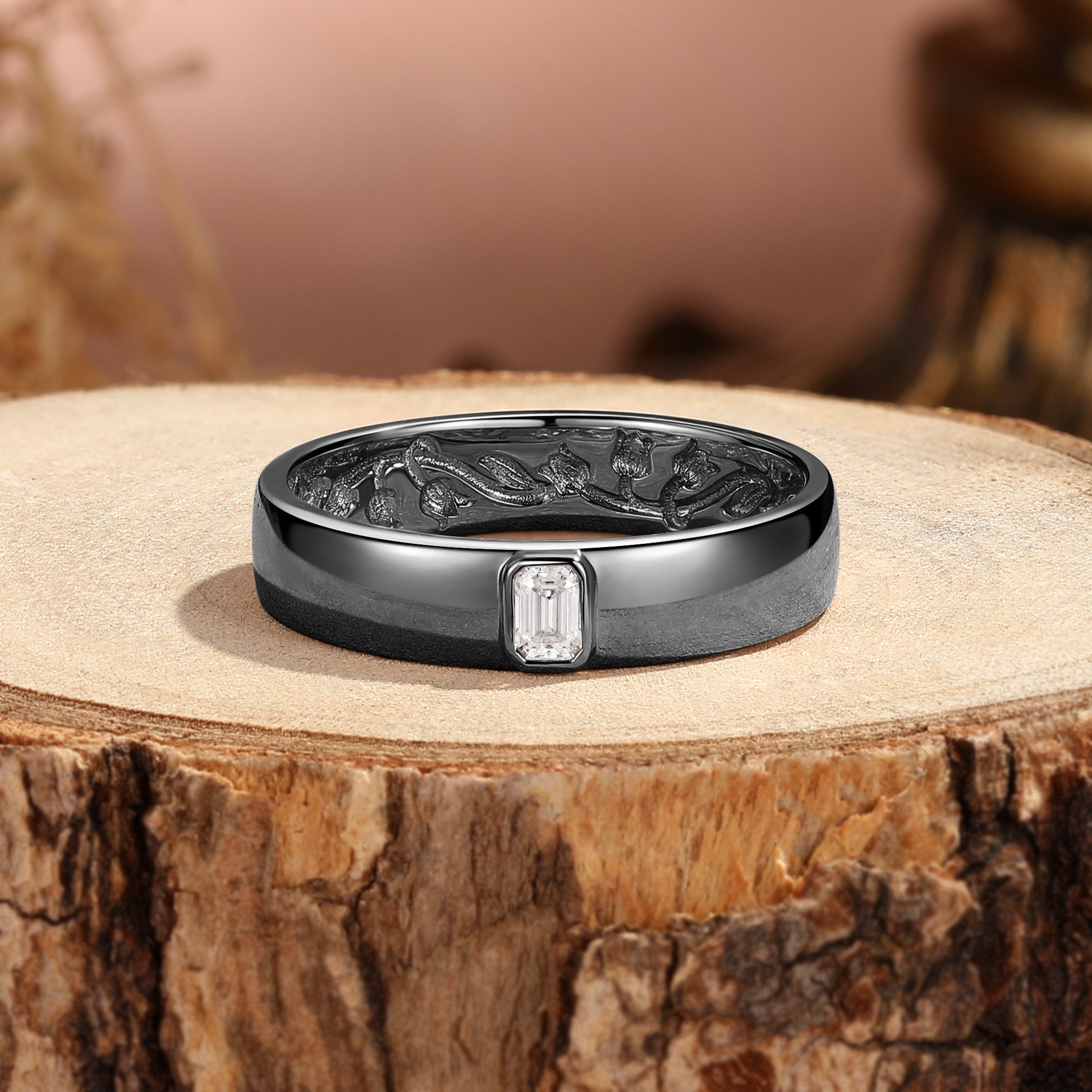 Men Band - Art Deco Emerald Cut Moissanite Flower Engraved Ring