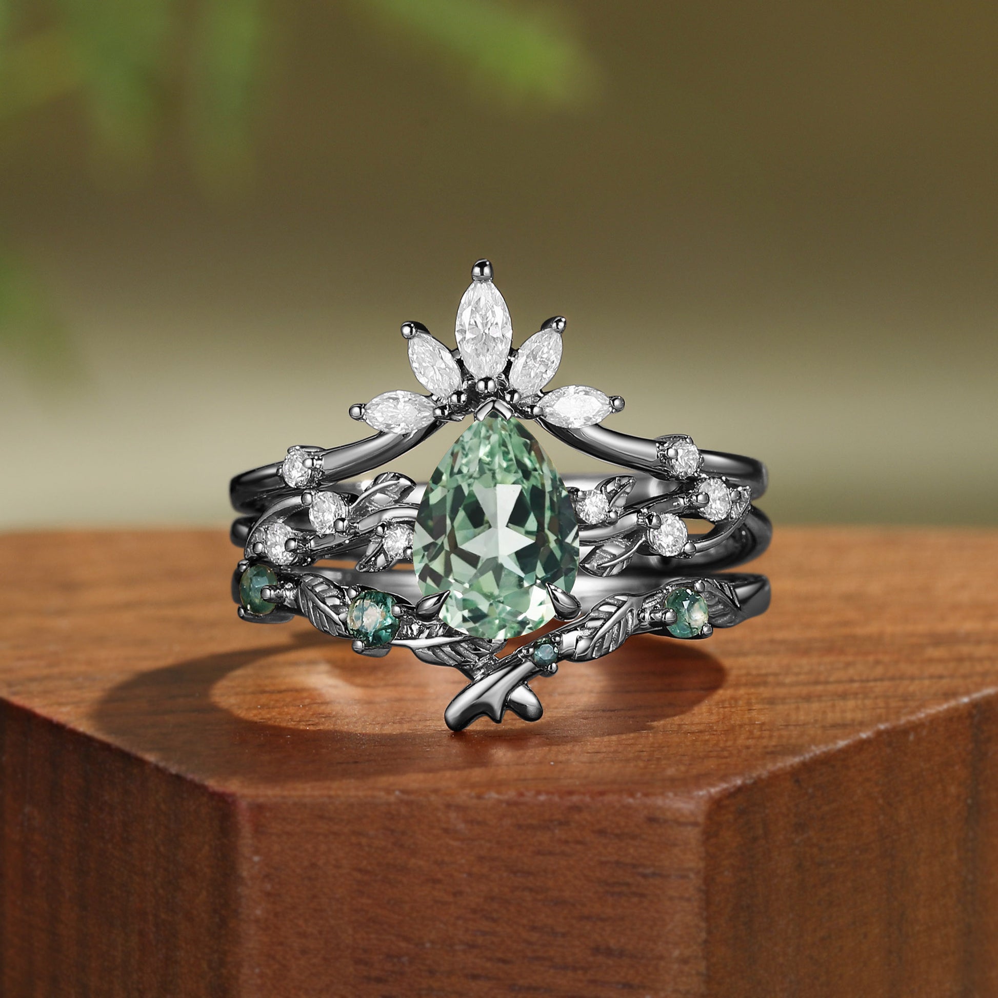 Lab Mint Green Sapphire Pear Cut Leafy Bridal Set 3pcs - Clarissa