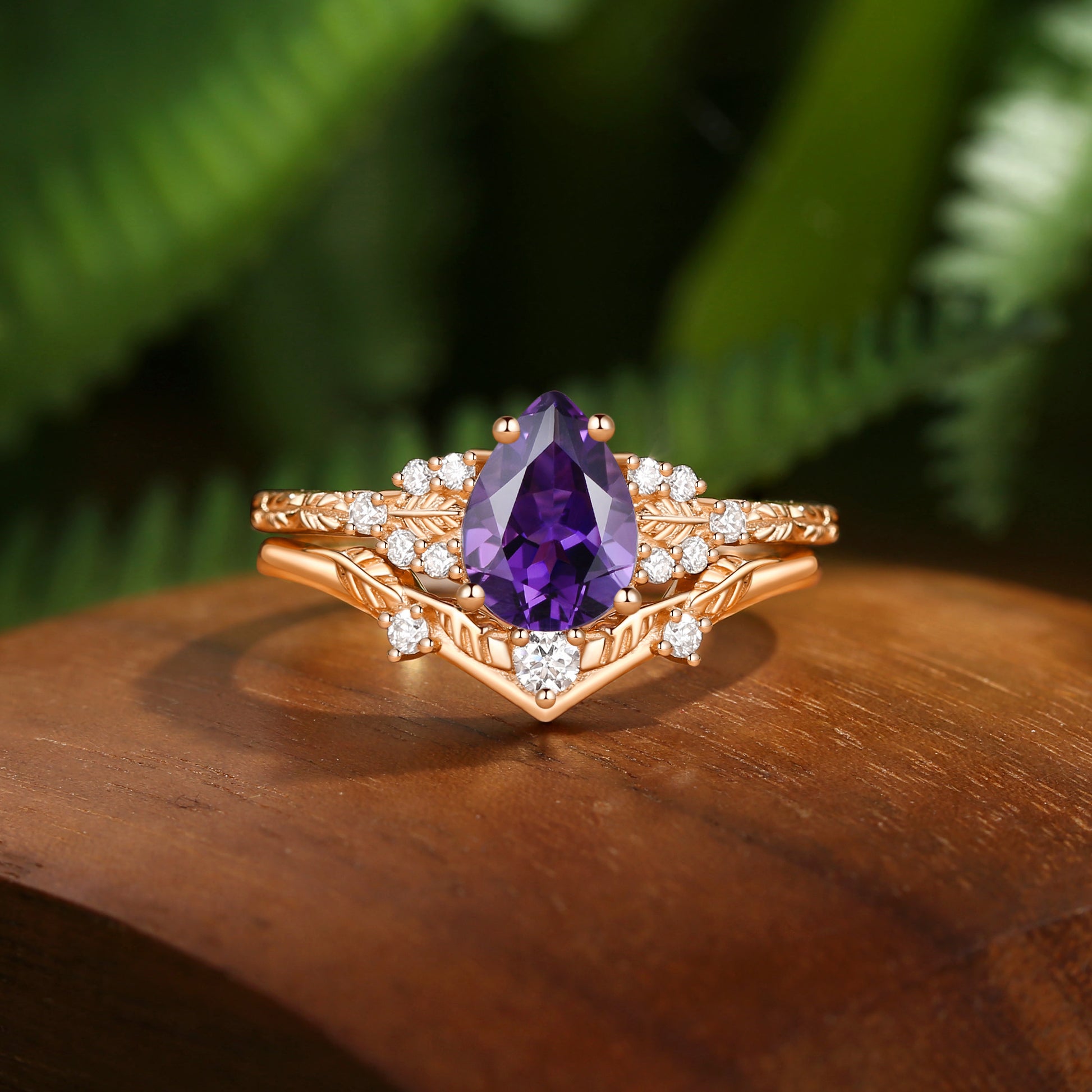 Hortense - Leaf Nature Inspired Pear Cut Amethyst Engagement Ring Set 2pcs