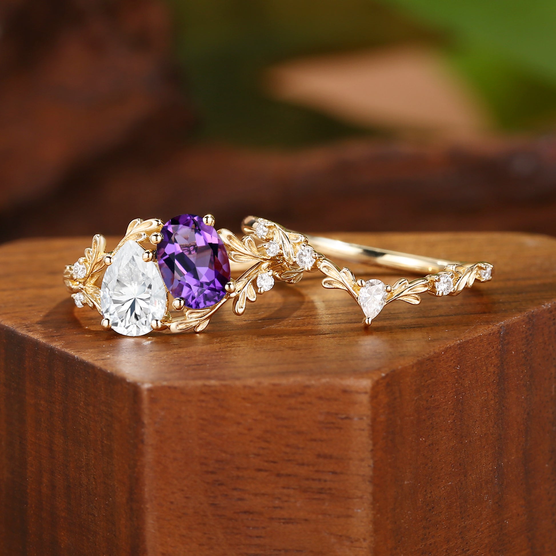 Isolde - Toi Et Moi Amethyst & Moissanite Leaf Two Stone Bridal Set 2PCS