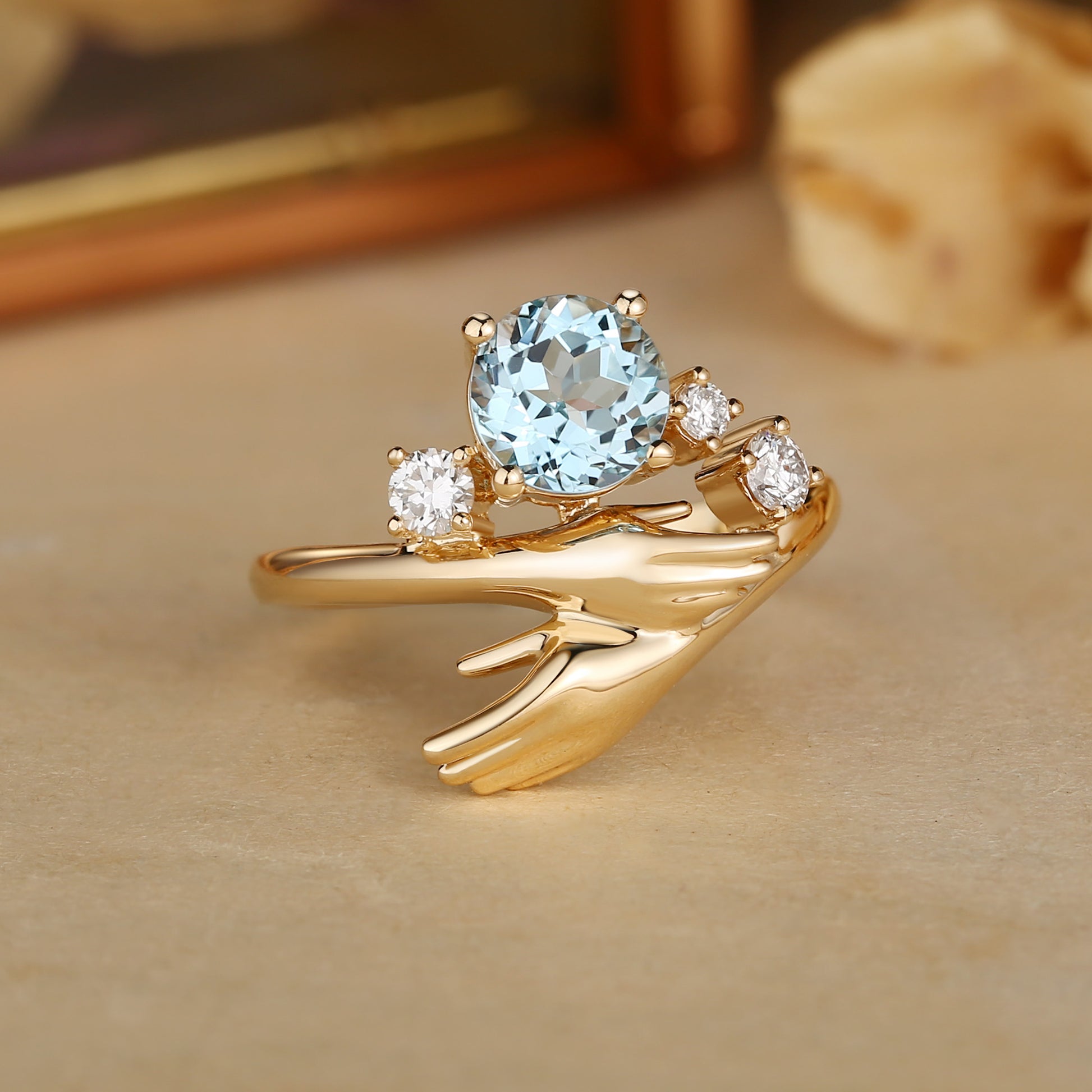 Unity - Unique Round Cut Aquamarine Art Hand Inspired Engagement Ring