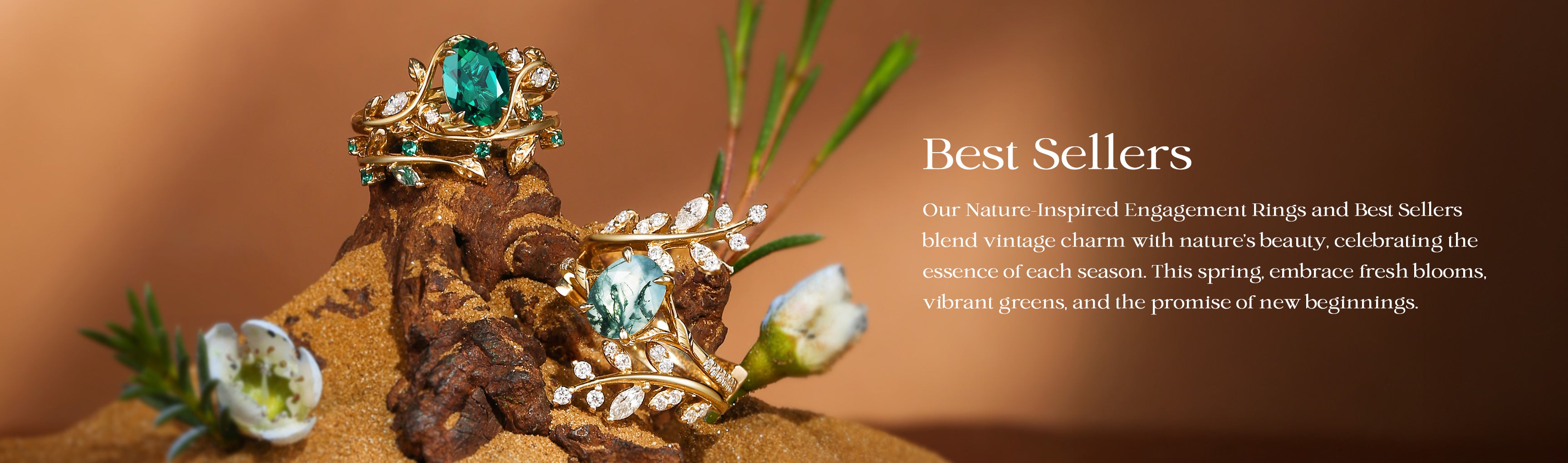 Adeline - Green Sapphire Leaf and Flower Elegance Engagement Ring Set 2pcs