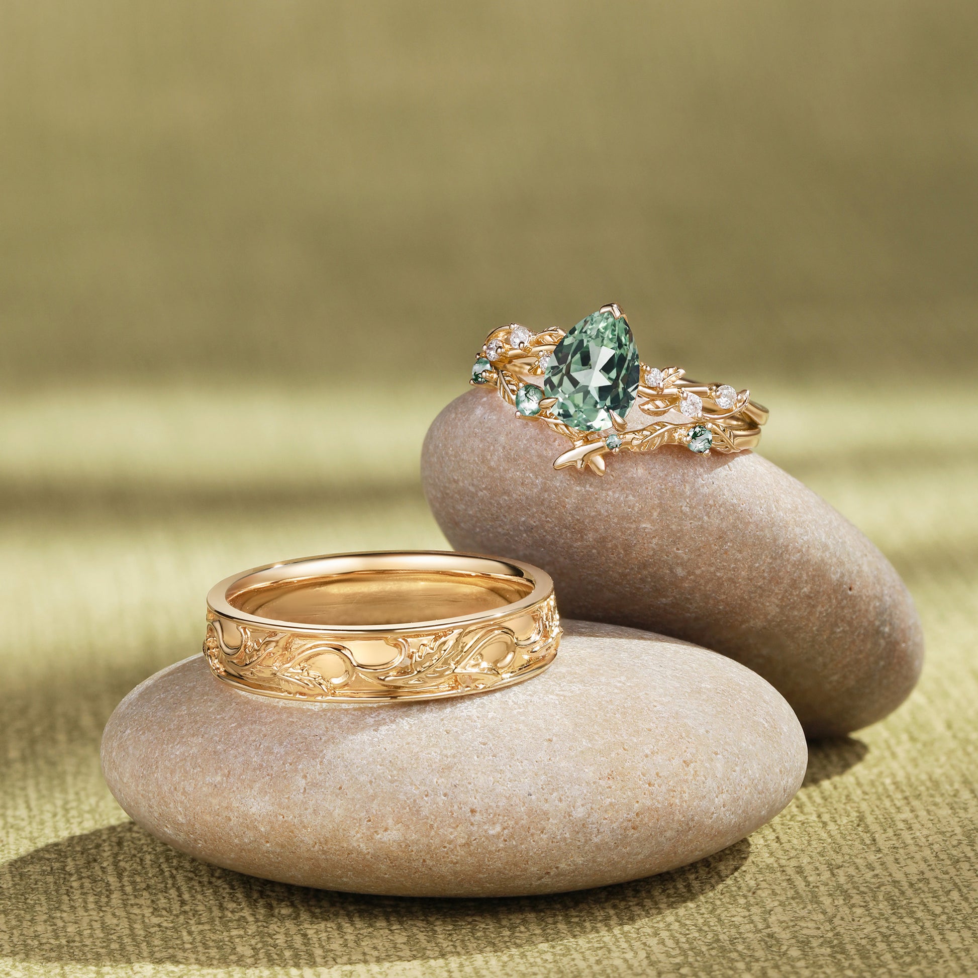 Leaves Inspired Lab Green Sapphire Pear Cut Couple Ring Set - Clarissa