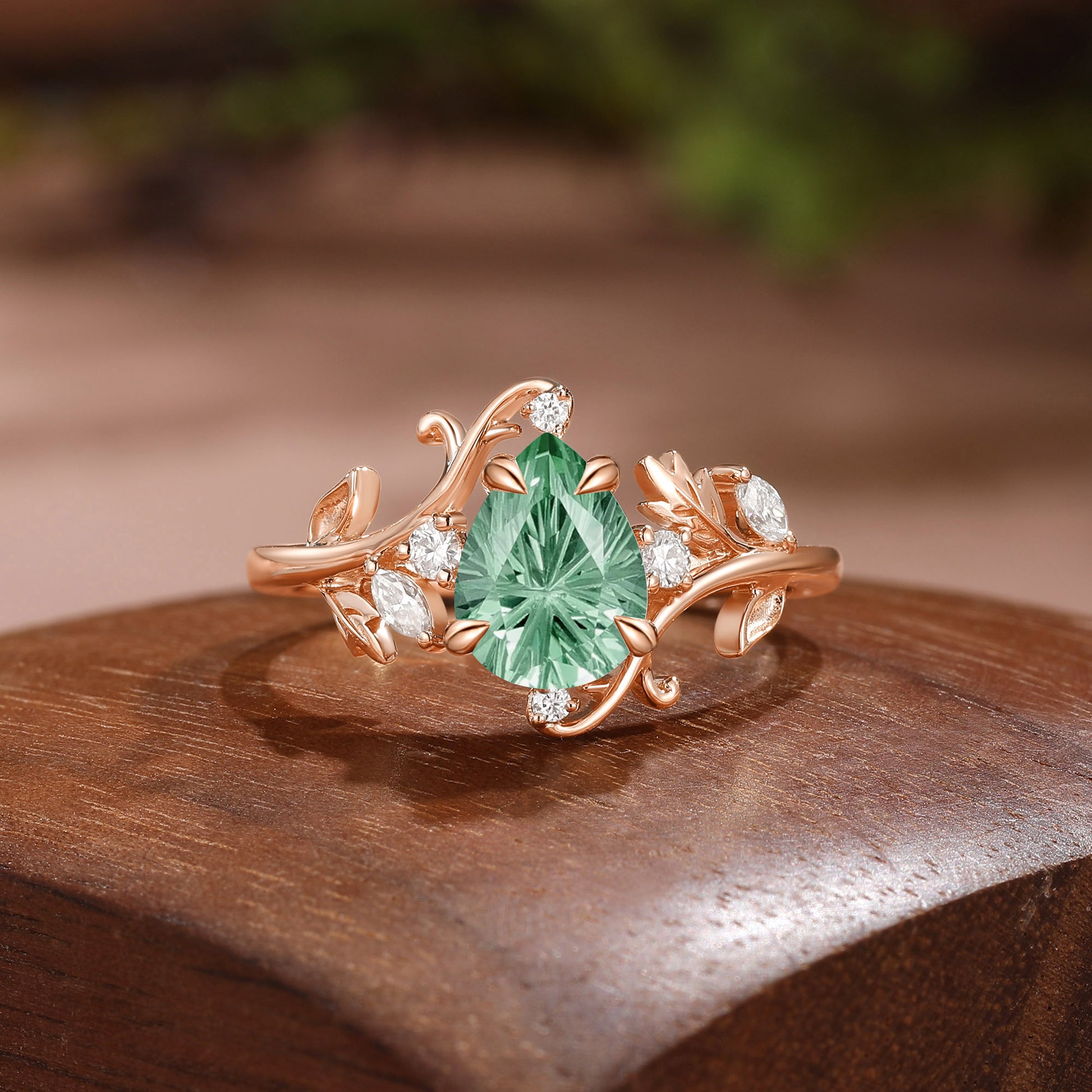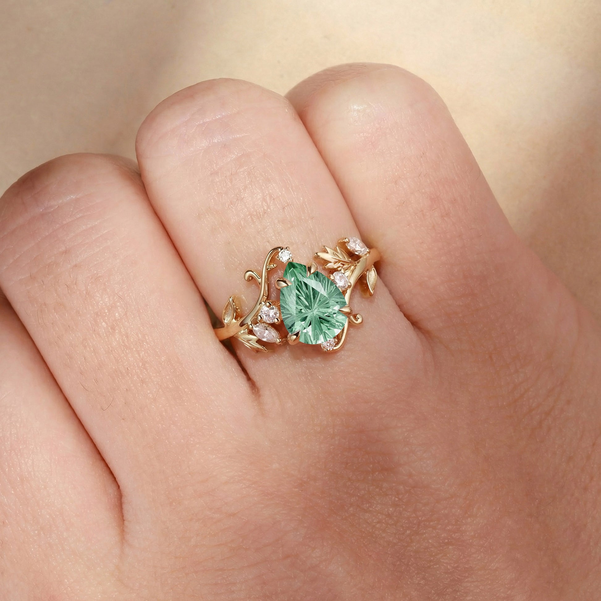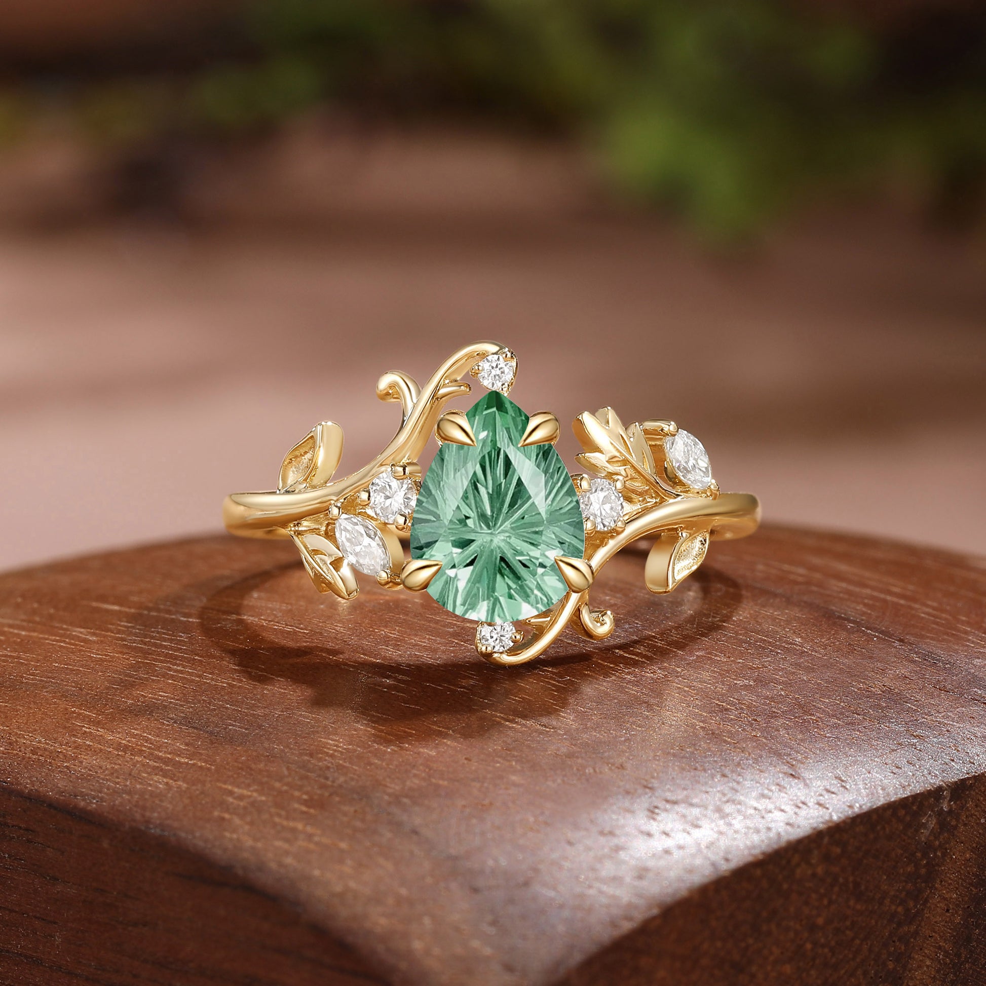 Lavinia feels like a whisper from a hidden forest. At its center, a radiant firework cut pear green sapphire engagement ring sparkles with vivid, lively brilliance, catching light like magic in motion.