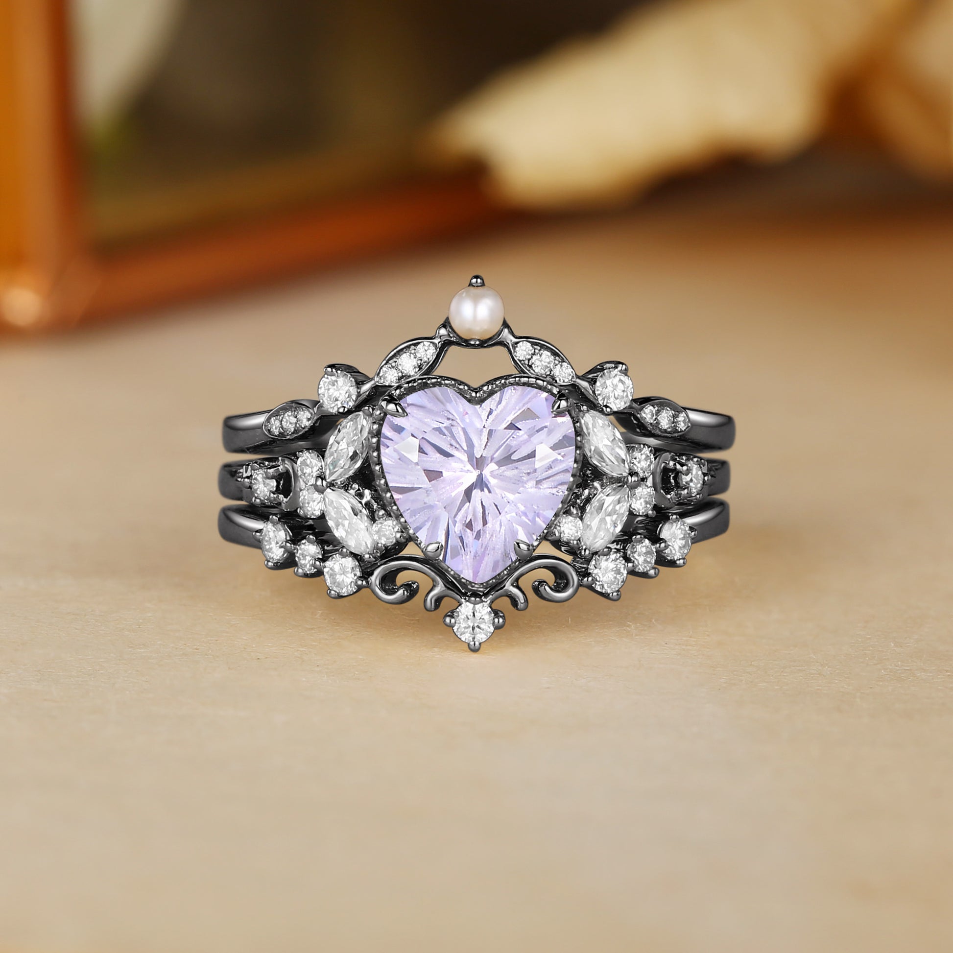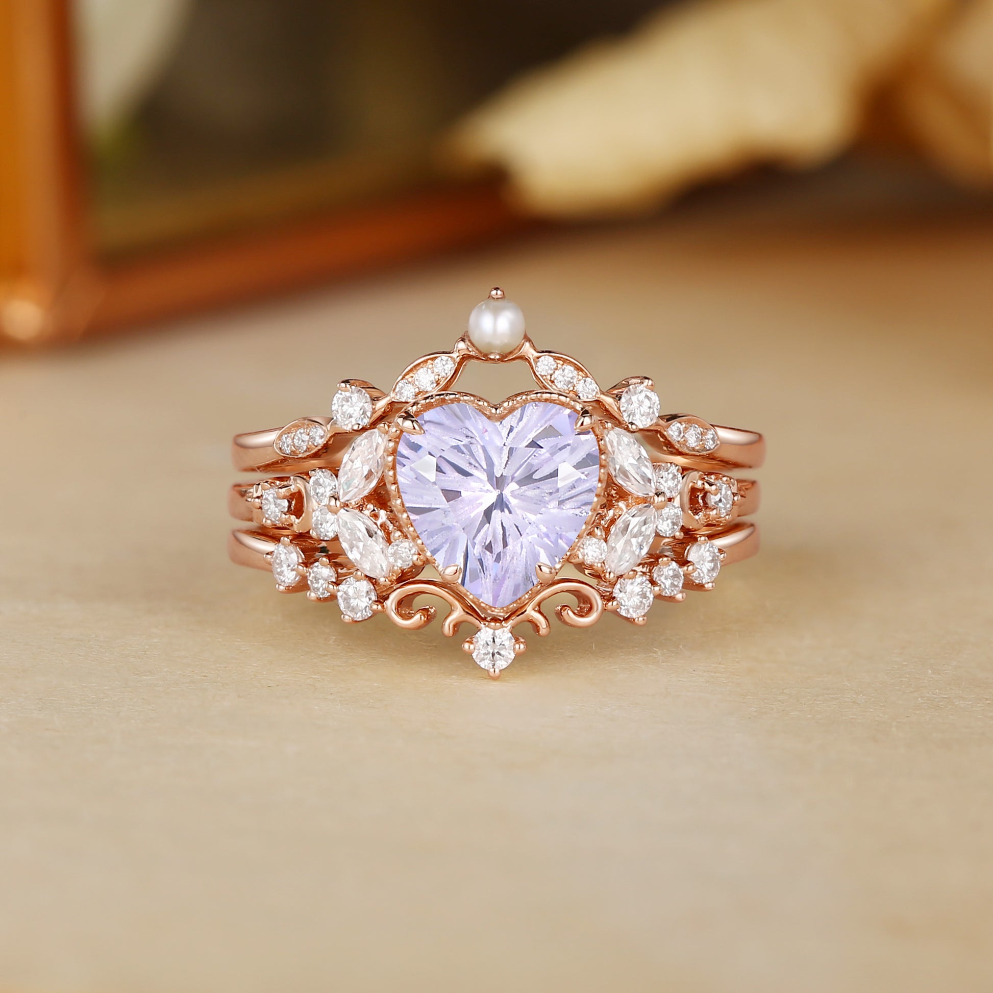 Blanche - Firework Heart Cut Lavender Sapphire Butterfly Pearl Ring Bridal Sets 3pcs