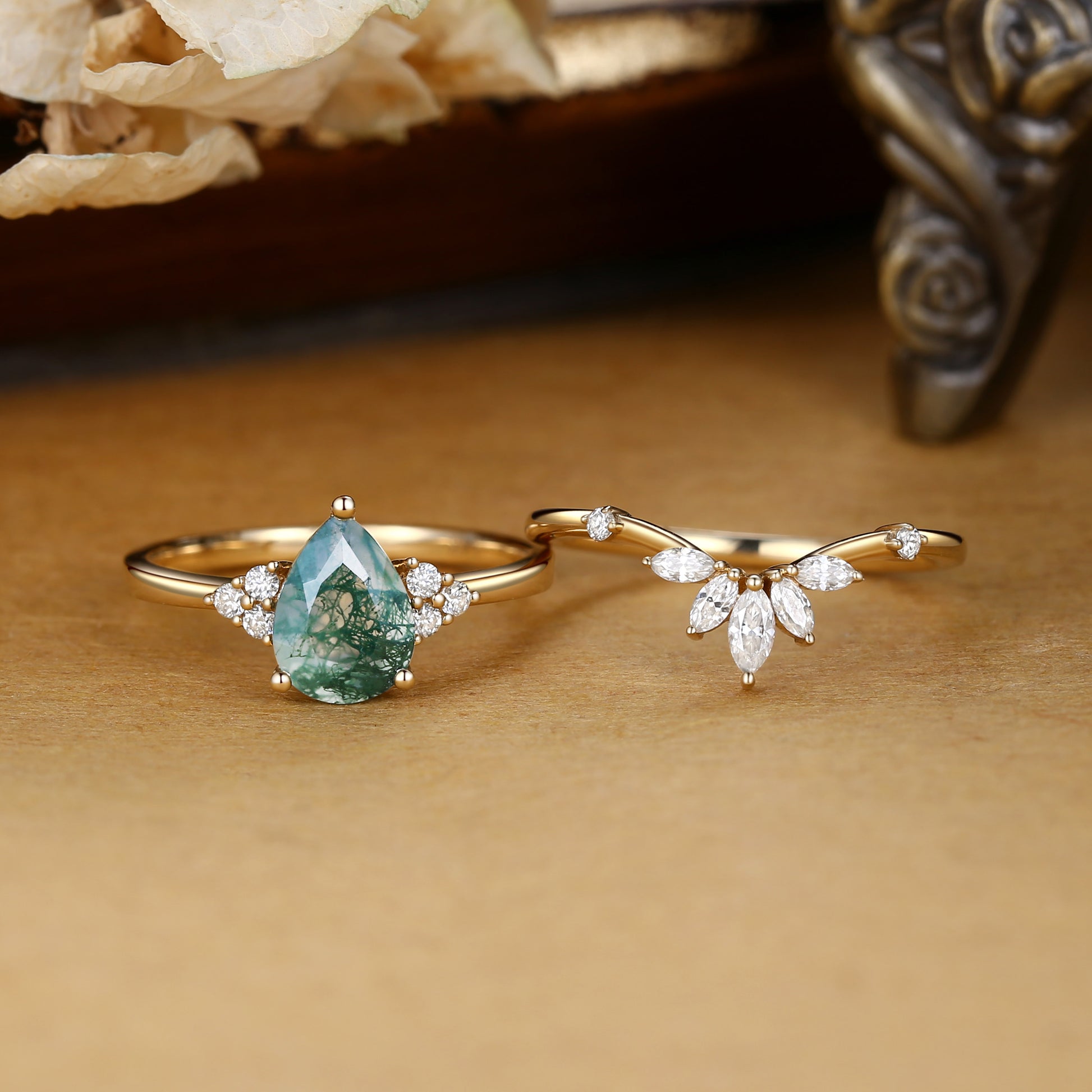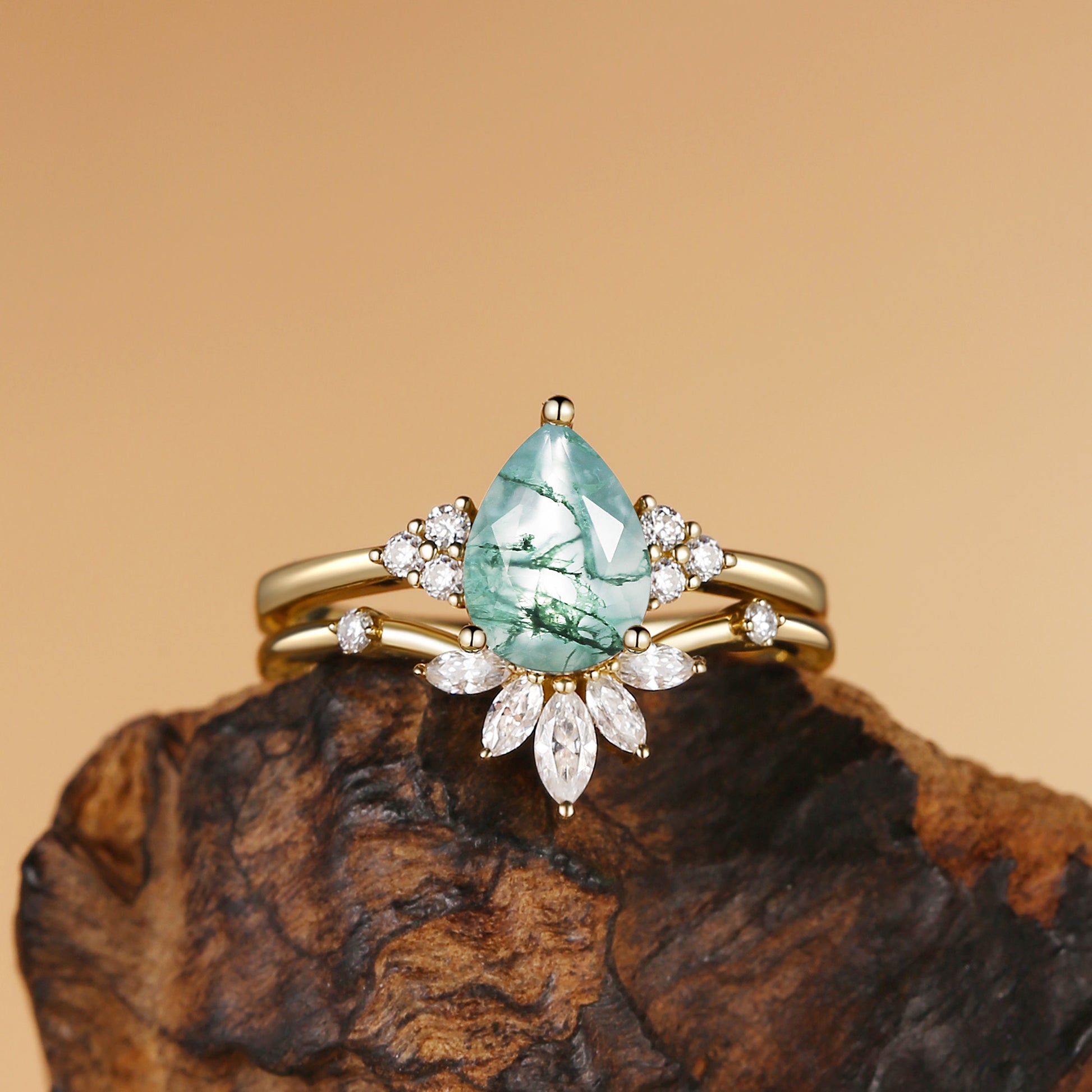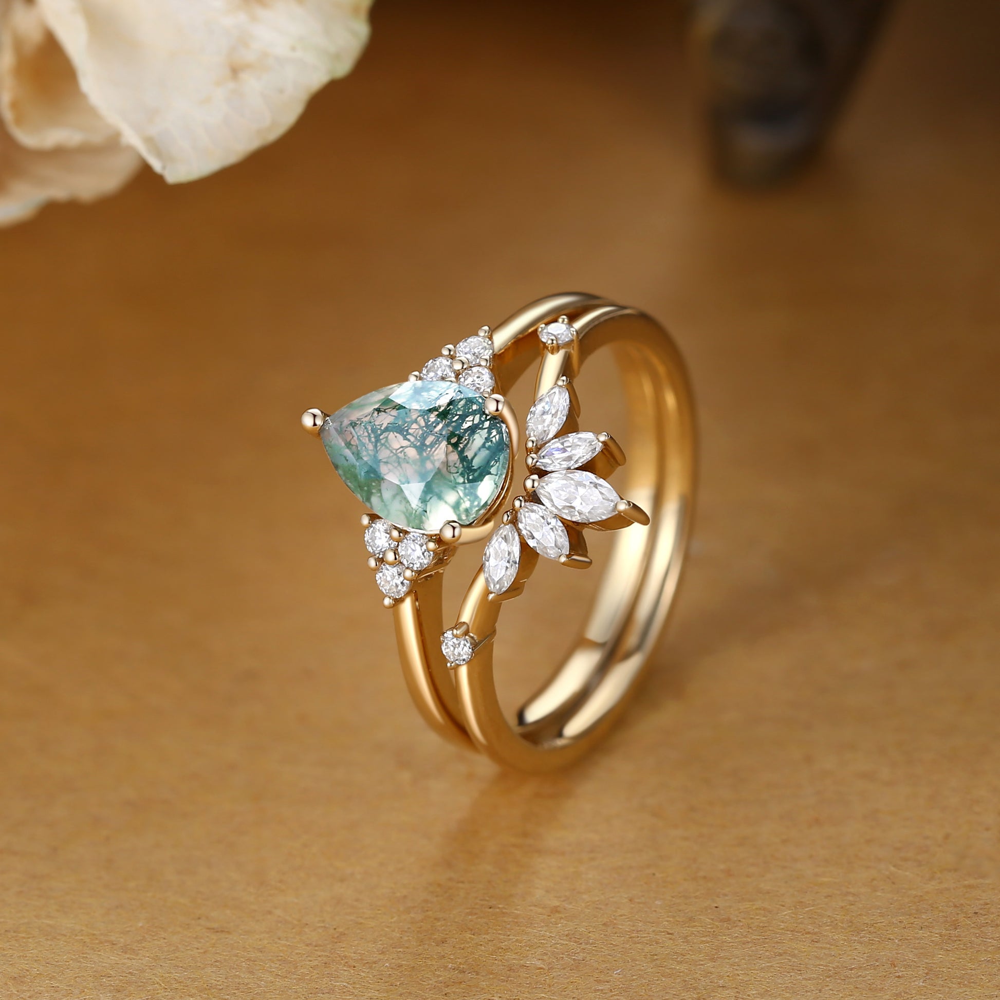 Camille - Pear Cut Moss Agate Classic Engagement Ring Set 2pcs