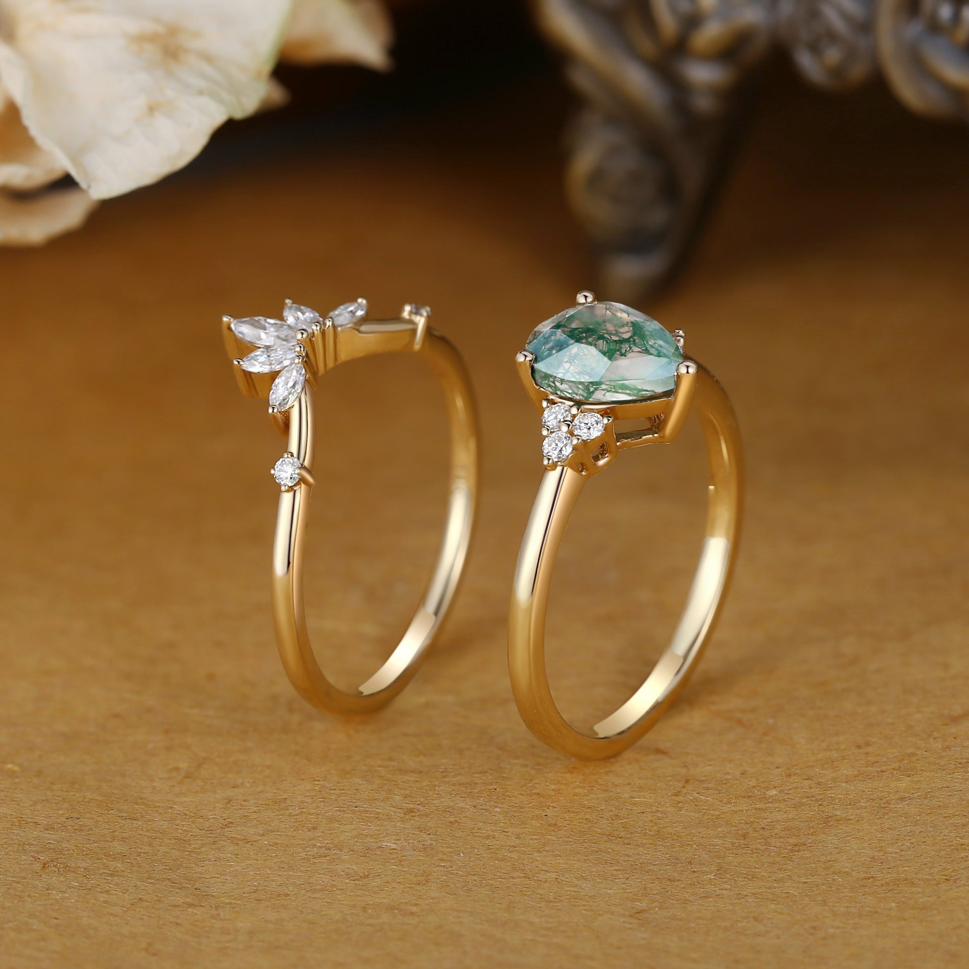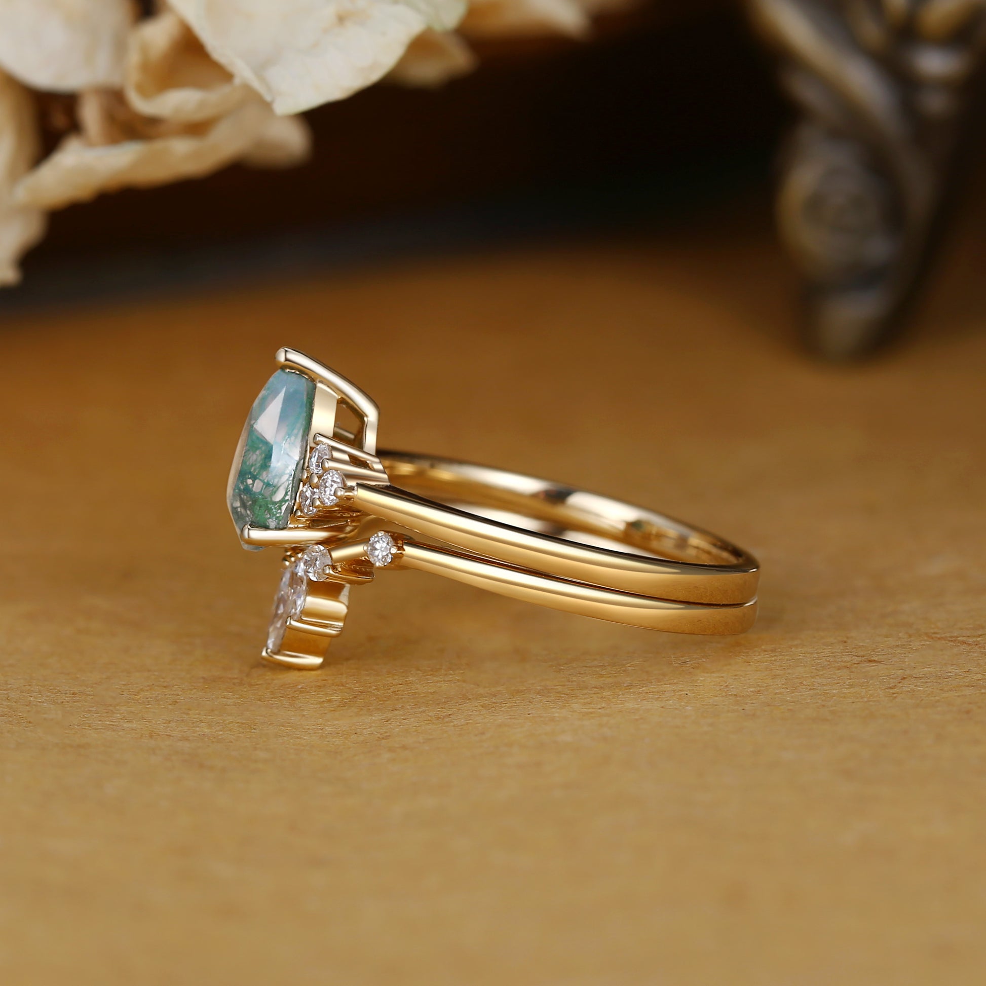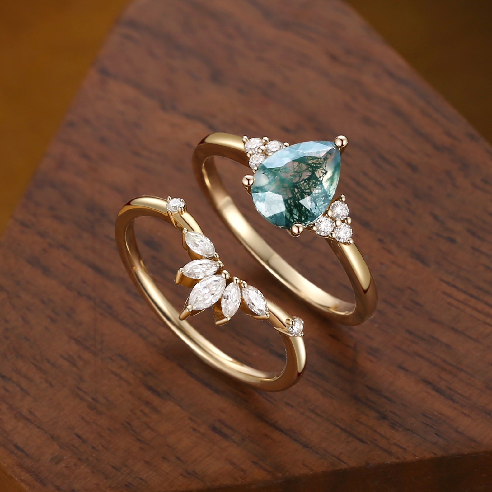Camille - Pear Cut Moss Agate Classic Engagement Ring Set 2pcs