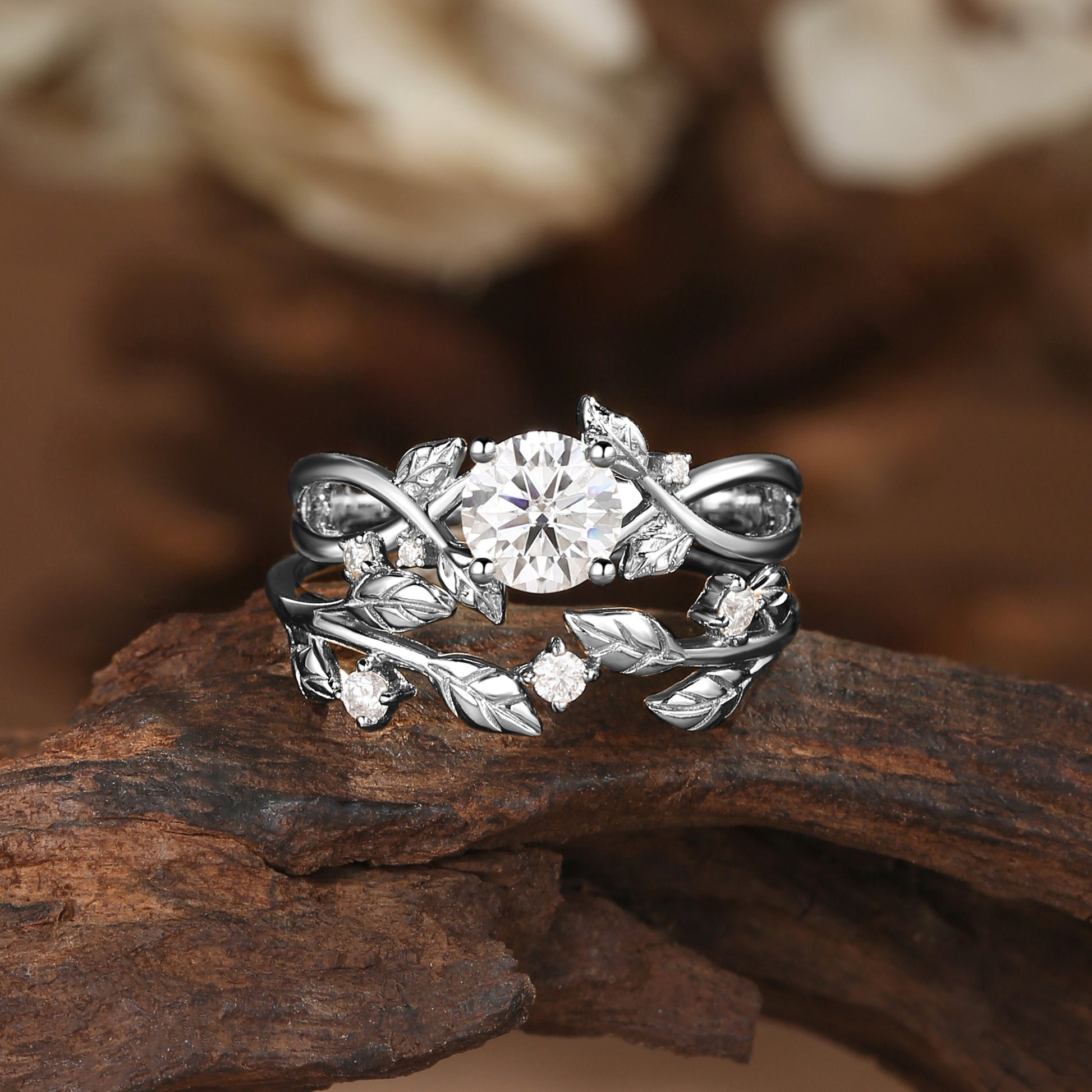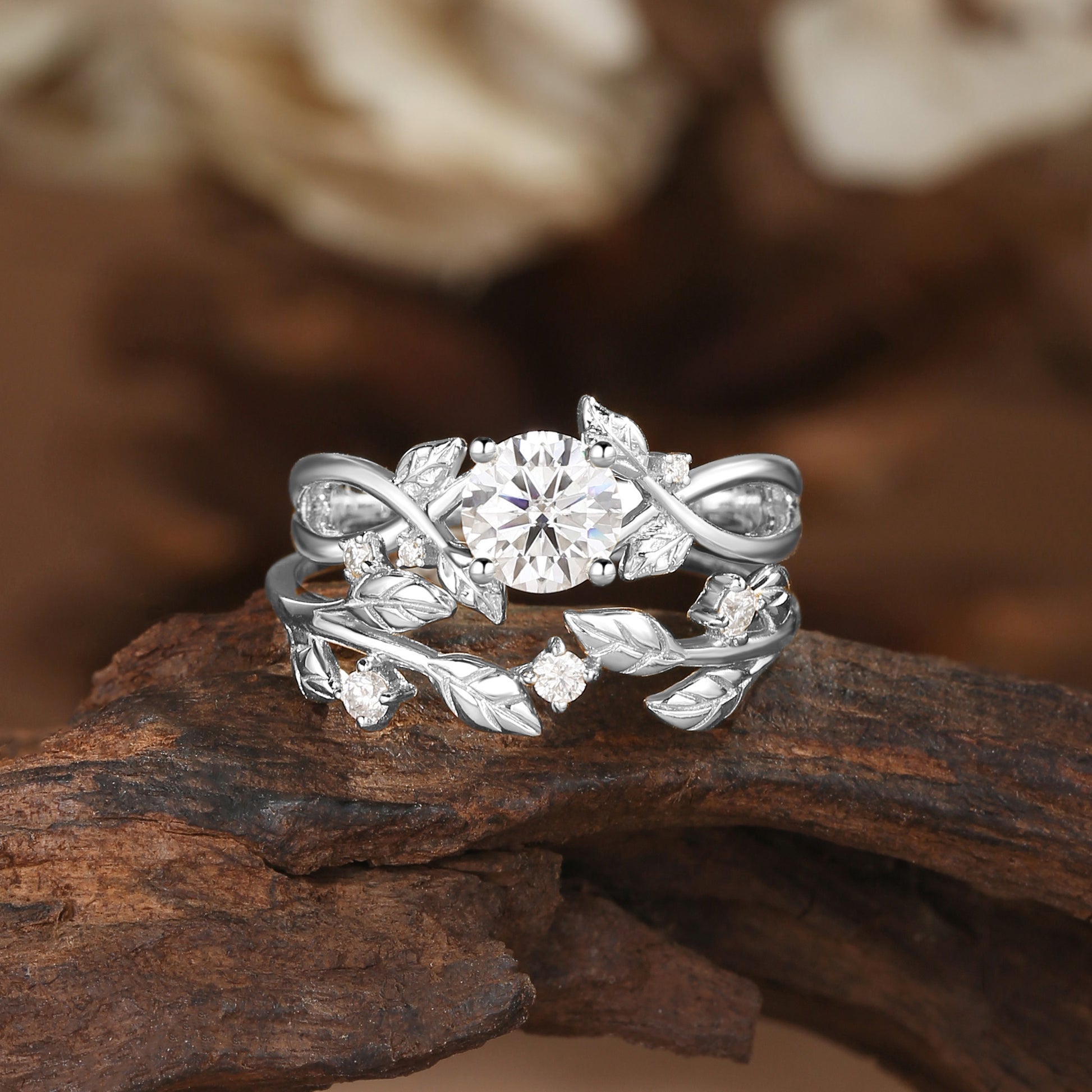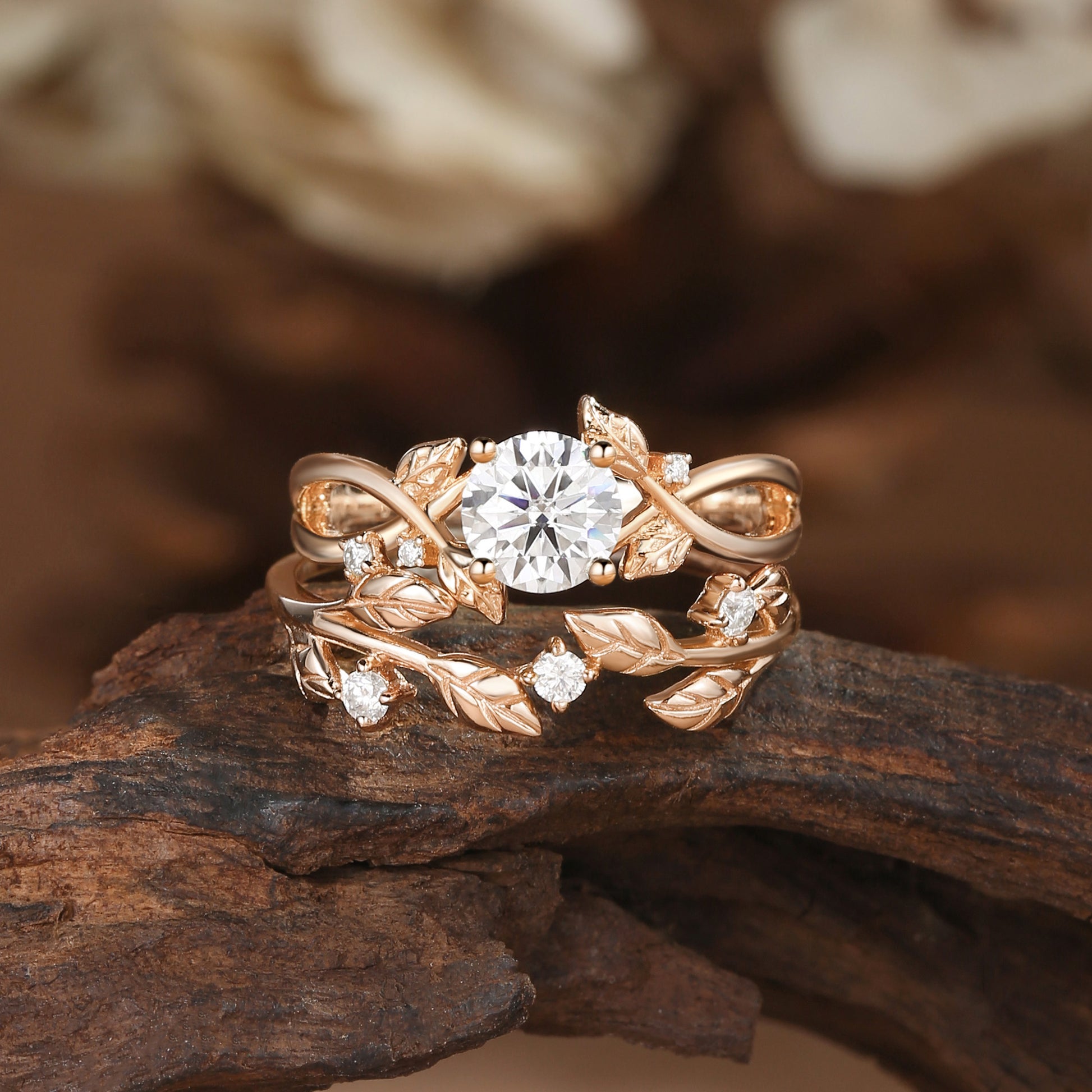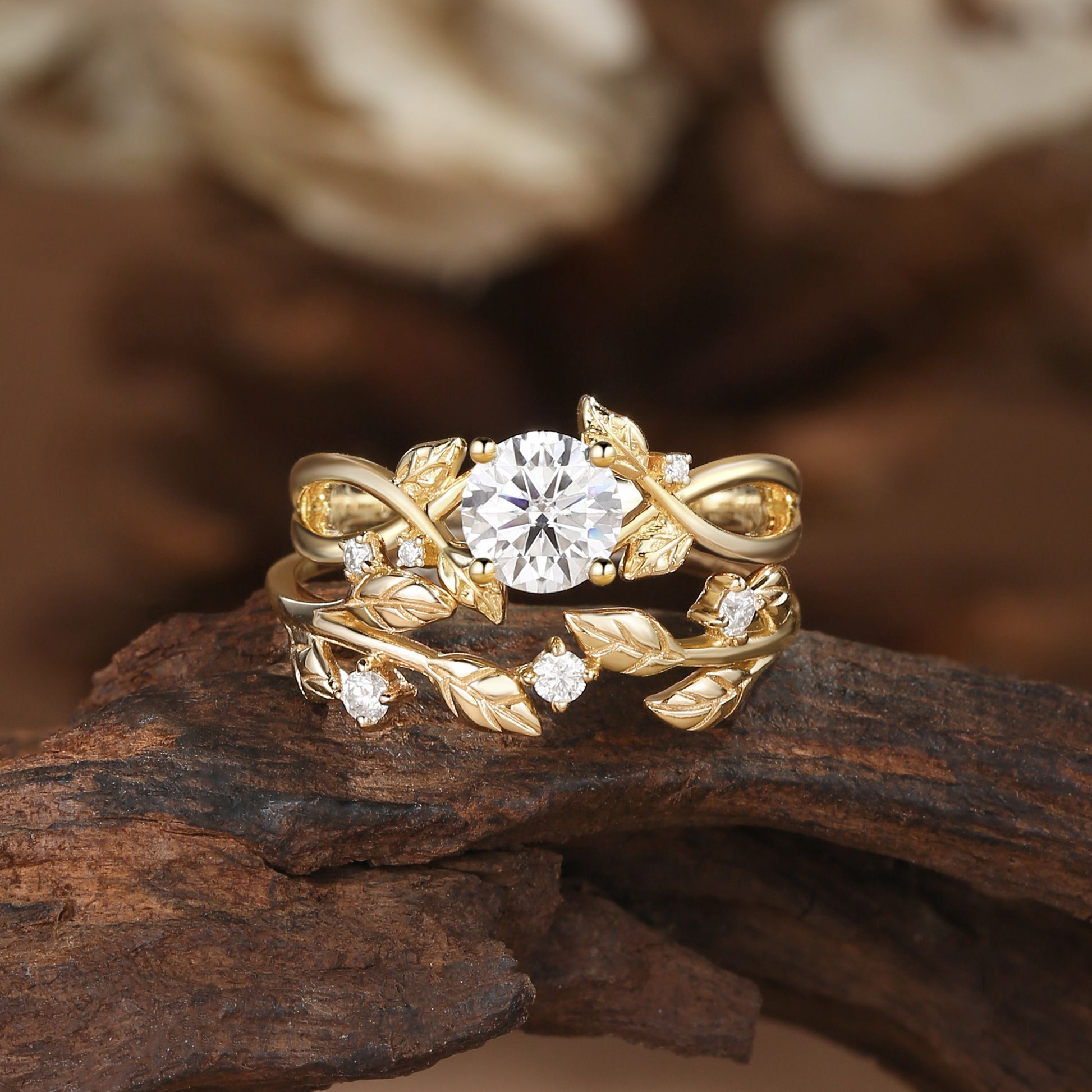 This exquisite Leaf Ring Bridal Set features a Round Cut Moissanite stone set in shimmering gold. The unique leaf design adds a touch of nature to this elegant piece. Perfect for any bride looking for a timeless and sophisticated ring set
