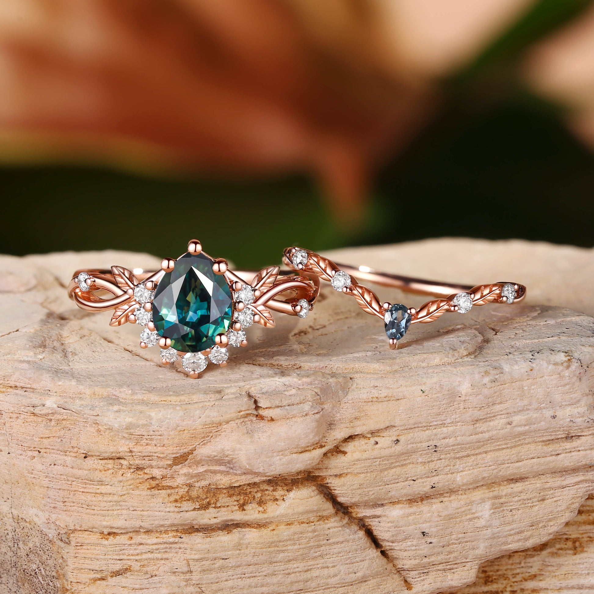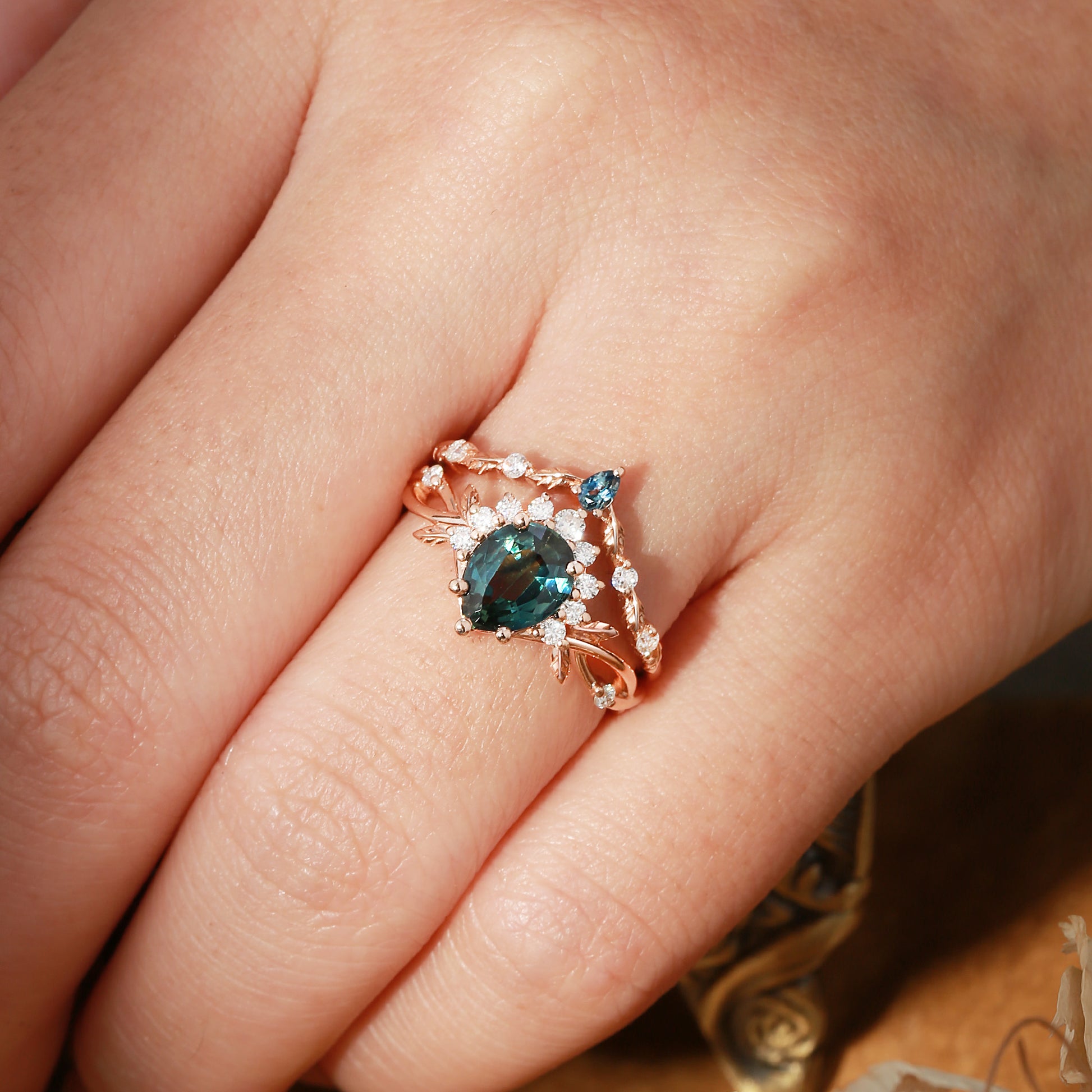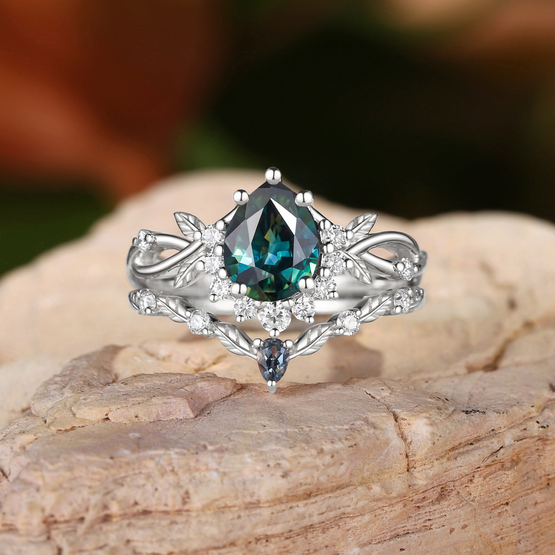 Drisana - 14K Pear Cut Natural Blue Green Sapphire Engagement Ring Set 2pcs