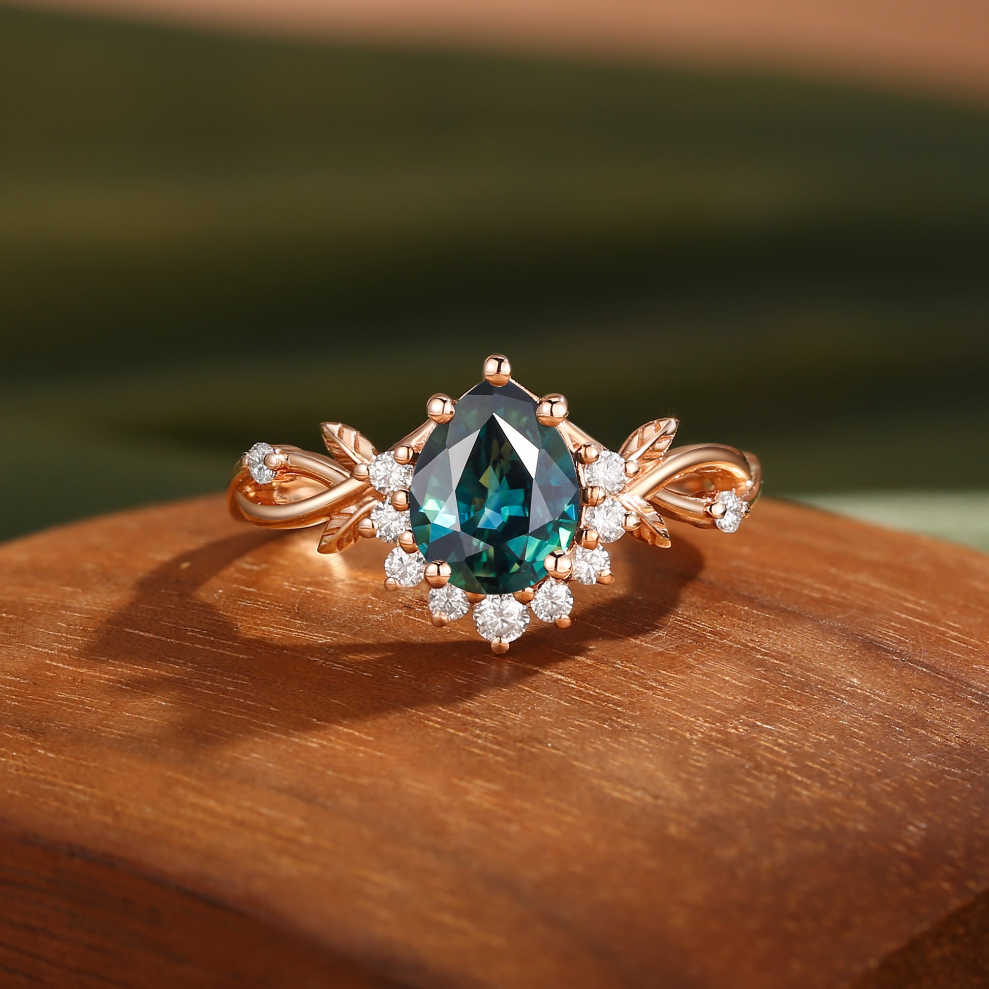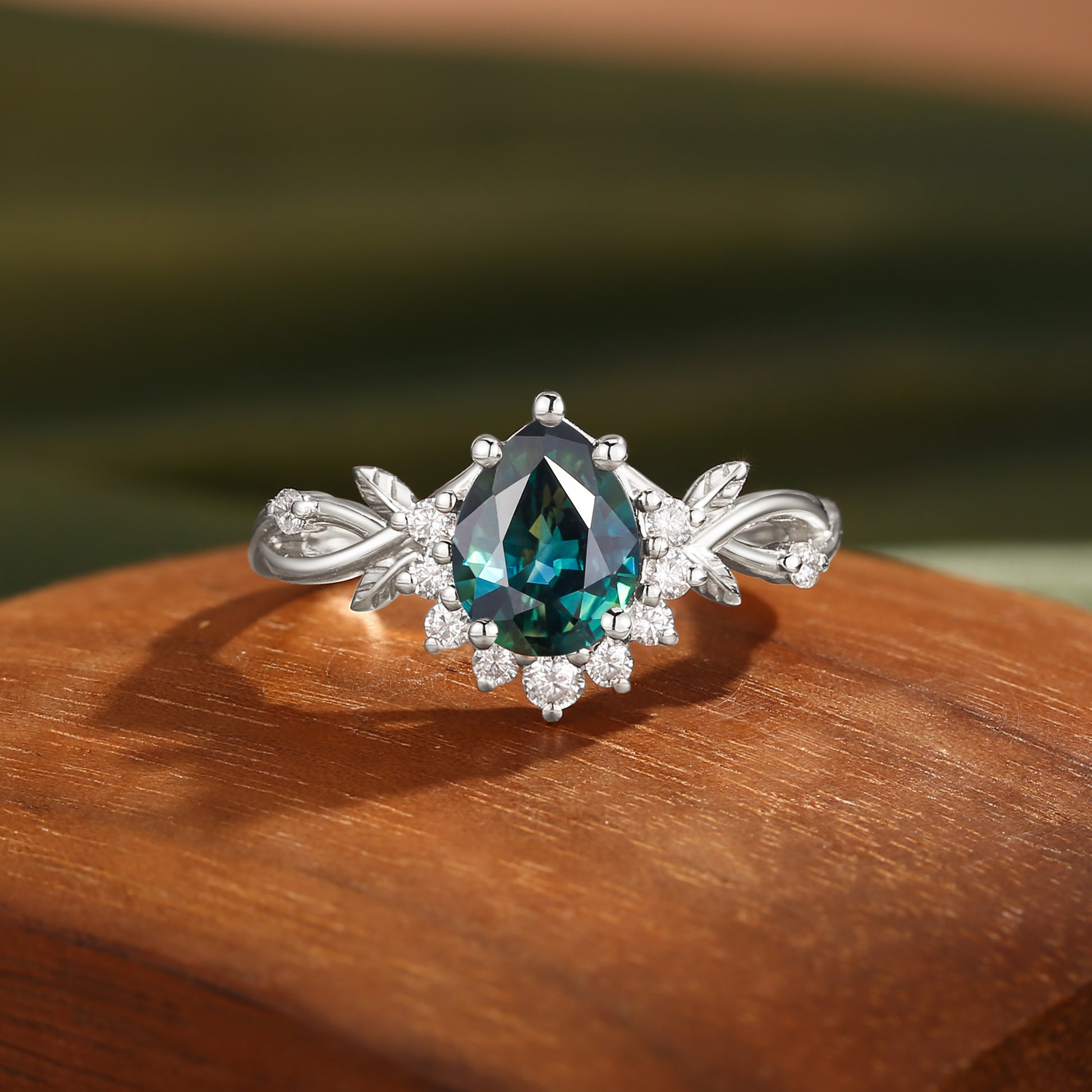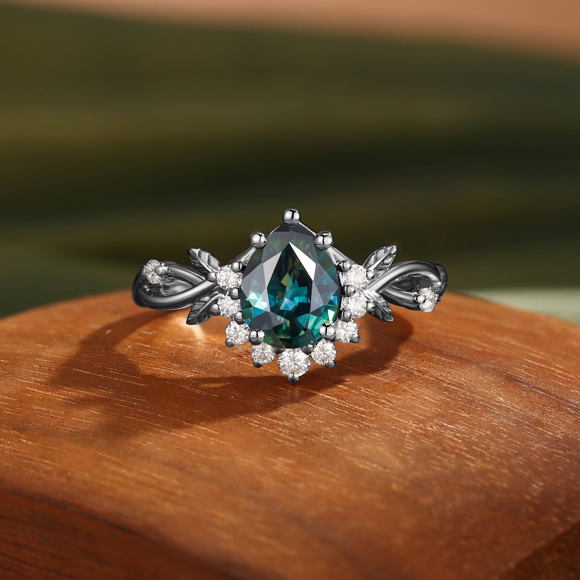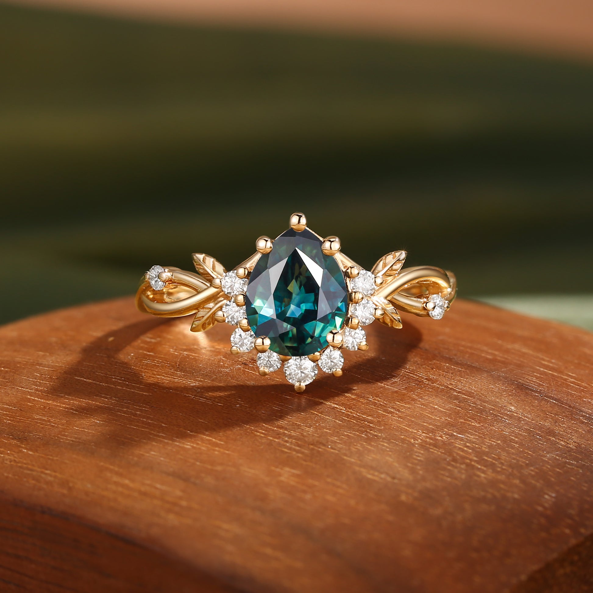 Drisana - 14K Pear Cut Natural Blue Green Sapphire Engagement Ring