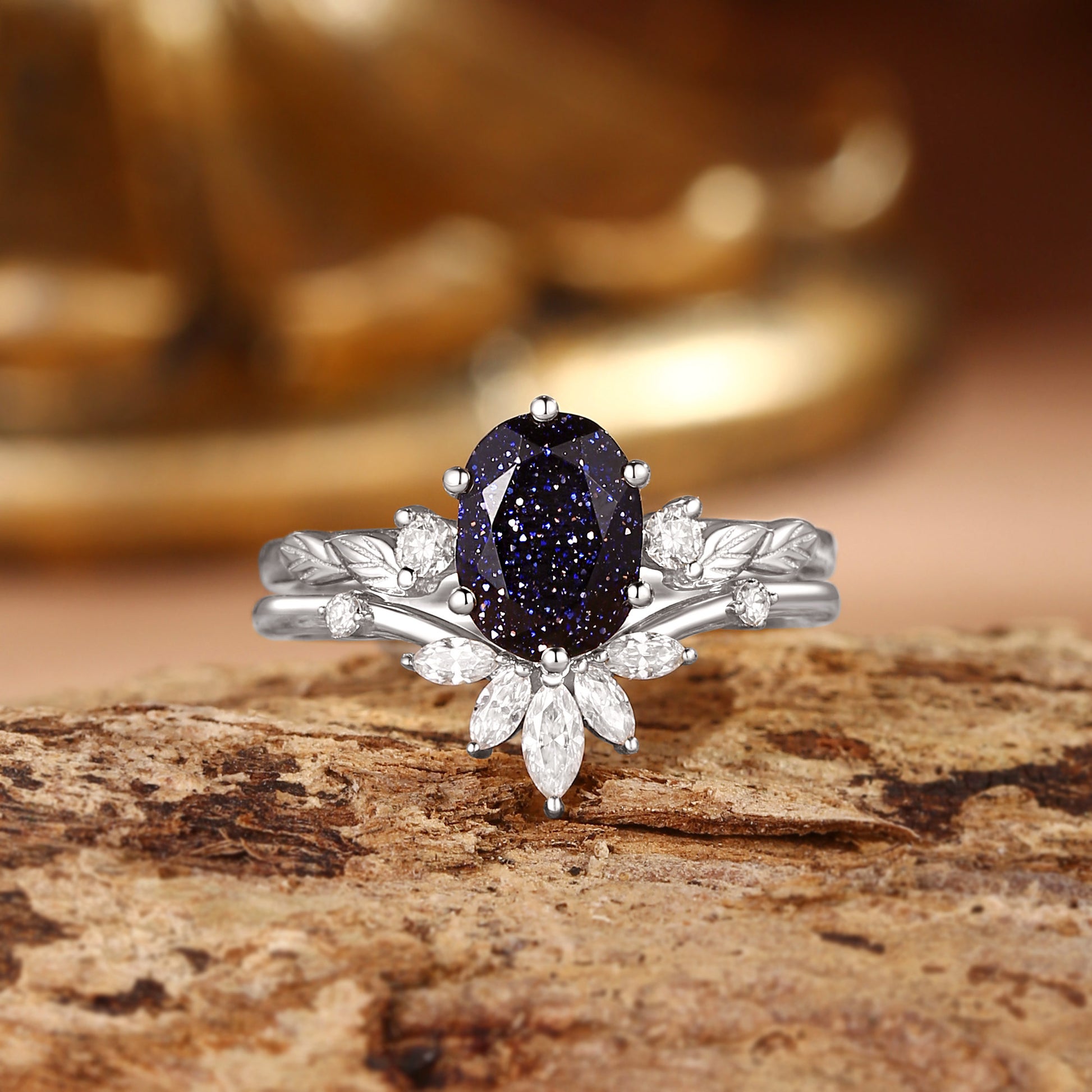 - Center Stone: Blue Sandstone, 6x8mm, oval cut.