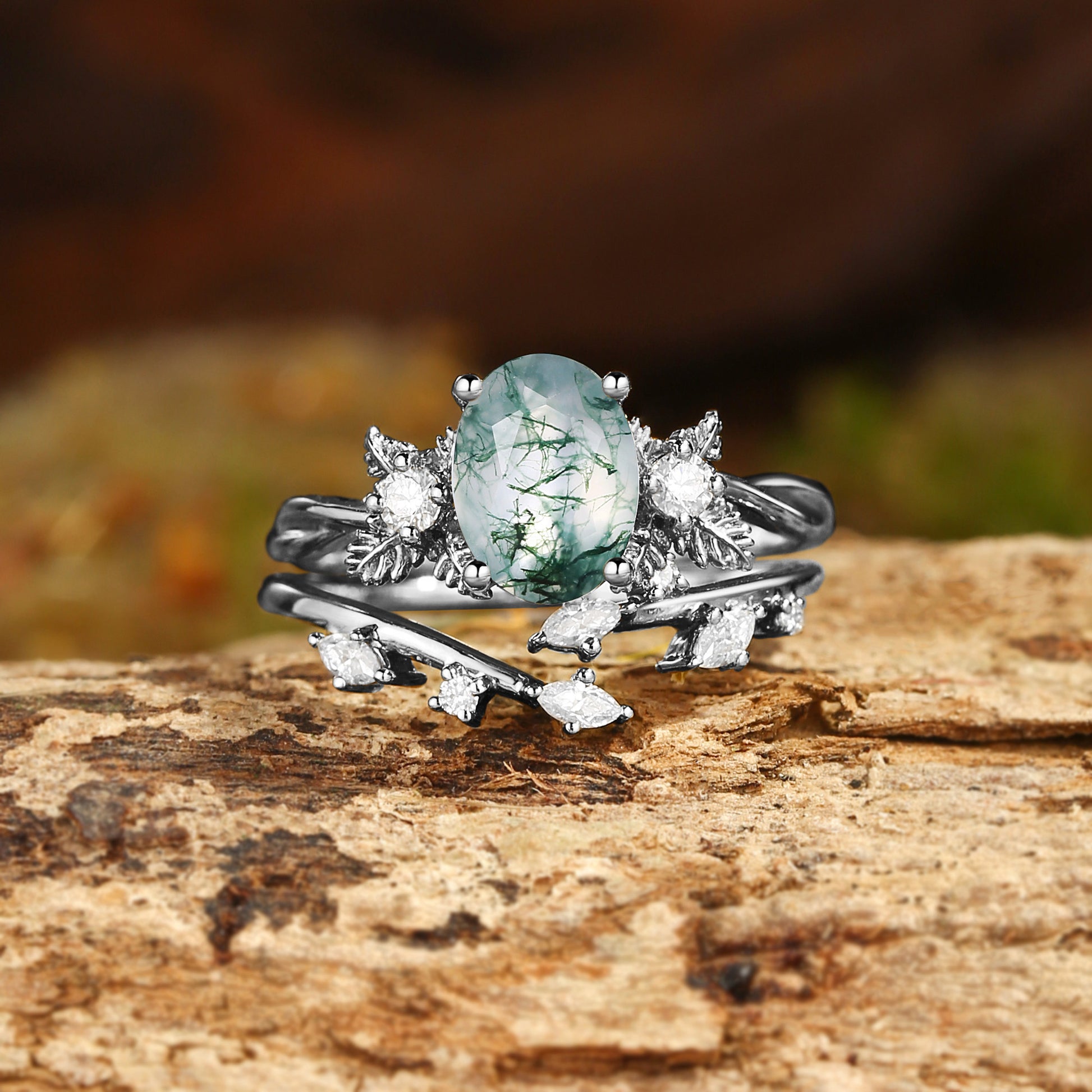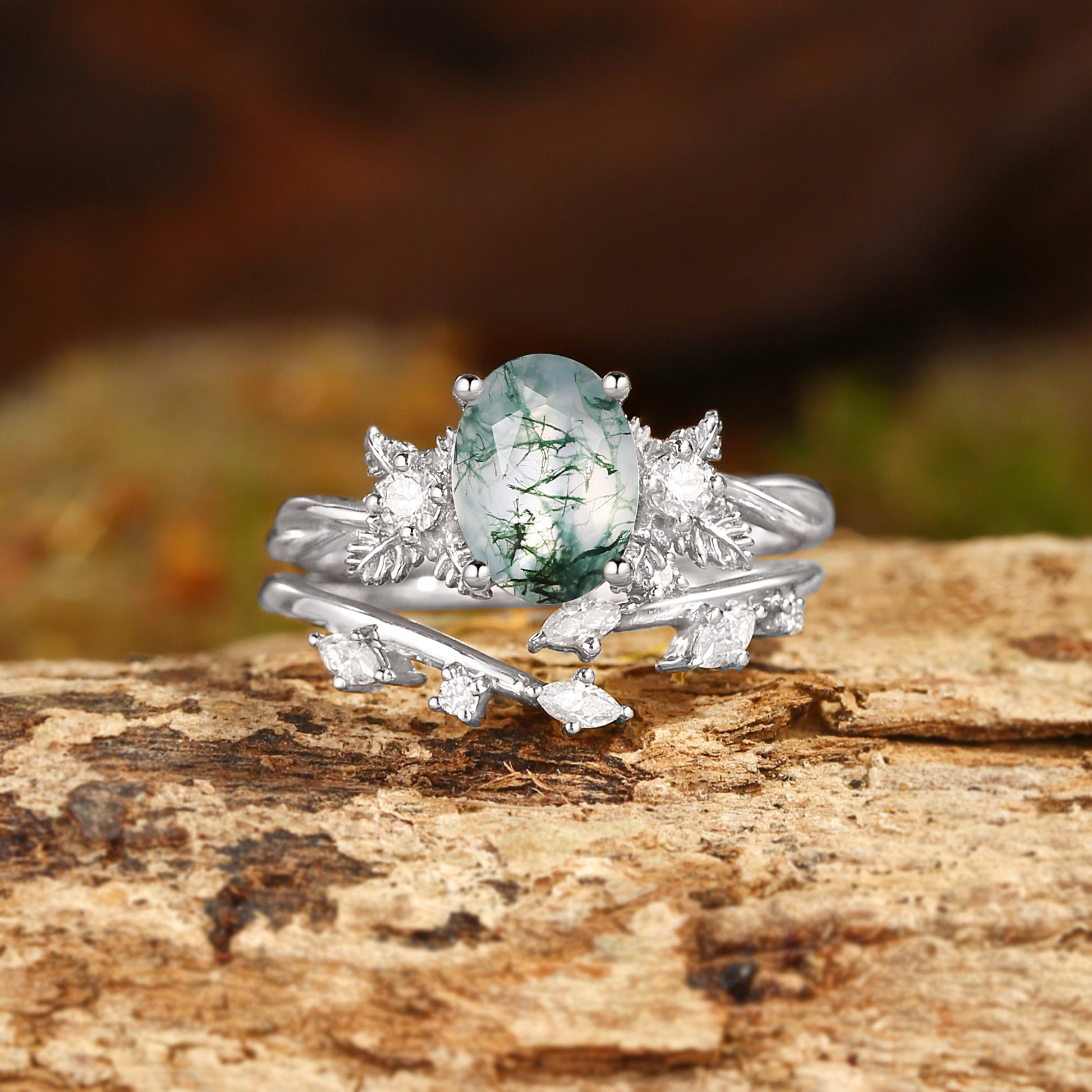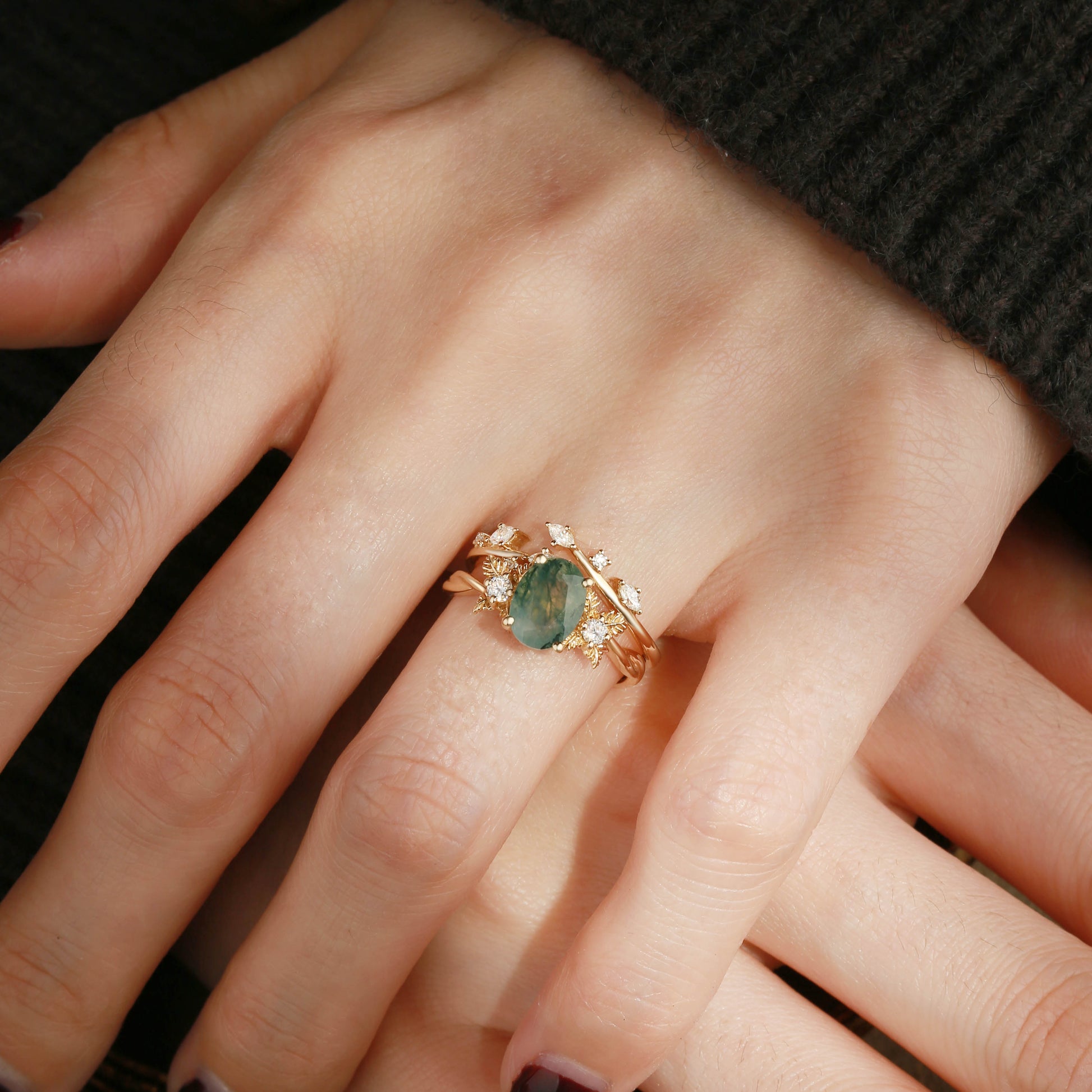 Flora - BlingFlare Oval Moss Agate Leafy Flower Engagement Ring Set 2pcs