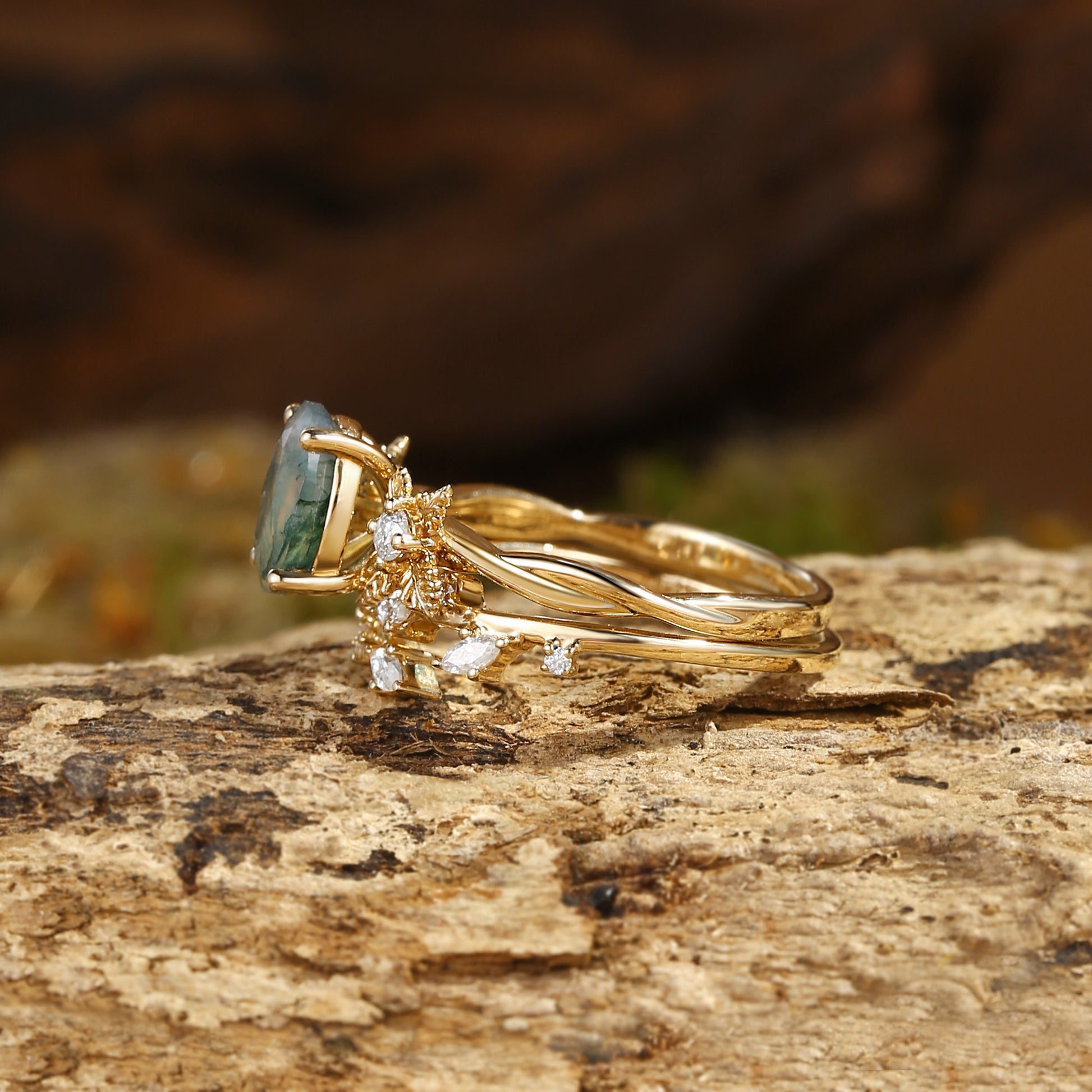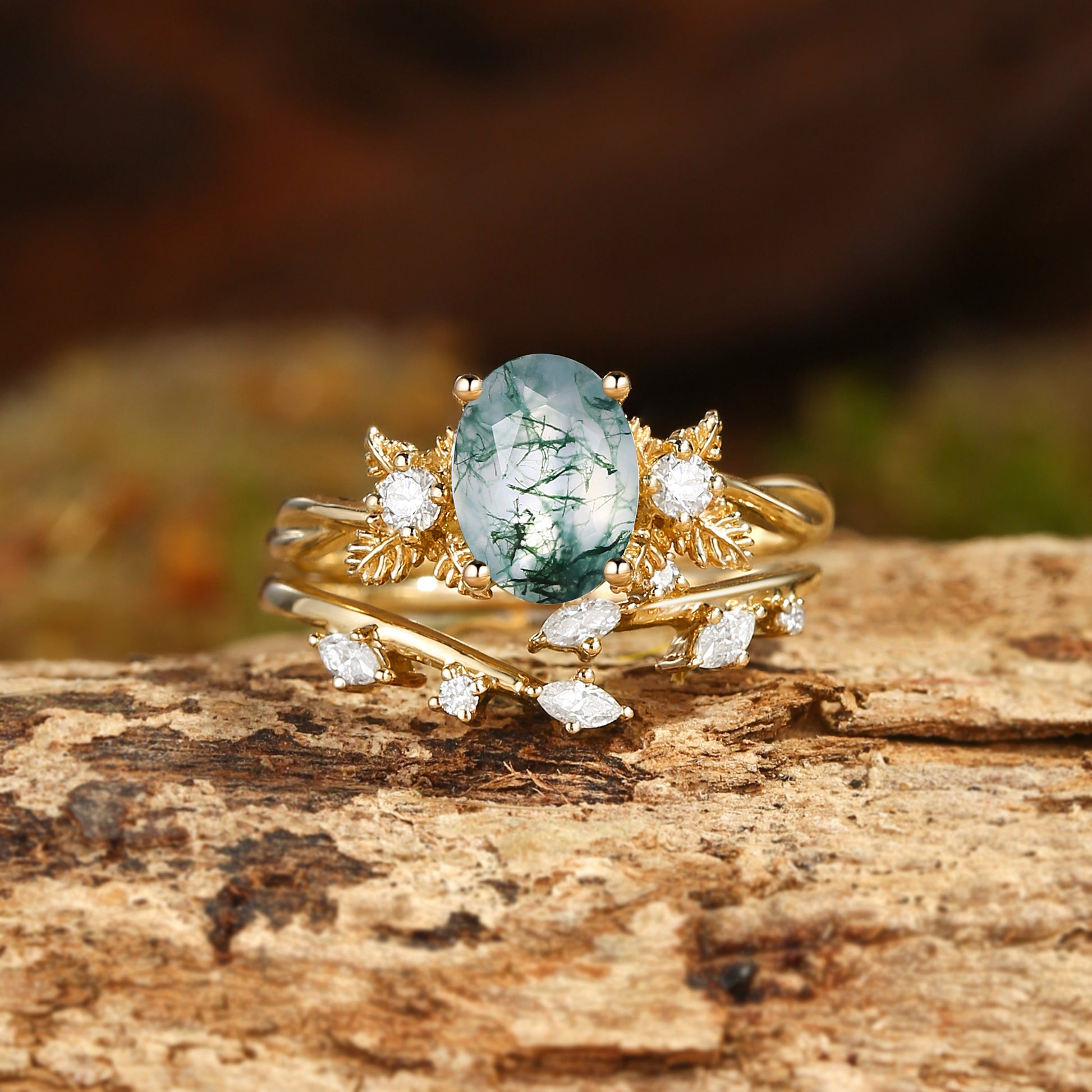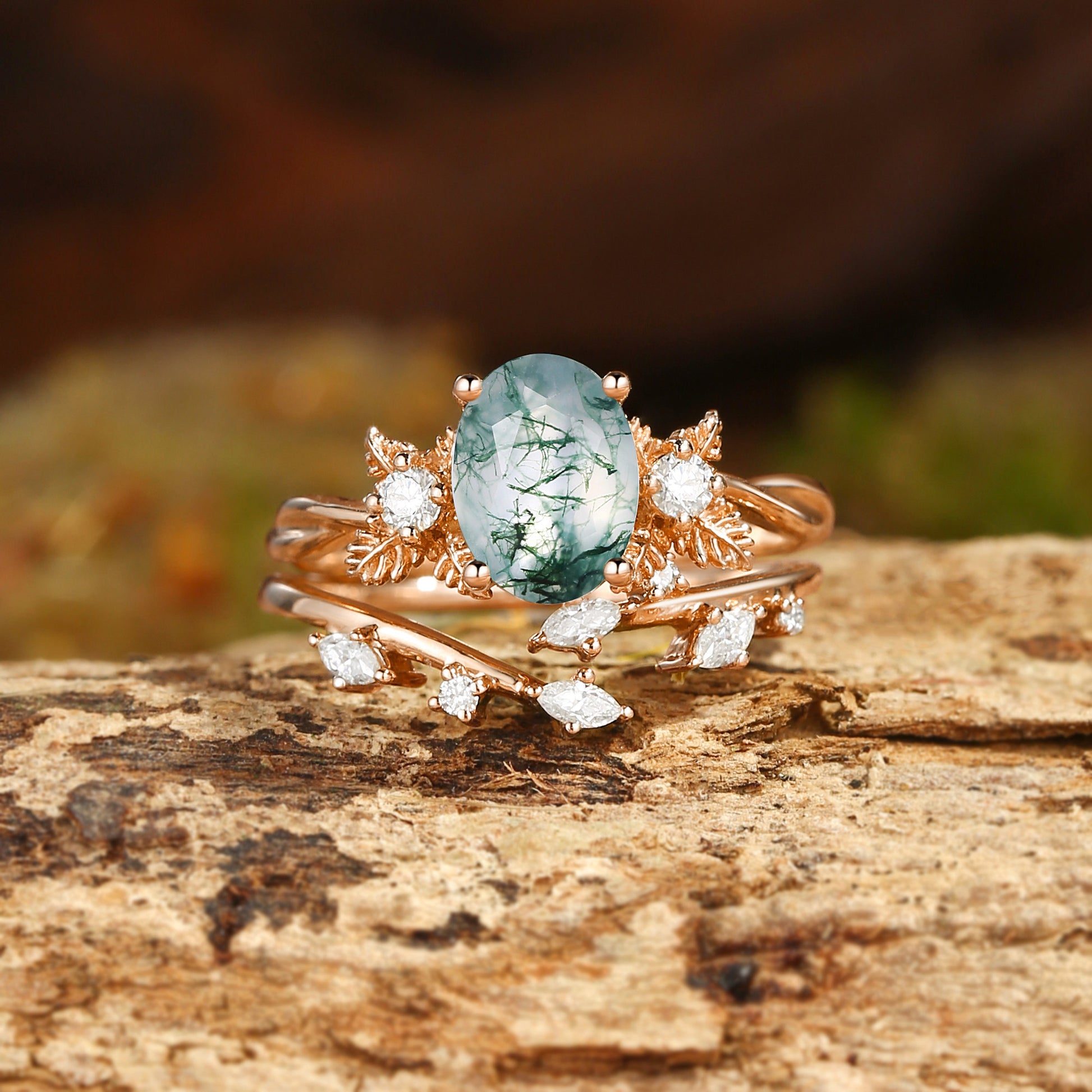 Flora - BlingFlare Oval Moss Agate Leafy Flower Engagement Ring Set 2pcs