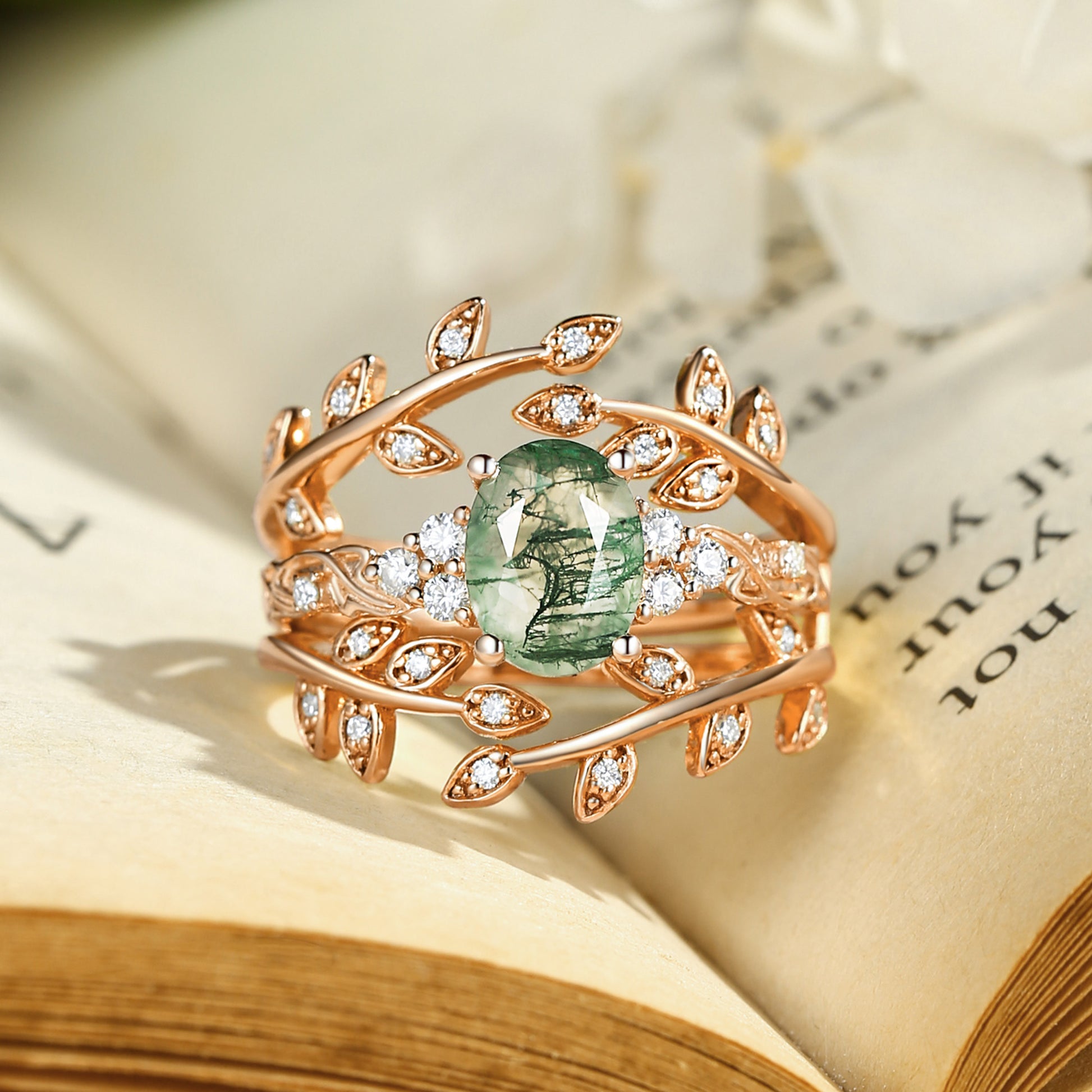 Honorée - Moss Agate Leafy Branch Enhancer Ring Set 2pcs