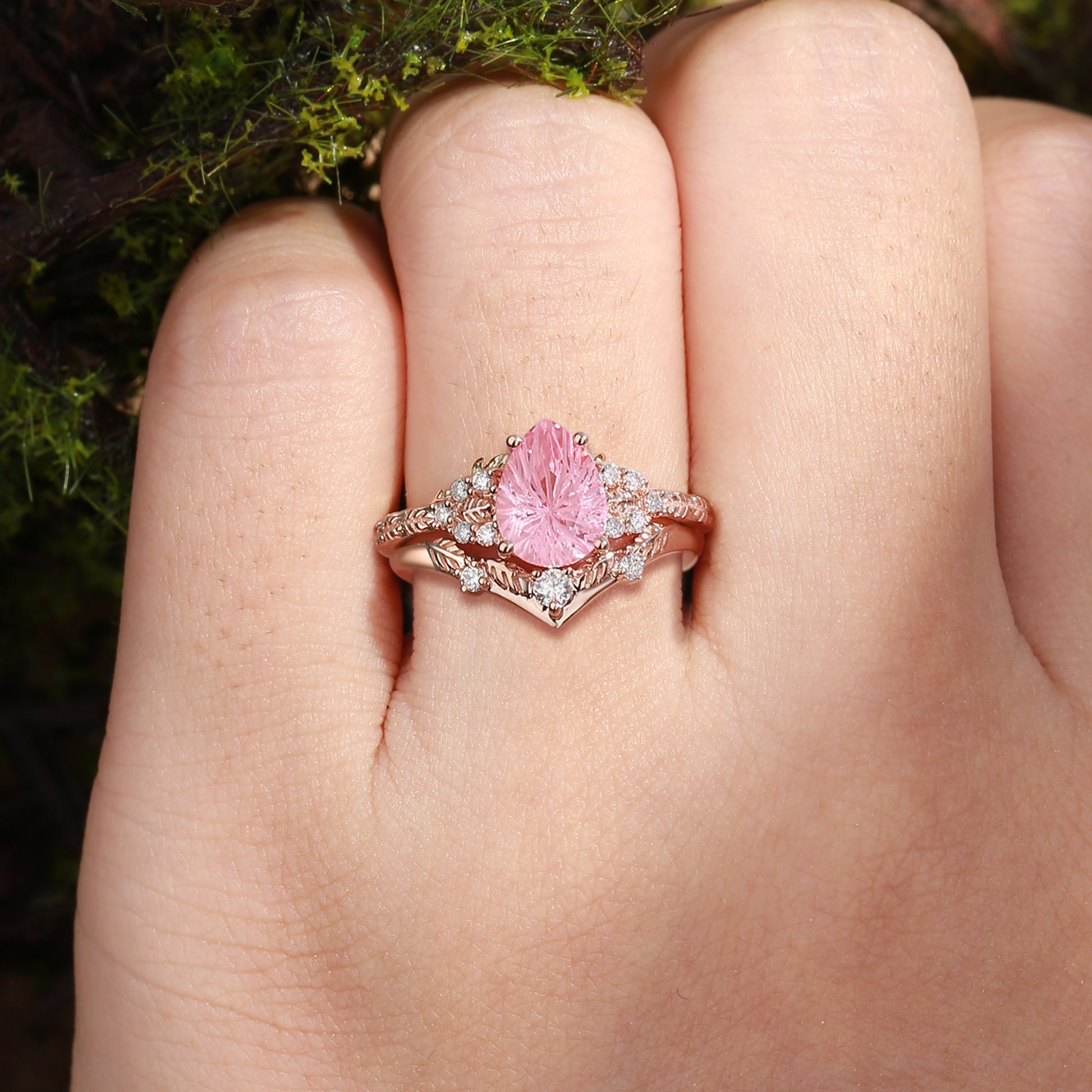 Celebrate your love with the Hortense engagement ring set, featuring a stunning firework-cut pink padparadscha sapphire that shifts colors like the changing seasons. Inspired by delicate leaves, this two-piece set captures the beauty of nature’s elegance, symbolizing growth and harmony. Perfect for those who cherish unique, meaningful jewelry that reflects the natural world.