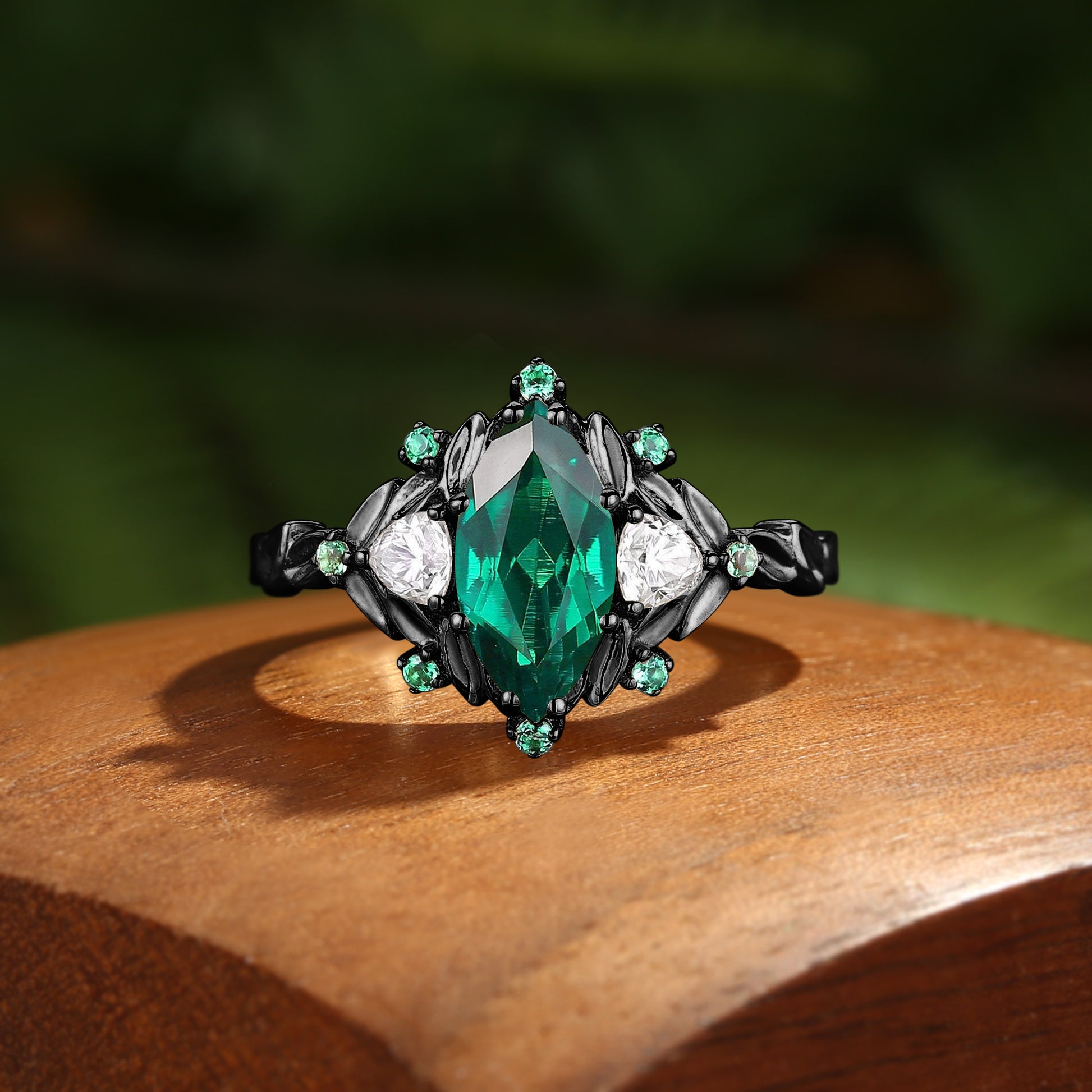 Jessamine - Marquise Lab Emerald Leaf Three Stone Branch Engagement Ring