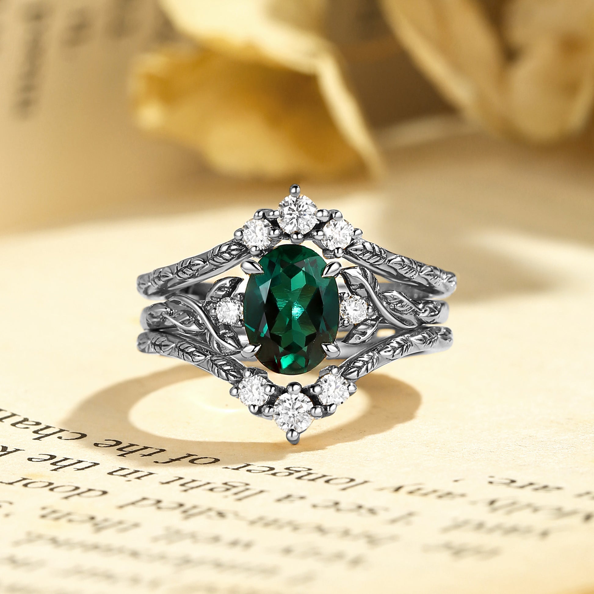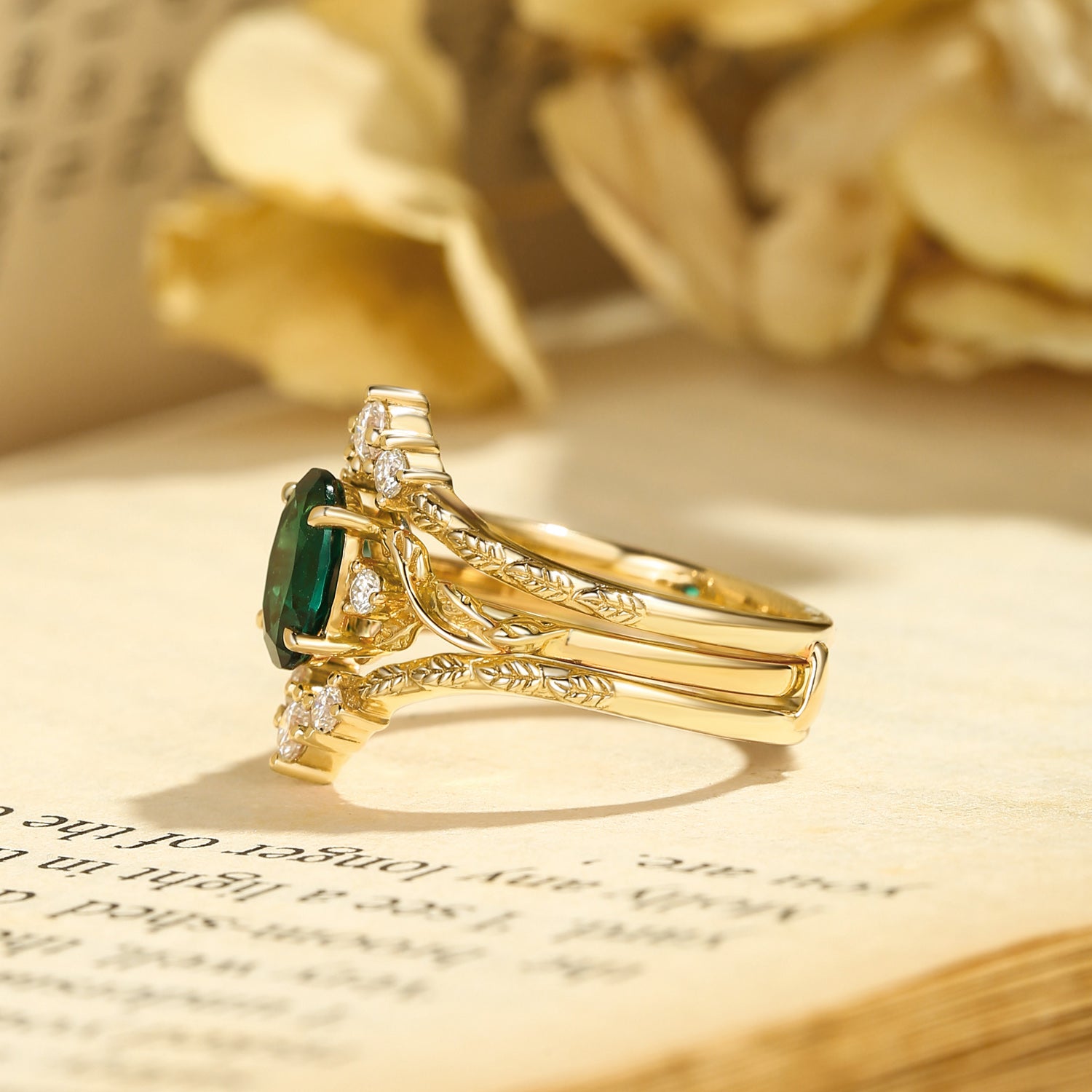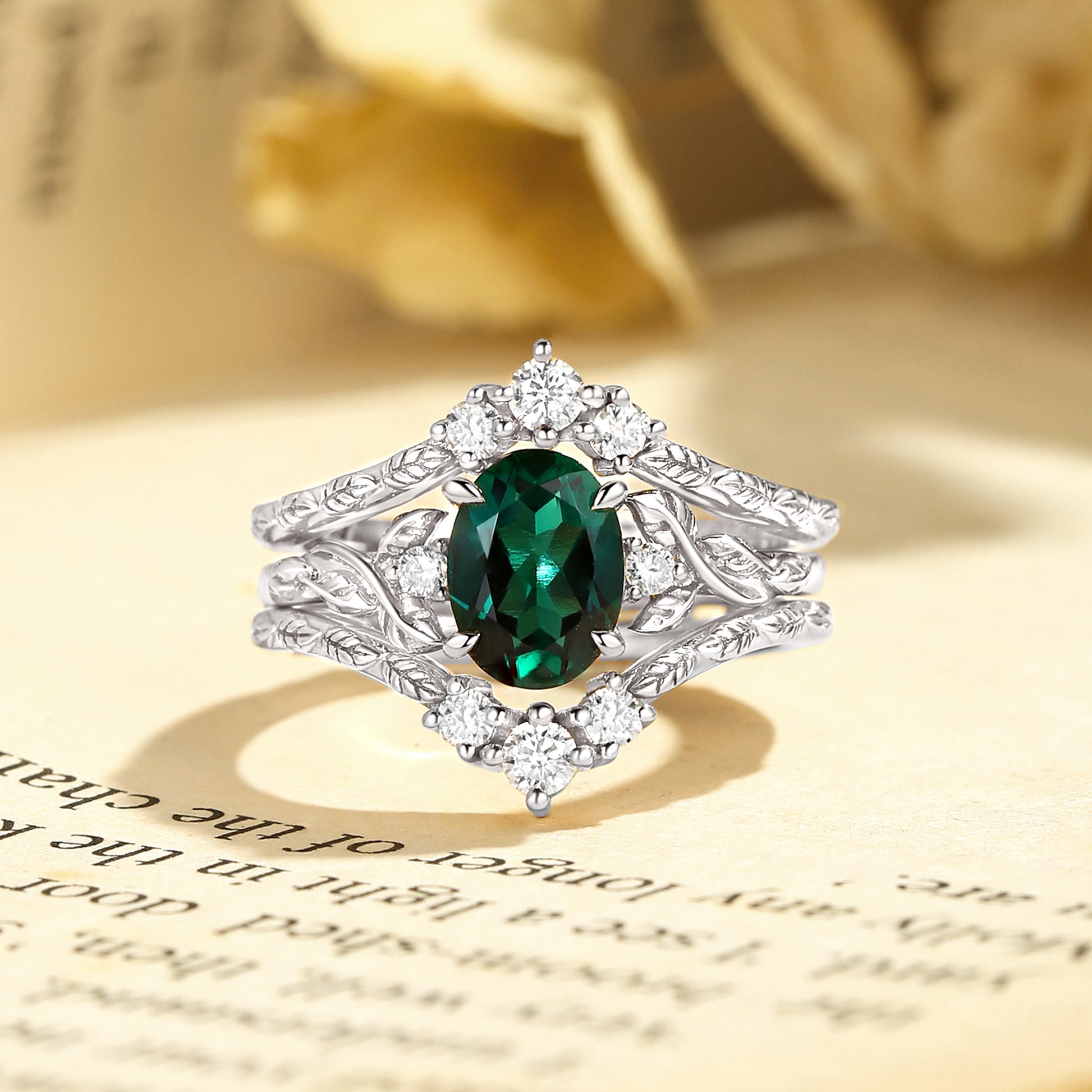 Josephine - Lab Emerald Oval Cut Leafy Filigree Bridal Set 2pcs