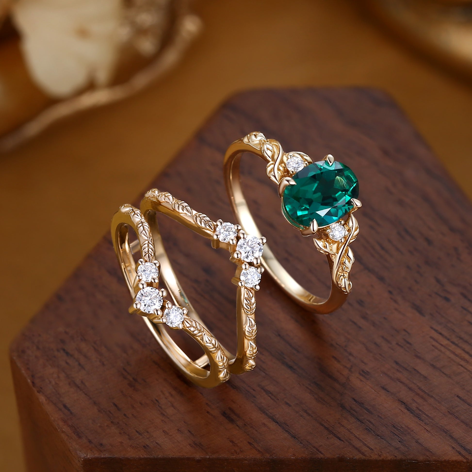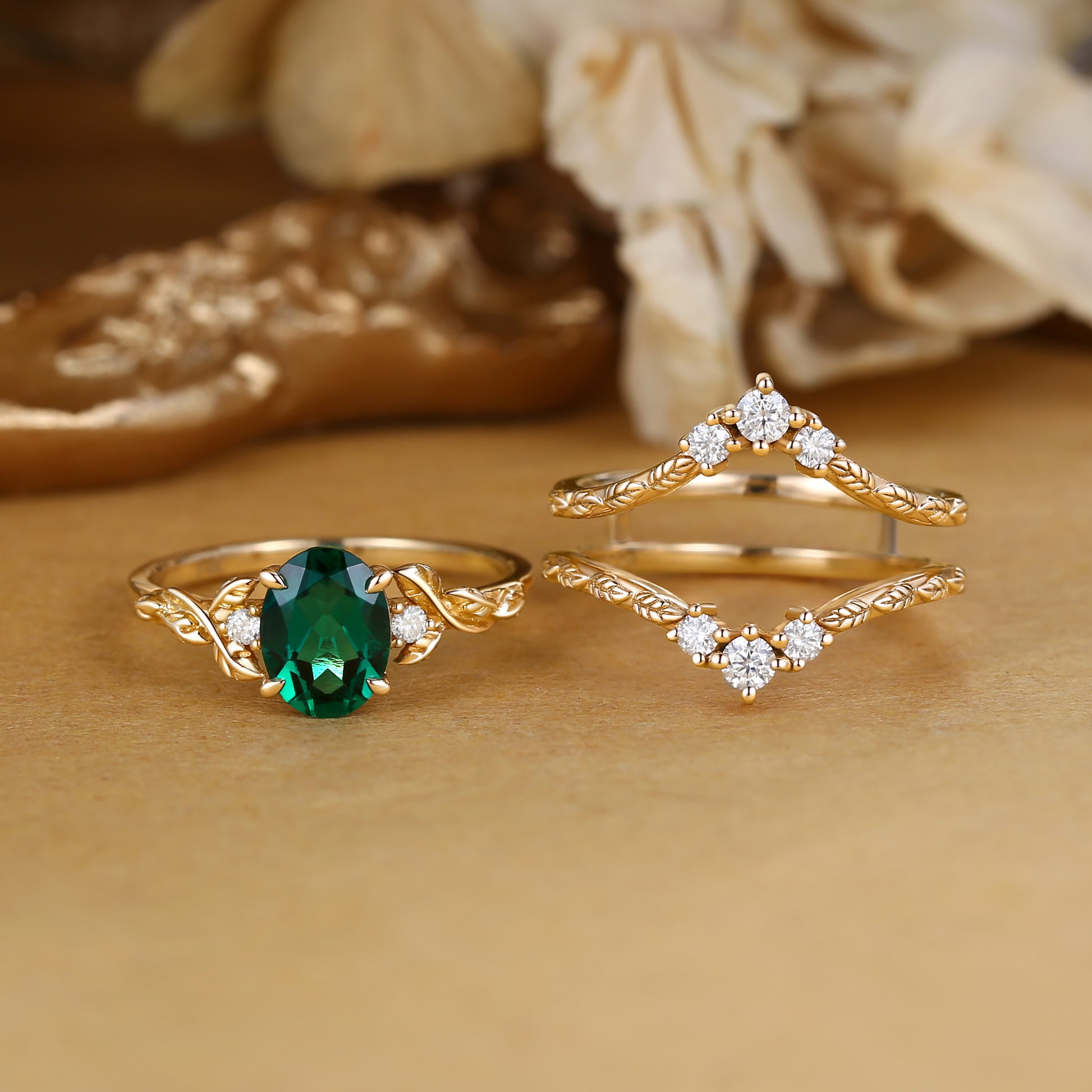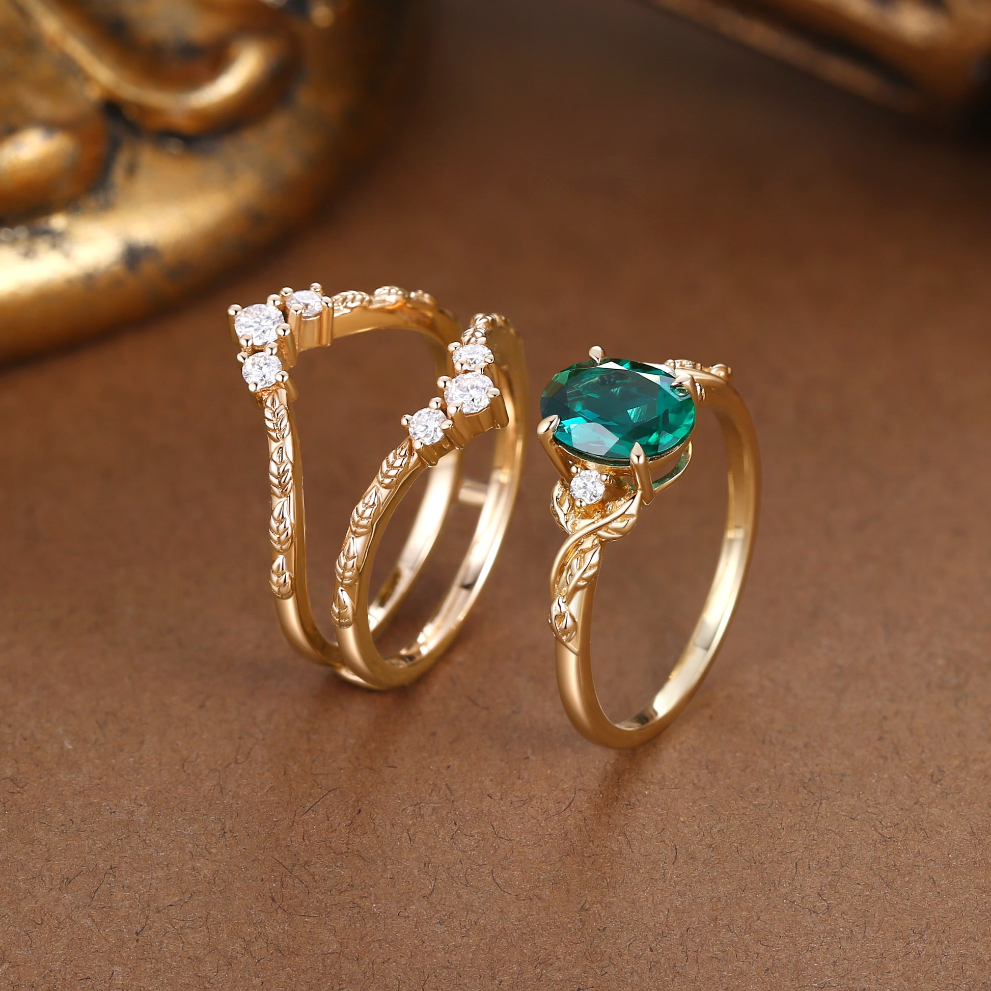 Josephine - Lab Emerald Oval Cut Leafy Filigree Bridal Set 2pcs