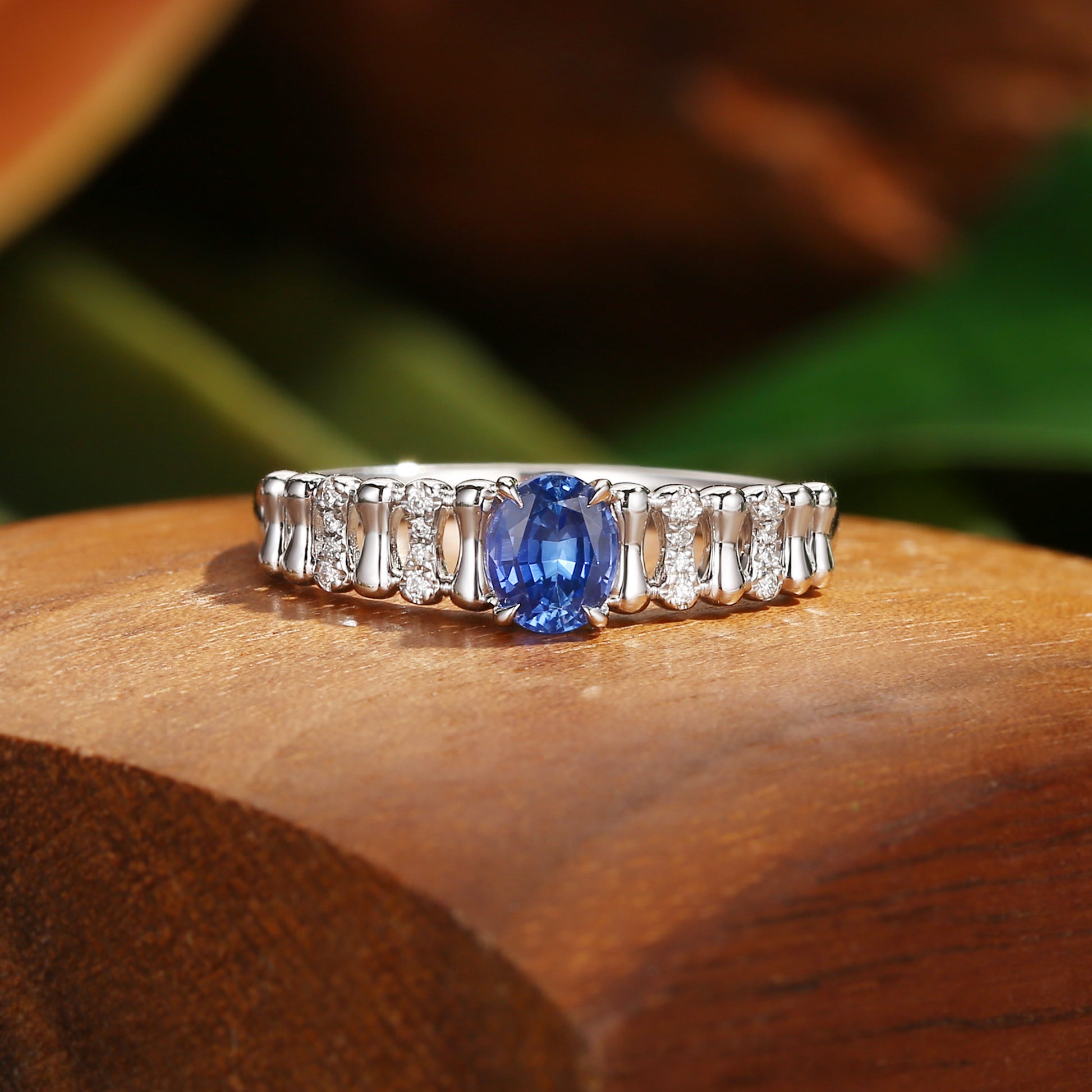 This Monet's Garden-Inspired ring features a stunning oval-cut lab-created royal blue sapphire set within a sleek link band. Expertly crafted, the design captures the timeless elegance of nature's beauty while offering durability and vibrant color. Ideal for those seeking a refined blend of classic style and modern sophistication.
