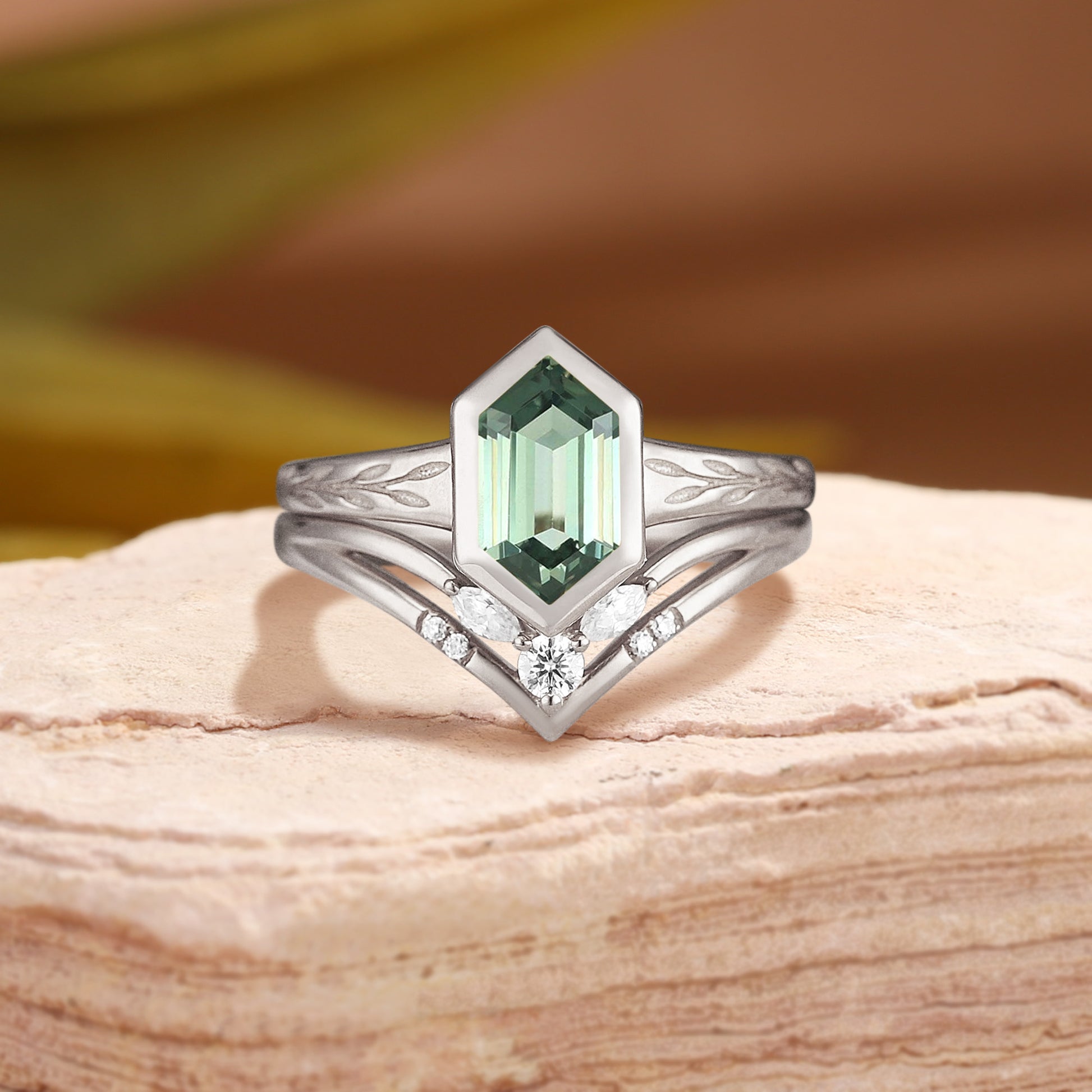 Ruelle - Green Sapphire Hexagon Cut Leaf Engraved Promise Ring Sets