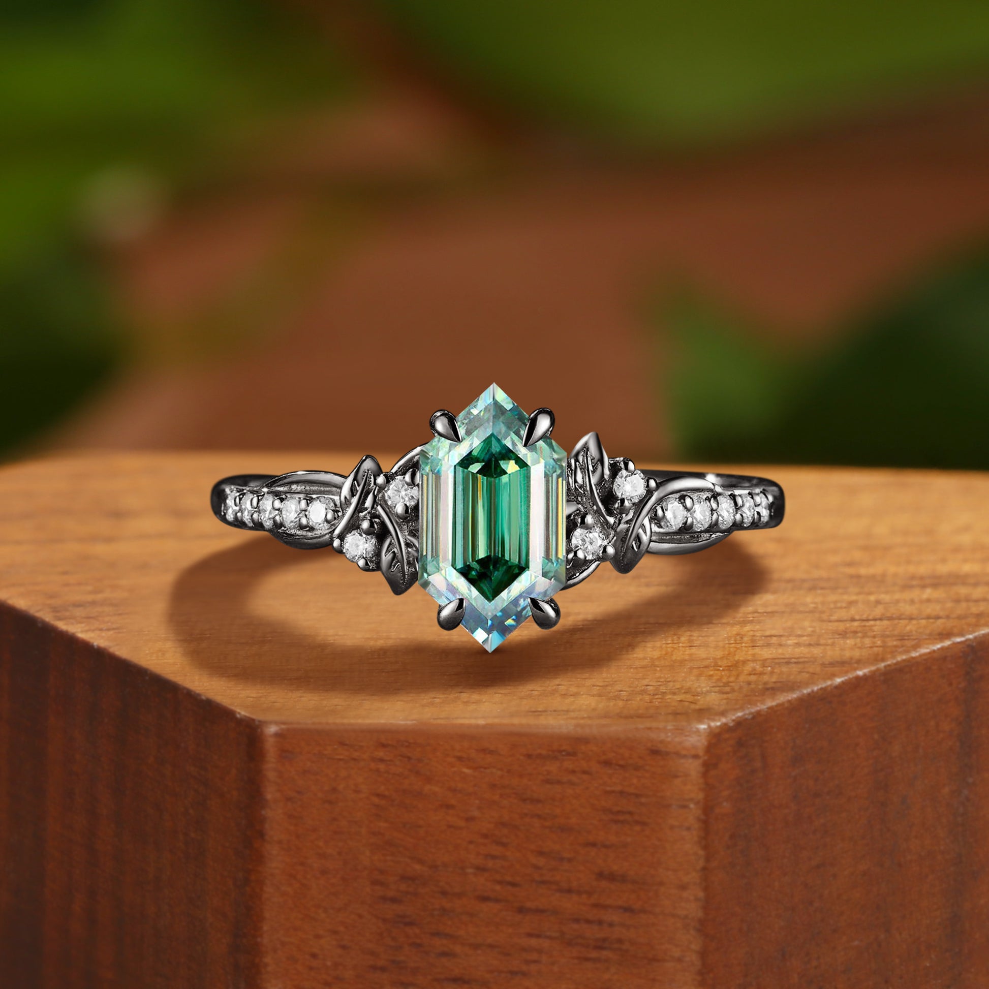 - Center Stone: Green Moissanite, 5x9mm, hexagon cut.