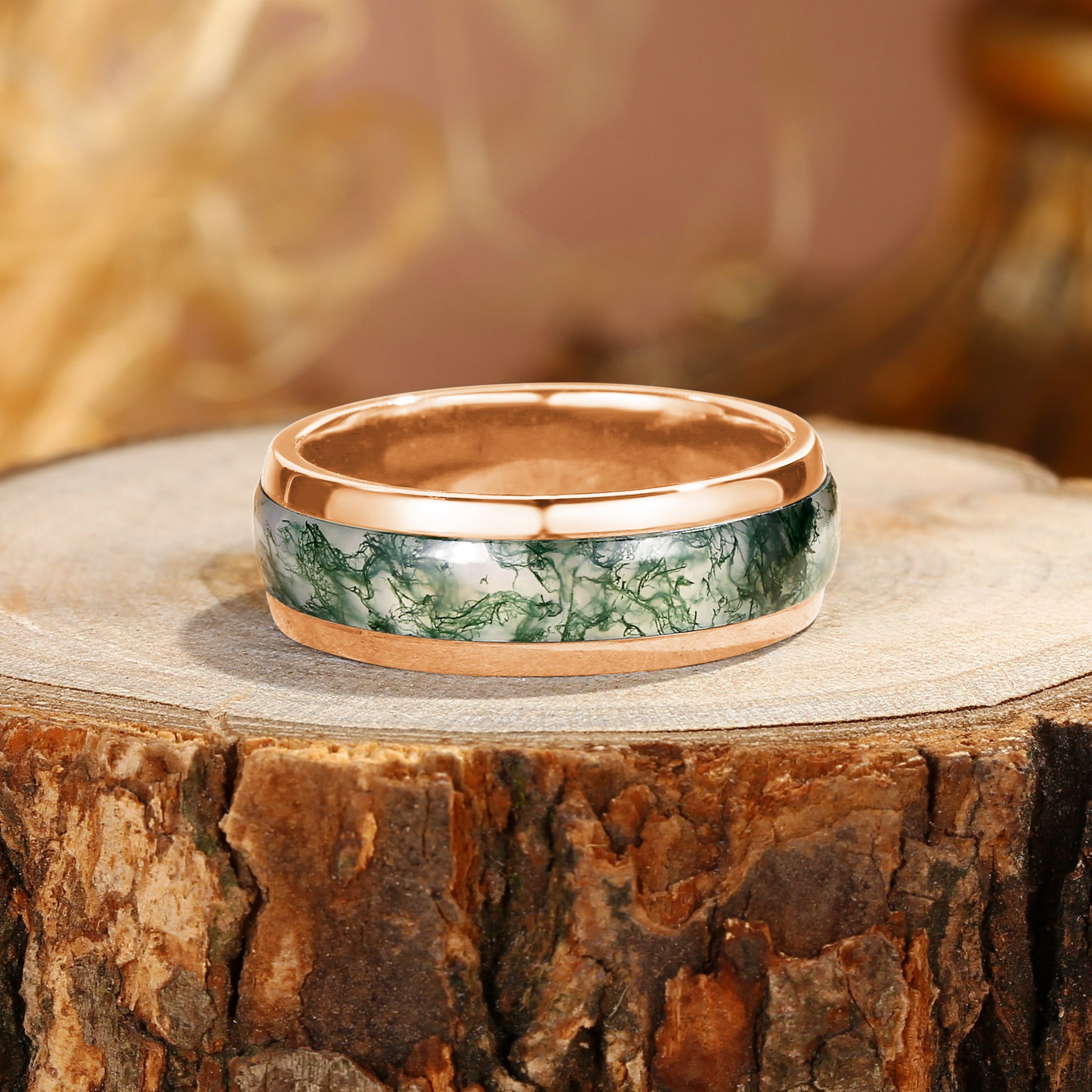 Unleash the power of nature with our 7MM Moss Agate Inlay Black Gold Men Rings. The mesmerizing moss agate inlay, set in sleek black gold, exudes a grounding energy that connects you to the earth's vitality. Adorn yourself with this truly unique and poetic piece