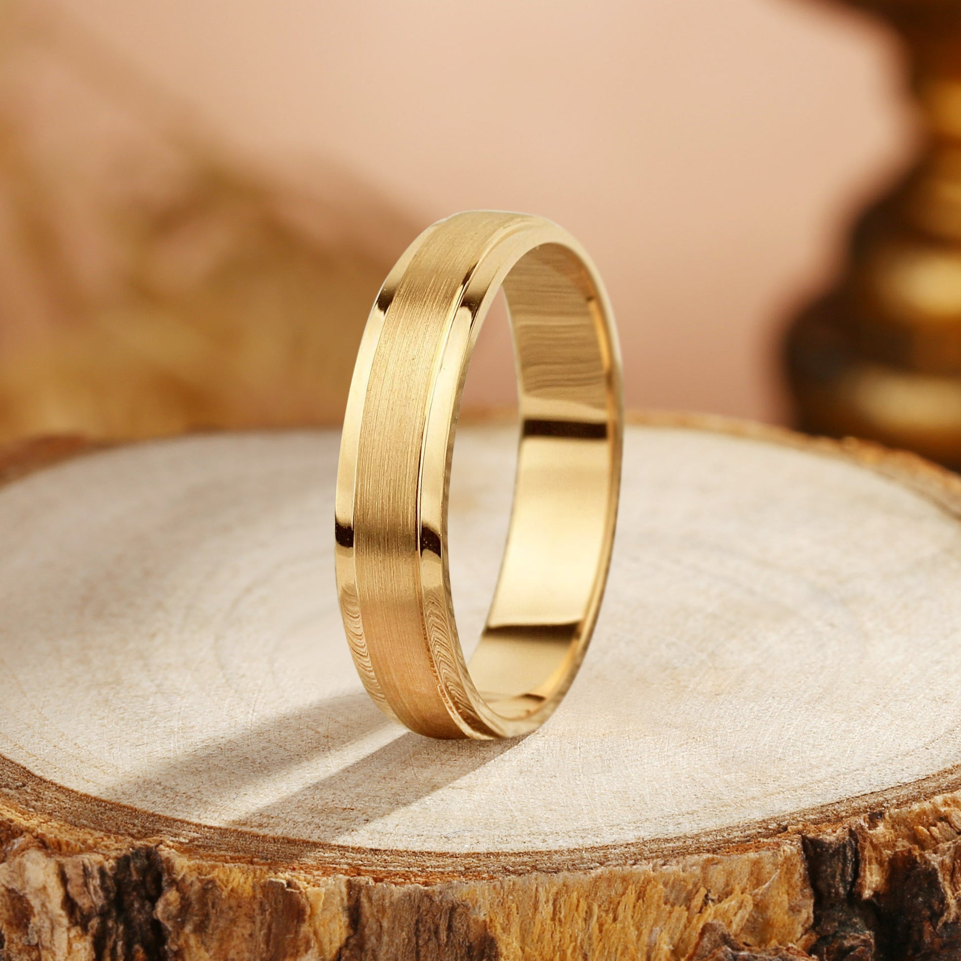A stylish men's wedding band with a brushed gold center and polished edges draws inspiration from the harmony of nature and refinement. The brushed gold evokes rugged landscapes, while the polished edges reflect timeless elegance, symbolizing the balance of strength and sophistication in love.