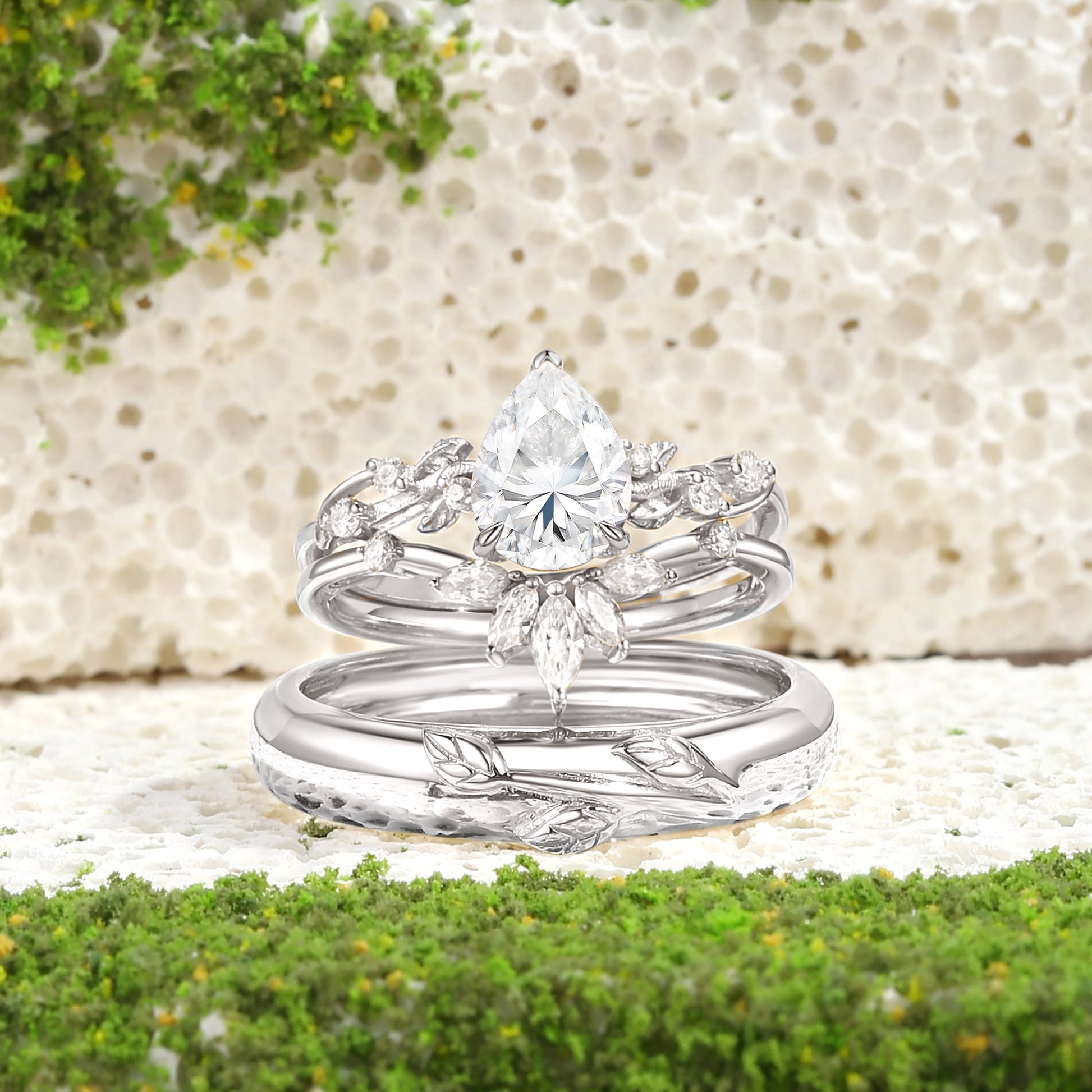 Clarissa - Moissanite Pear Cut Leafy Gold Couple Ring Set