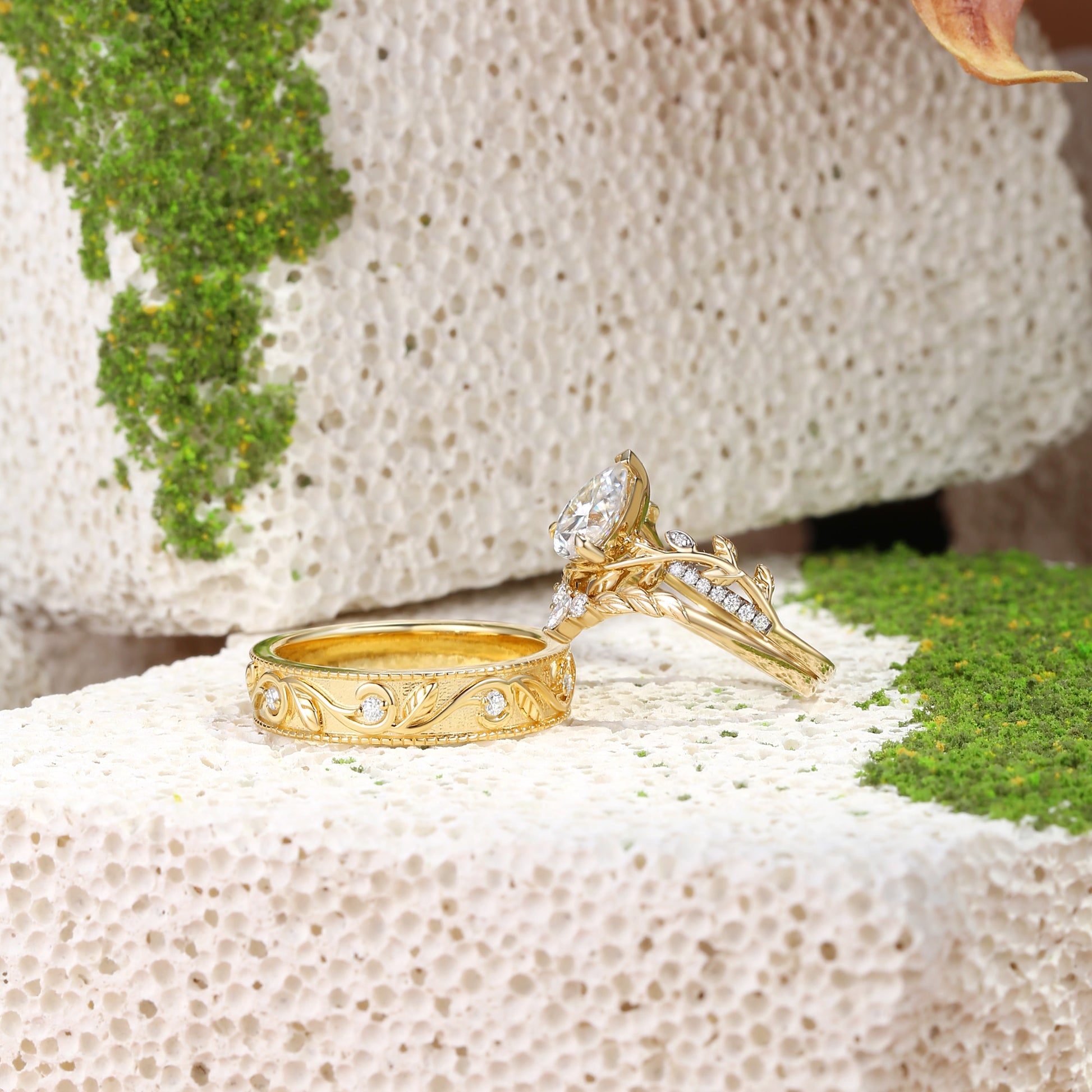 This elegant couple ring features a stunning pear cut moissanite cluster set, perfect for those who want to express their love in a unique and timeless way. Crafted with precision, these rings symbolize the eternal bond between two individuals. Made with high-quality materials, this set is sure to make a lasting statement.