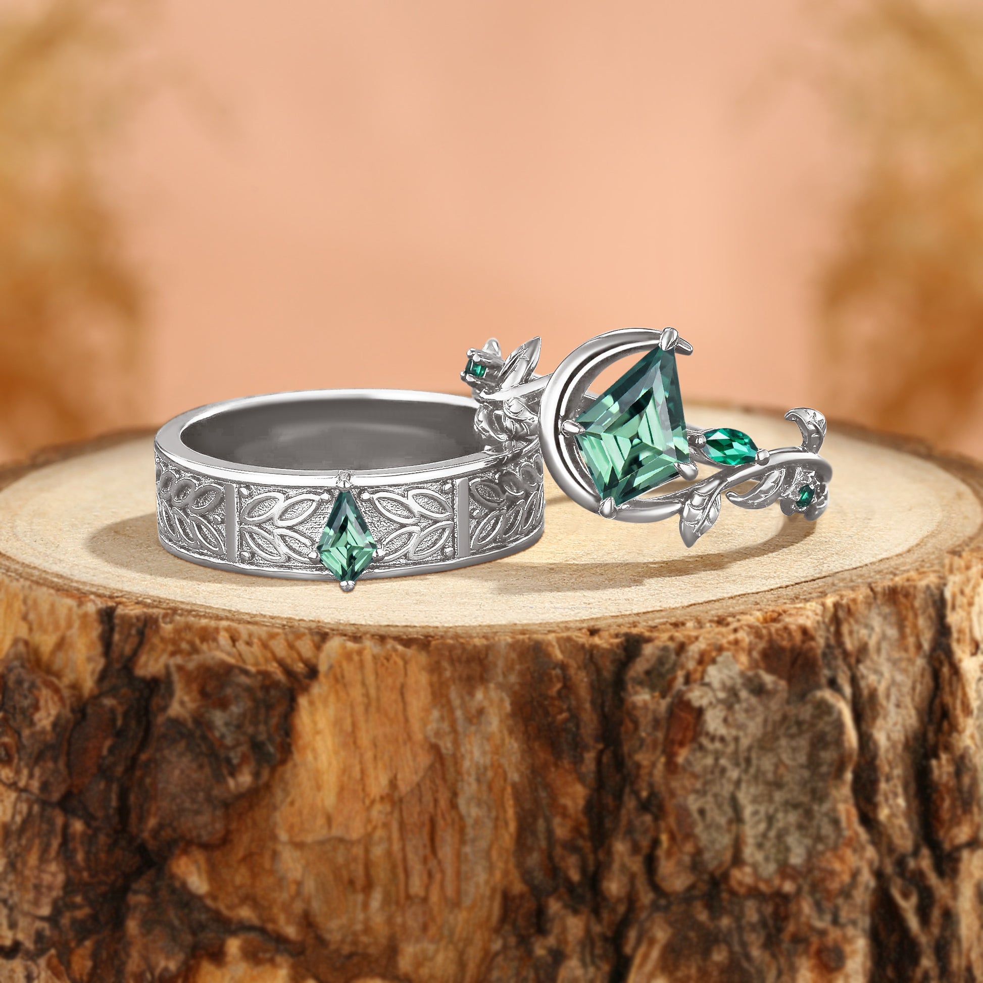 Kit - Kite Cut Green Sapphire Leafy Inspired Couple Ring Set