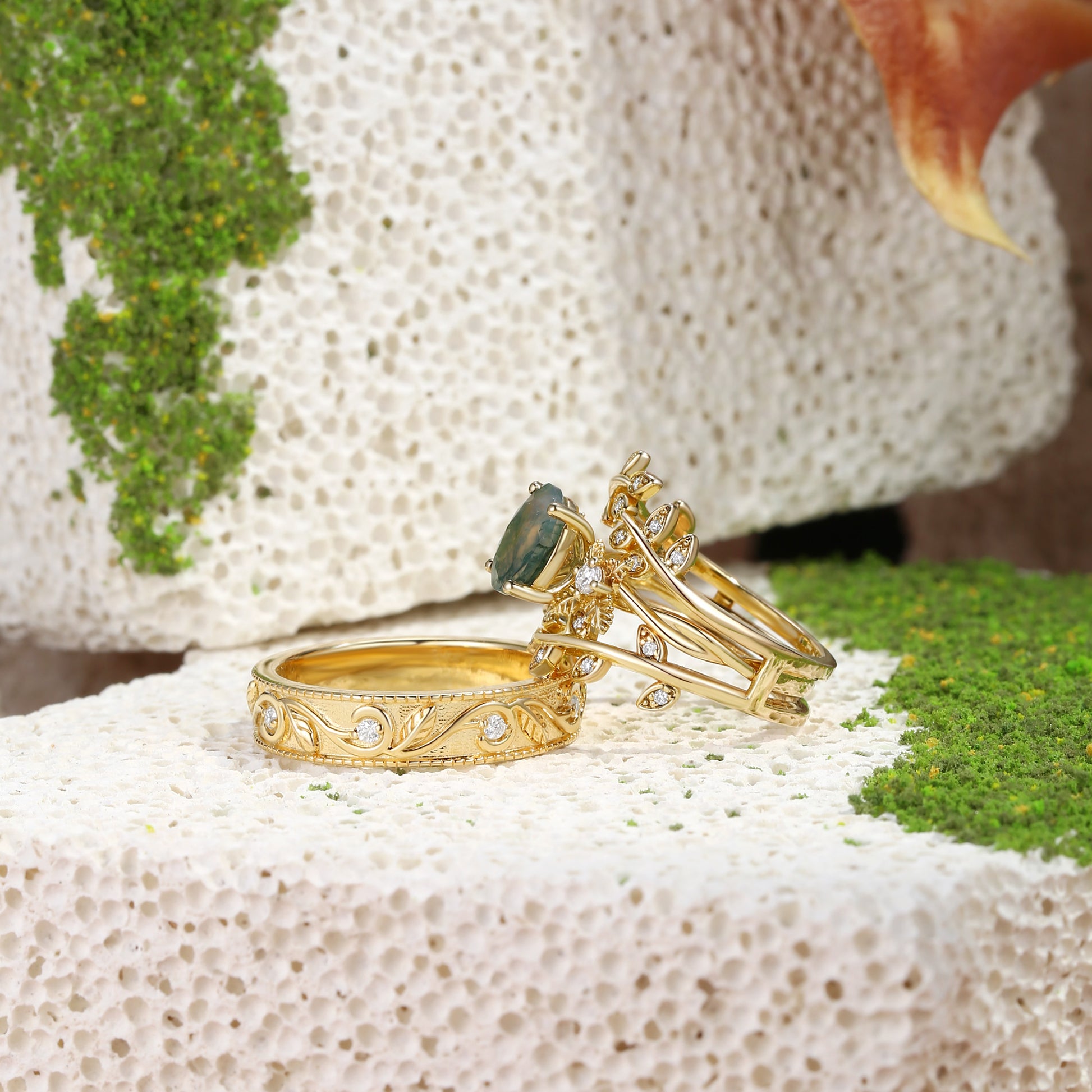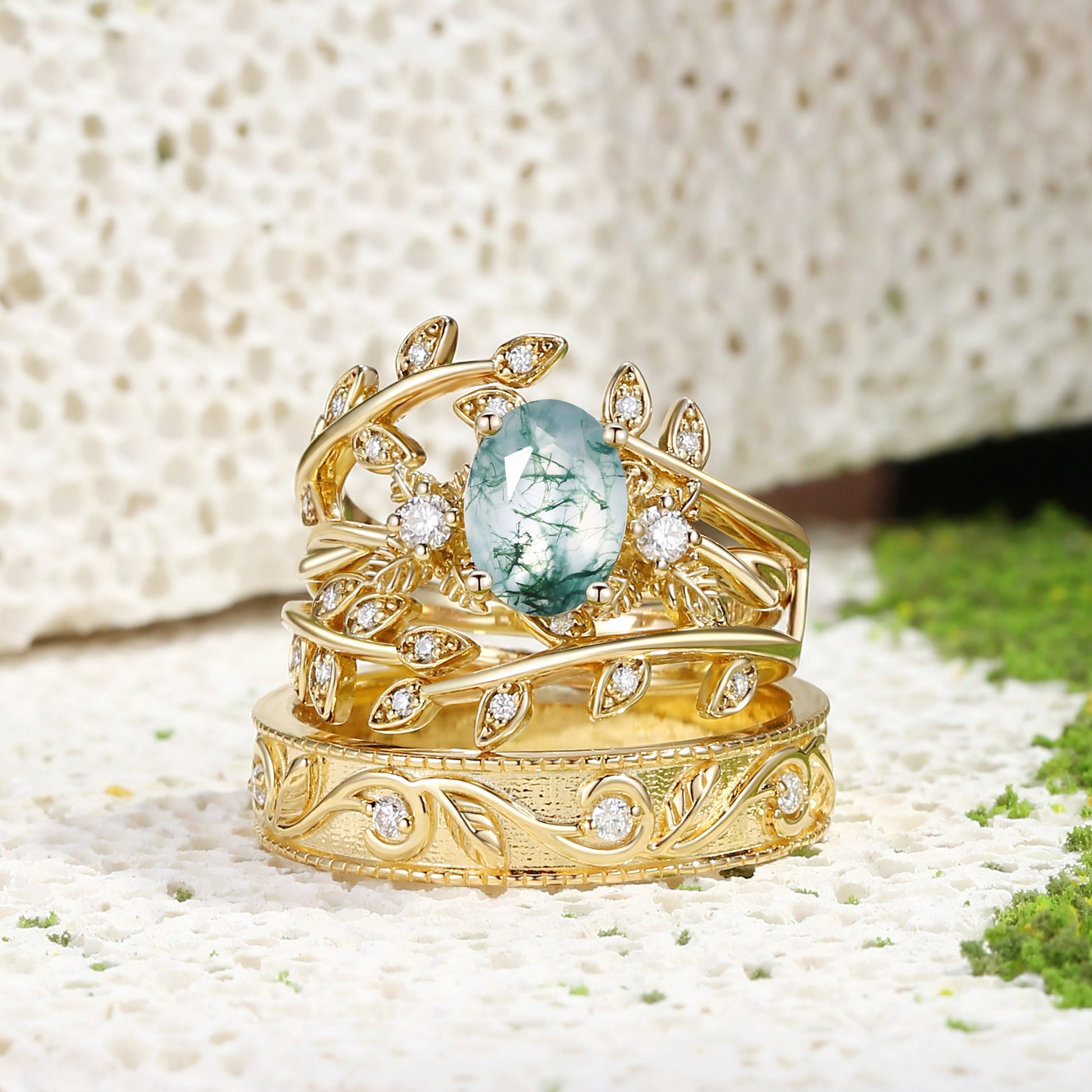 Léonie - Oval Cut Moss Agate Leafy Couple Ring Set