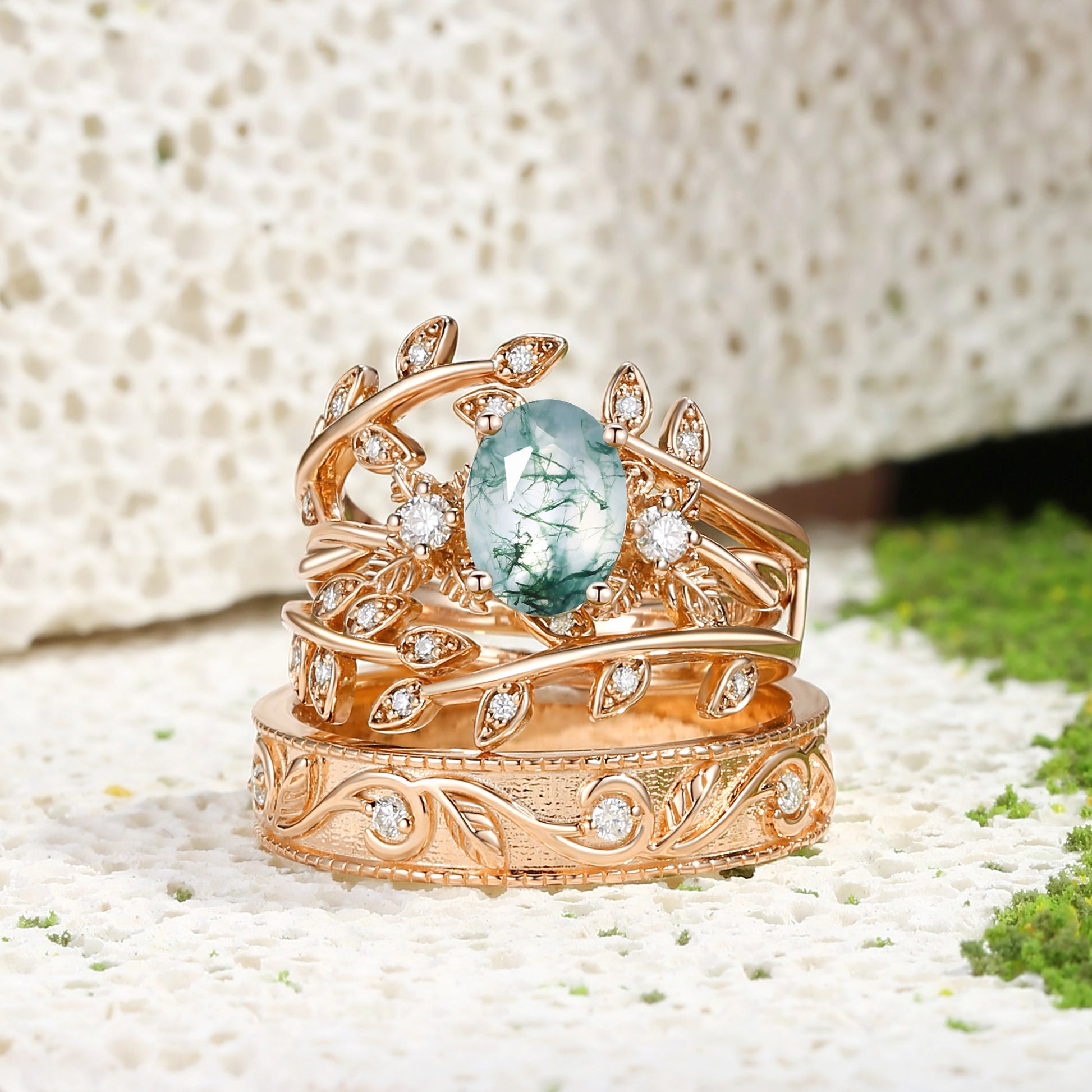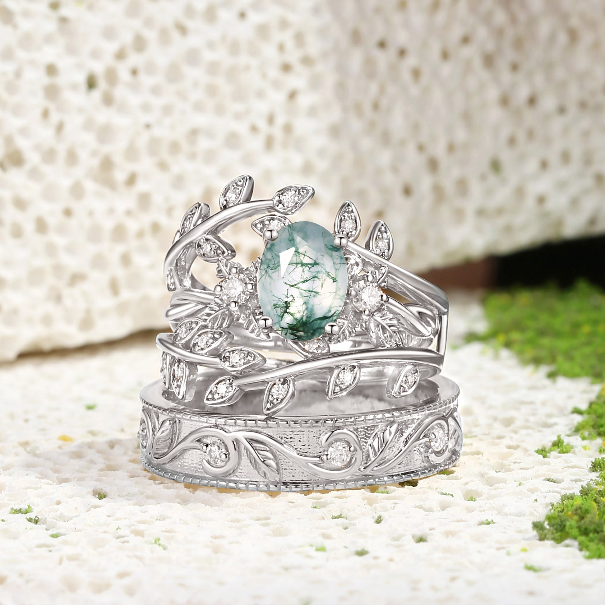 Couple Ring - Oval Cut Moss Agate Leafy Couple Ring Set