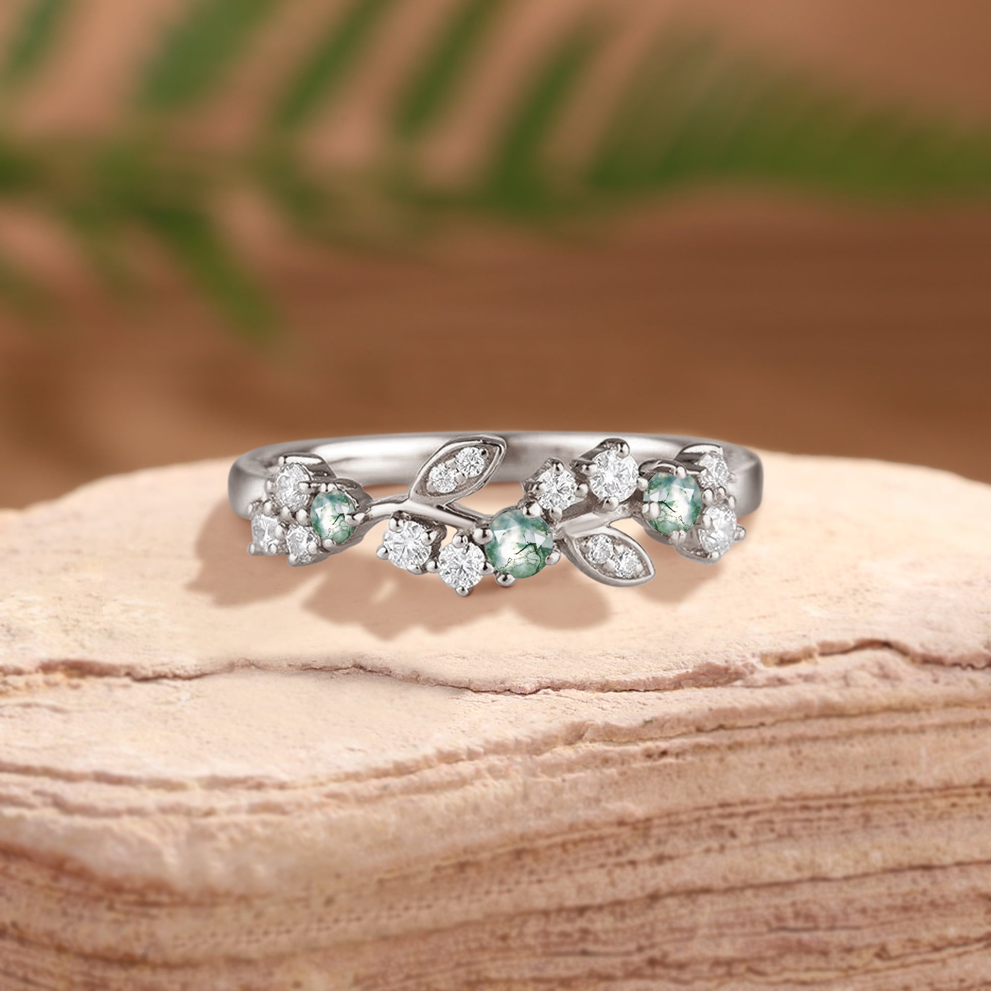 Celebrate the natural beauty of your union with the Grape Vine Moss Agate Wedding Band. Inspired by the intricate patterns of grapevines, this band features moss agate’s earthy hues and organic textures, symbolizing growth and enduring love rooted in nature’s elegance.
