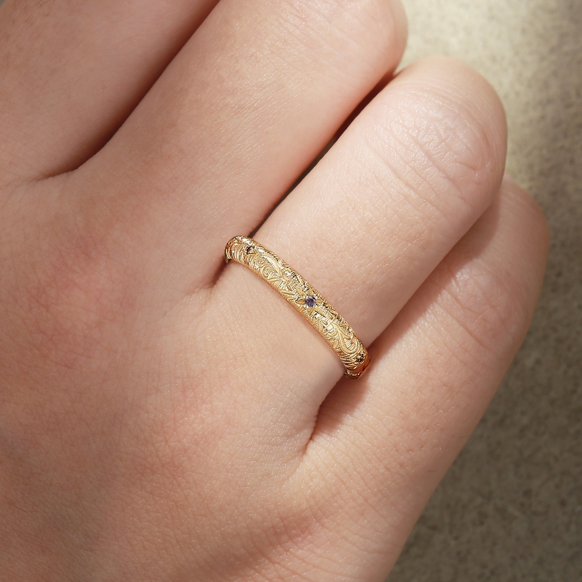 This ring draws inspiration from the raw beauty of nature, where no two elements are alike. The hand-carved textures mimic organic patterns—like weathered stone or flowing water—each groove thoughtfully crafted to create a one-of-a-kind piece. At its heart, the color-changing Alexandrite reflects nature’s magic. Together, the textures and stone evoke a sense of timeless elegance, blending artistry with the unpredictable wonder of the natural world. A tribute to uniqueness, designed to captivate.
