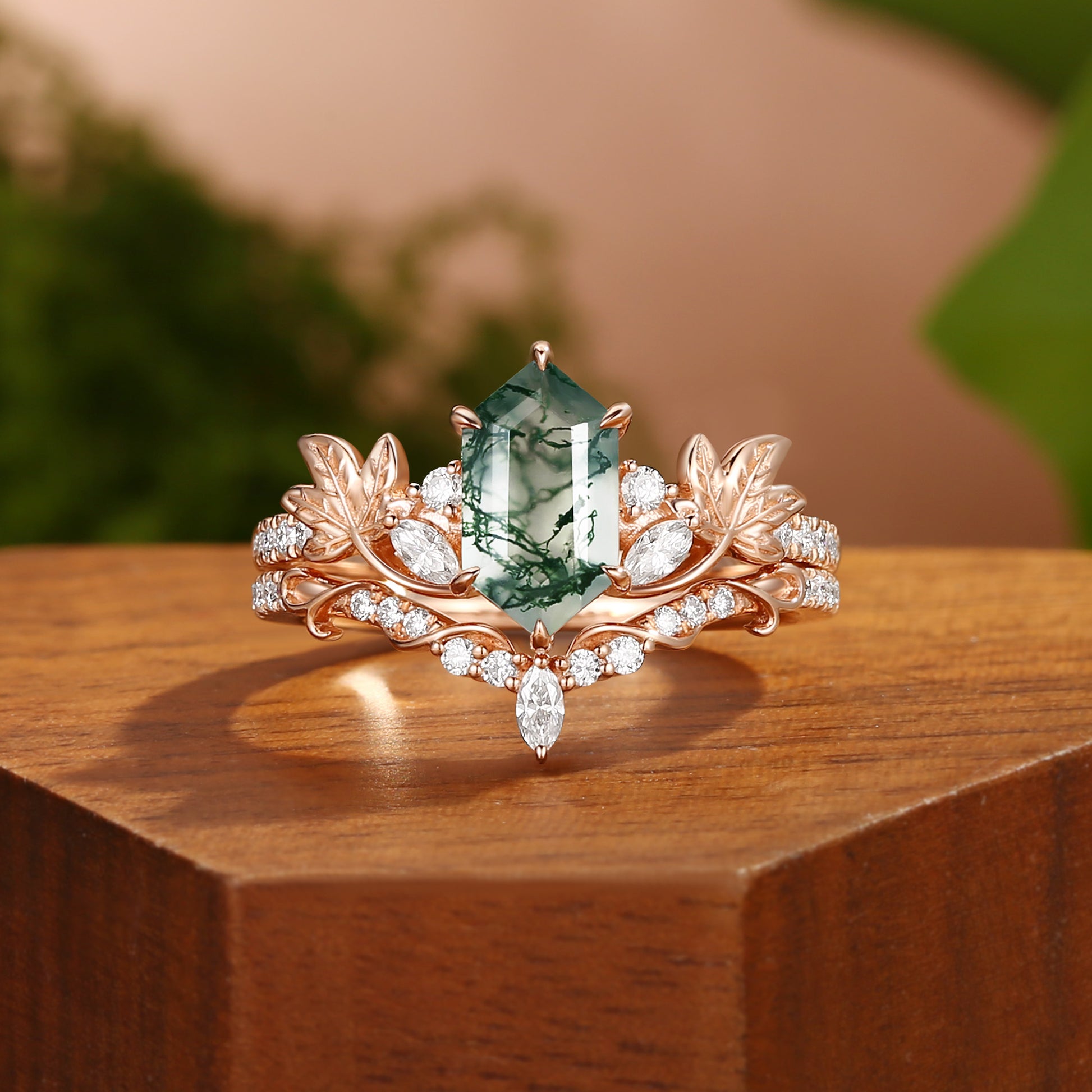 Grape Leaf Nature Inspired Hexagon Cut Moss Agate Engagement Ring Set 2Pcs