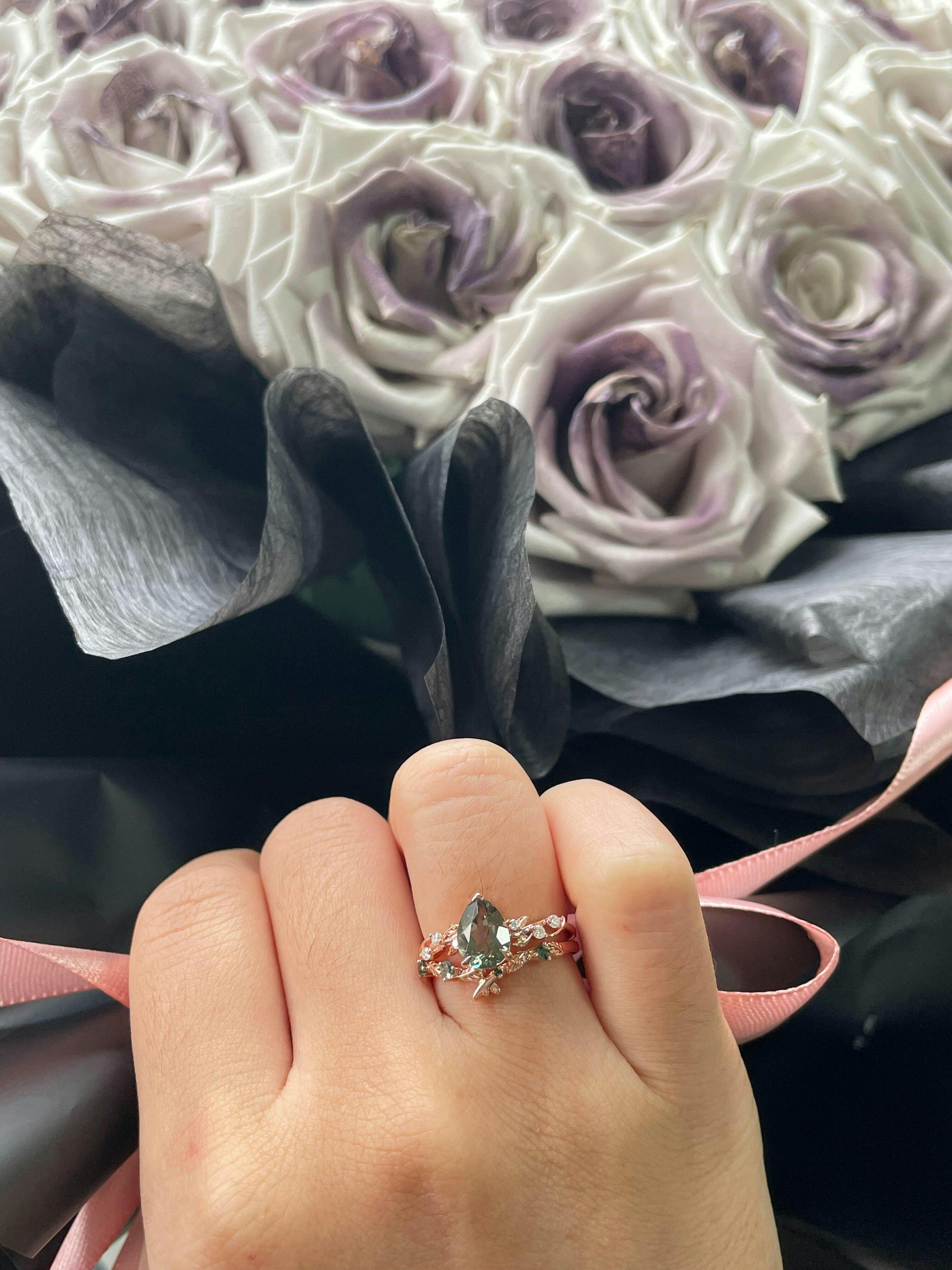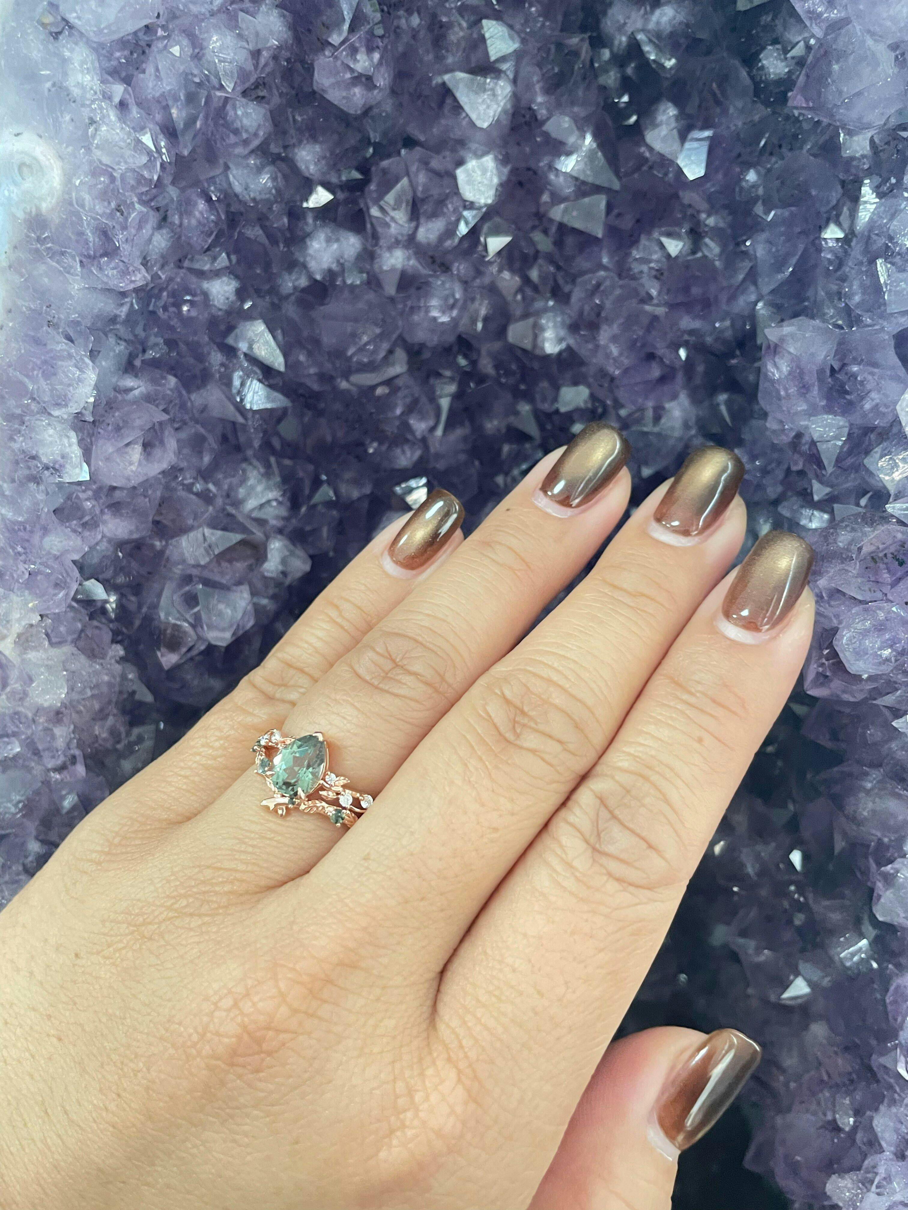 The statement ring stars a pear-cut lab-grown green sapphire—deep as an emerald forest, glowing with fire that dances like sunlight through oak branches. Its curves whisper promises of “forever,” while the band, carved with delicate leaf veins, feels like lace woven from moonbeams.