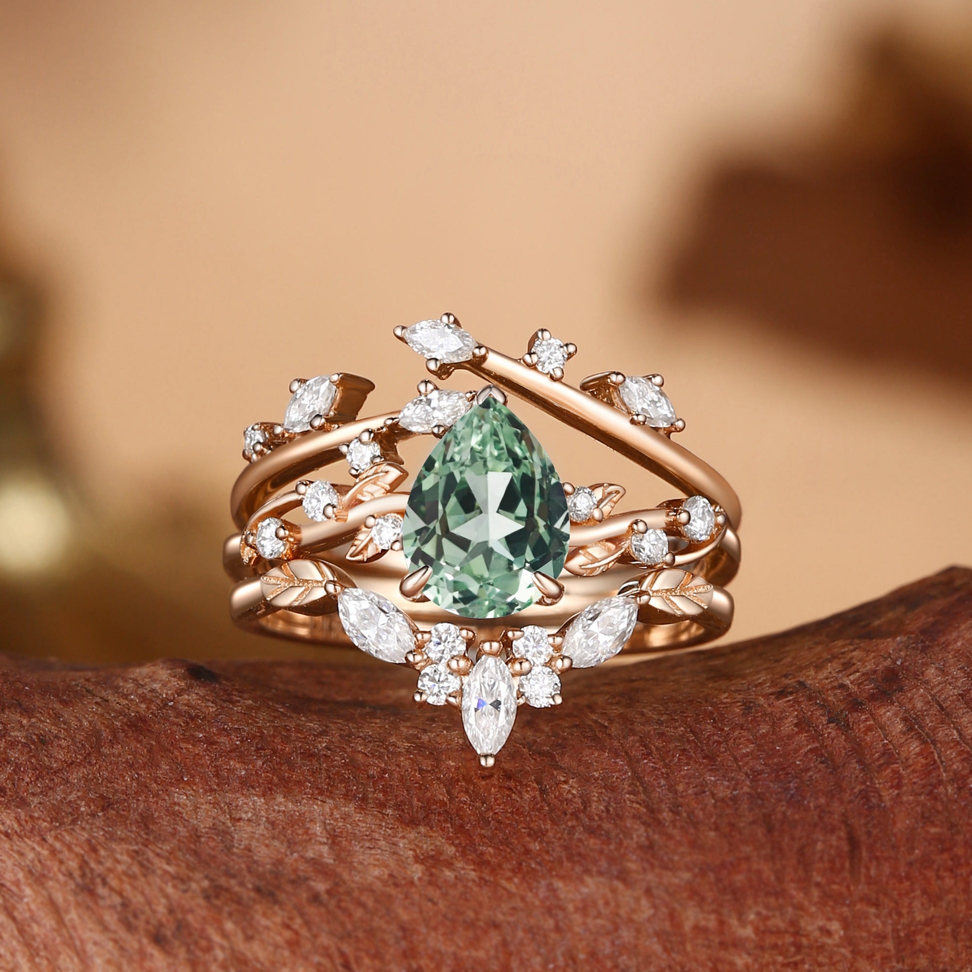 Pear Cut Green Sapphire Cluster Leafy Engagement Ring Set 3pcs - Clarissa