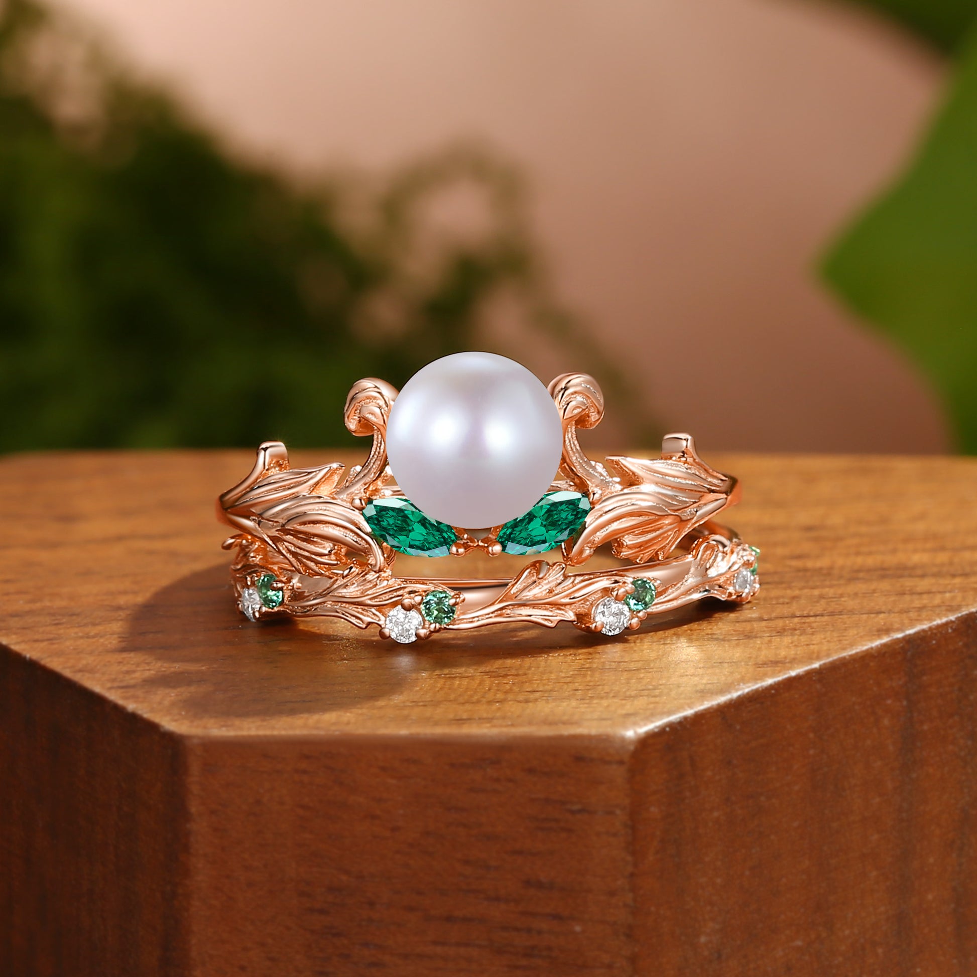 Bianca - Unique Round Cut Pearl Acanthus Inspired Art Deco Bridal Set 2pcs