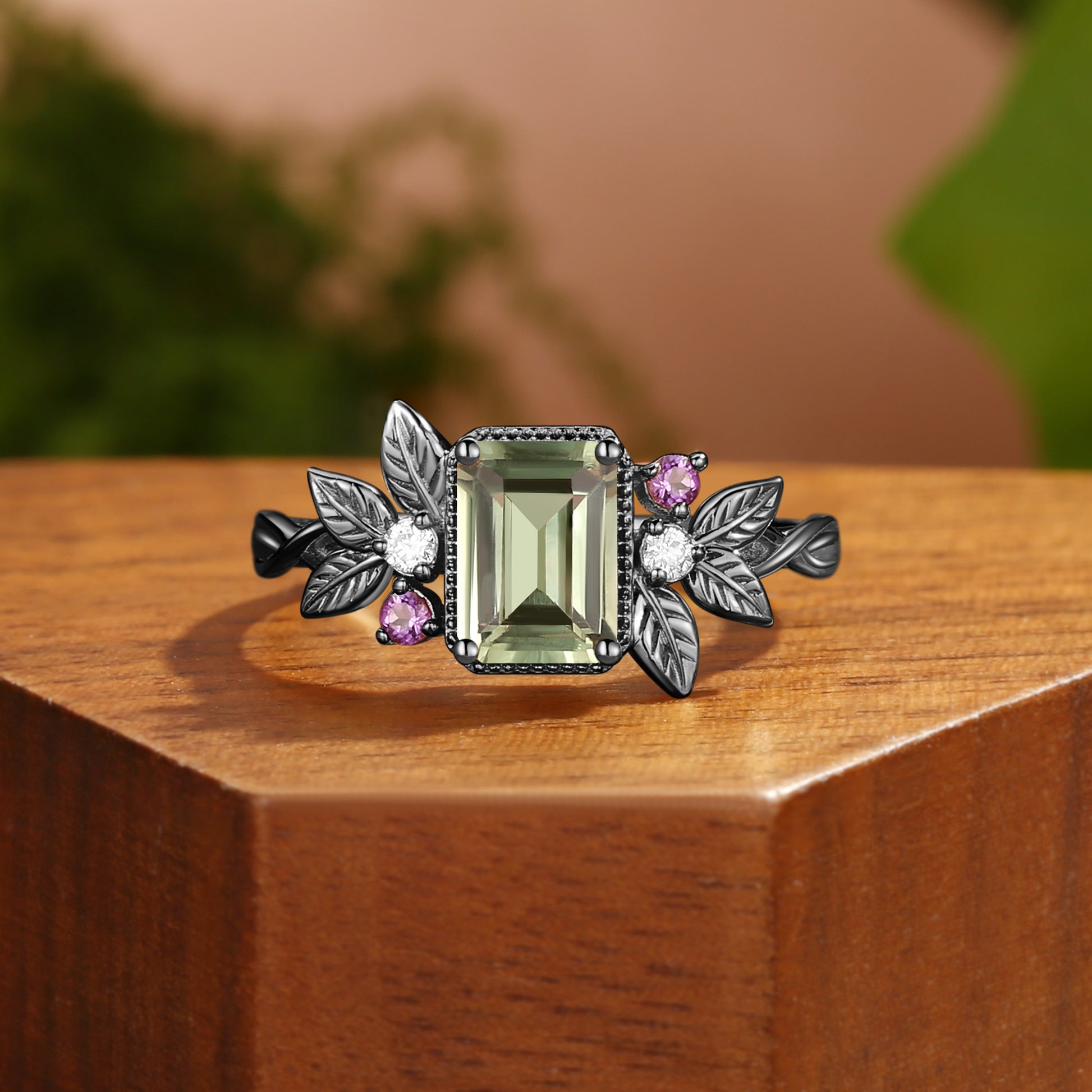 A Emerald Cut Green Sapphire Nature Inspired Leafy Engagement Ring, symbolizing fidelity, rests within intertwined gold foliage. Scattered Green Sapphire, like dewdrops on leaves, celebrate love's sparkling moments along the organic band.